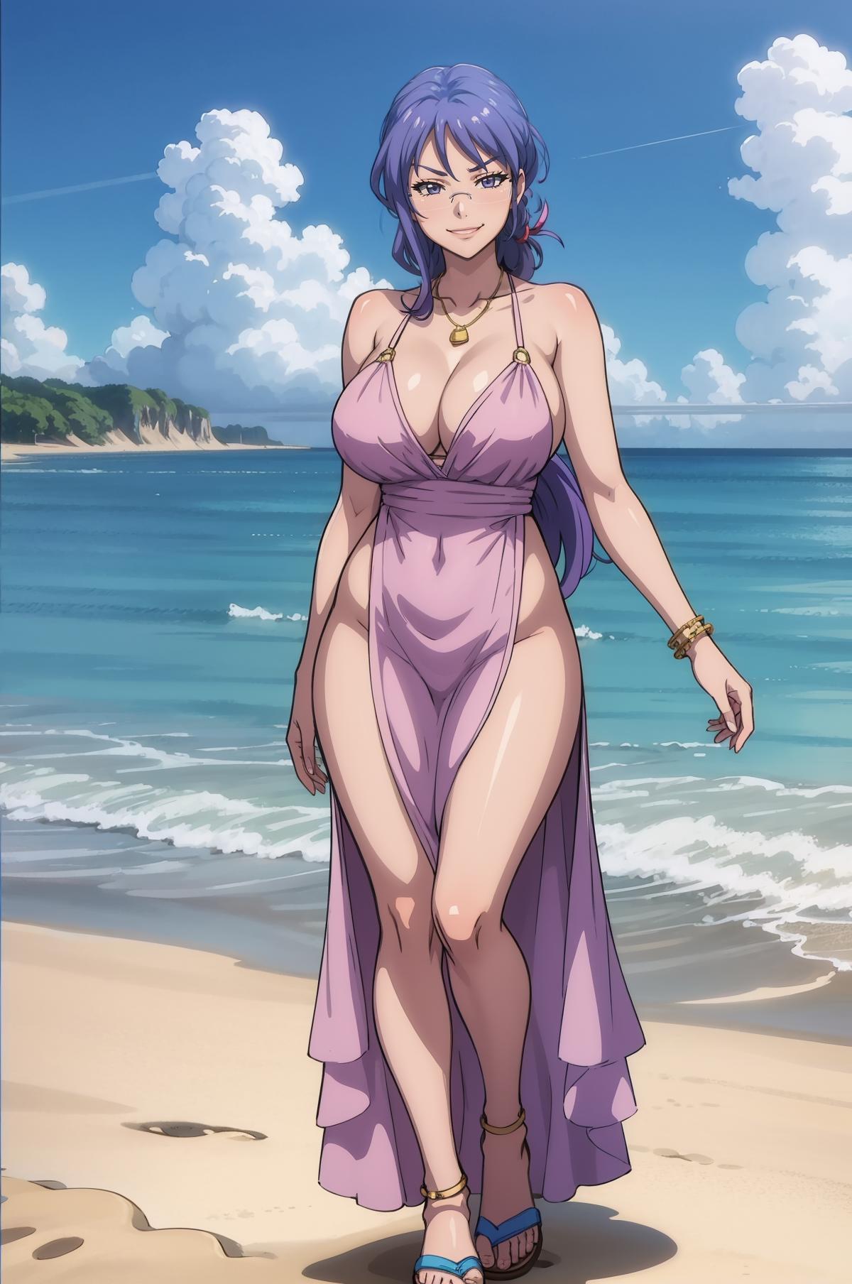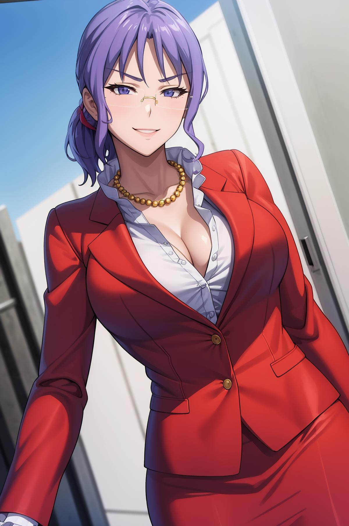 (business suit, red suit), pencil skirt, black skirt, white shirt, shirt frills, gold pearl necklace