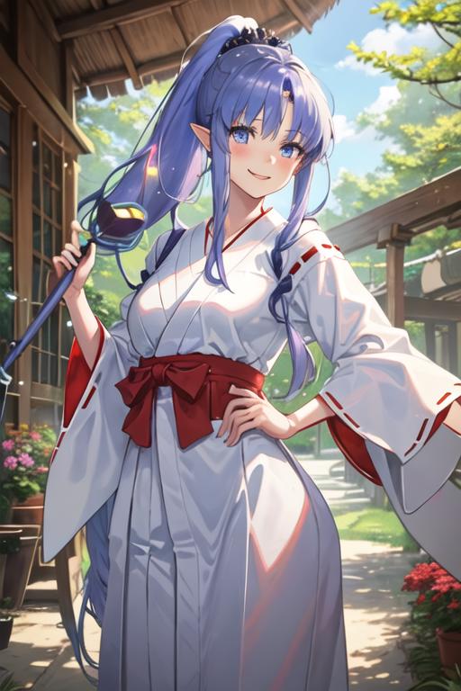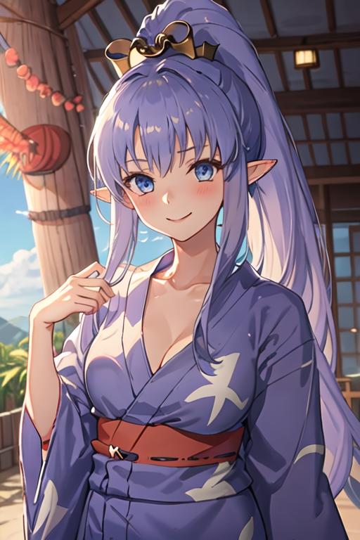 The trigger word is medea_lily_fgo, and the recommended tags are best quality, masterpiece, highres, solo, {medea_lily_fgo:1.15}, long_hair, pointy_ears, blue_eyes, ponytail, purple_hair, smile, breasts, blush, blue_hair, very_long_hair, collarbone, bangs, hair_ornament.