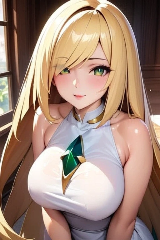 lusamine_a_xl, lusamine (pokemon), blonde hair, long hair, very long hair, large breasts, green eyes, hair over one eye,