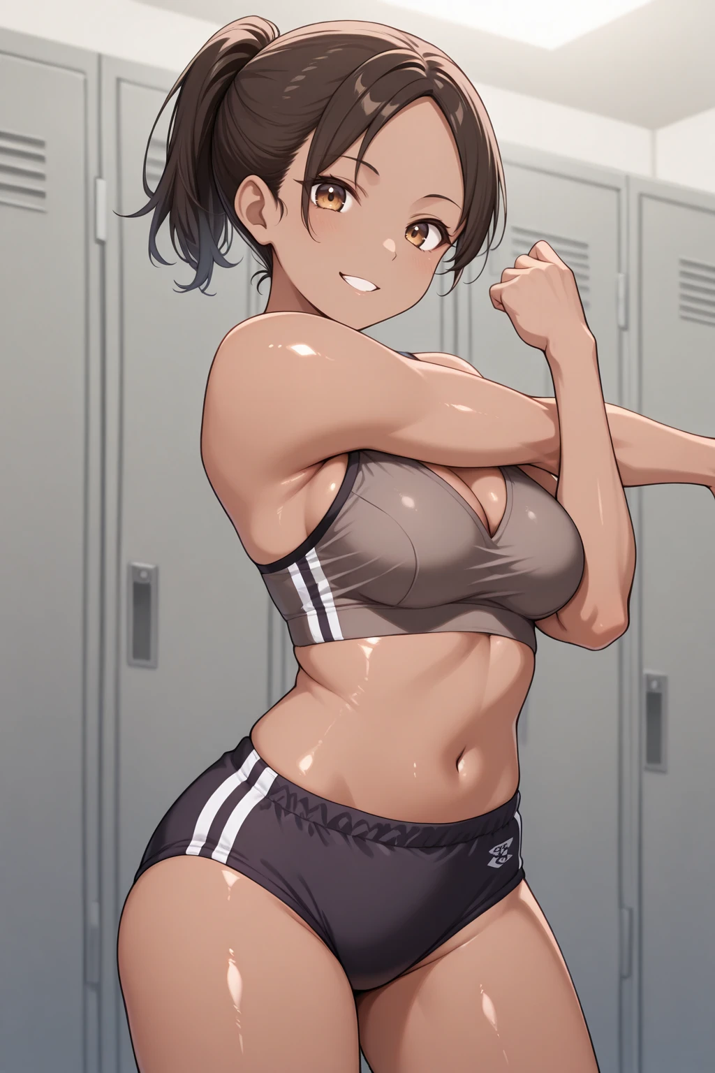 Appearance : sh3va, ??????????????, dark-skinned female, brown eyes, brown hair, medium hair, ponytail