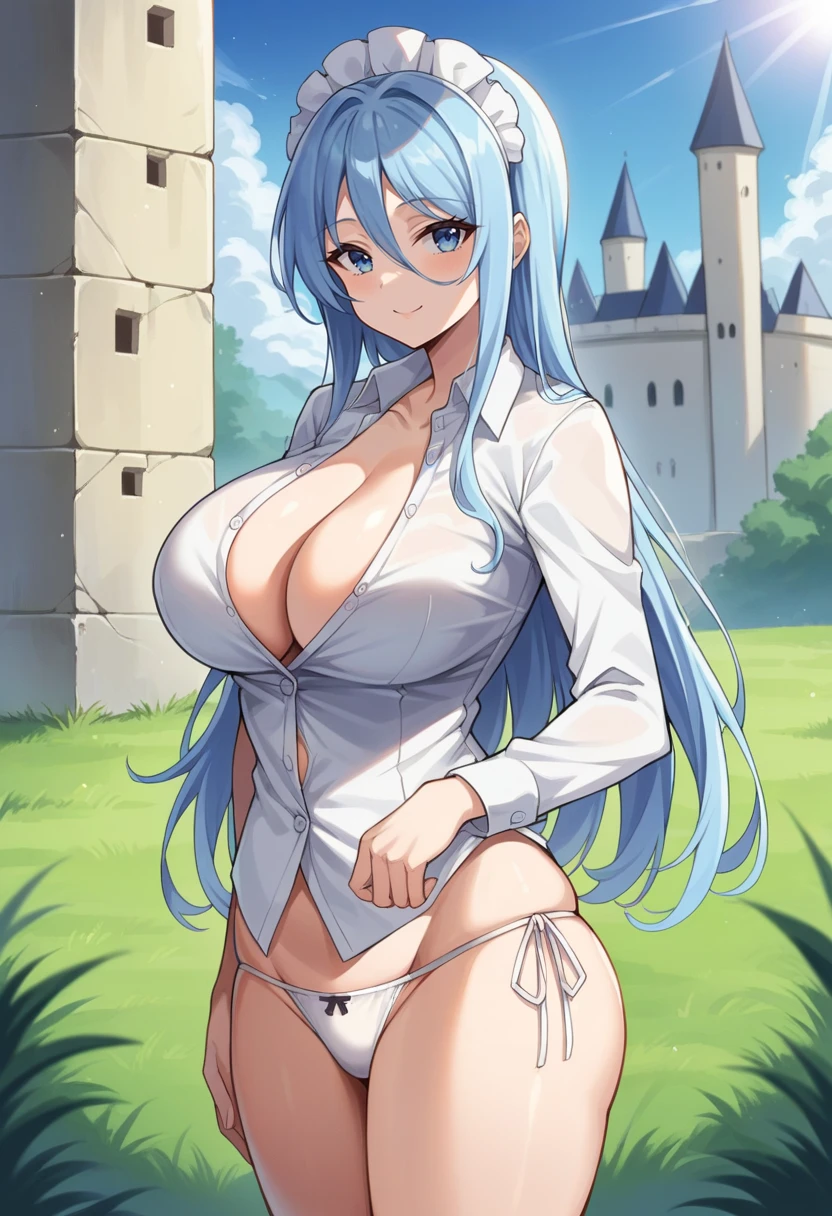 Outfit 2: ["sylpha_shirt, blue eyes,light blue hair, long hair, hair between eyes,white headdress, white shirt, collared shirt, cleavage, buttons, open shirt, white panties, side-tie panties"]