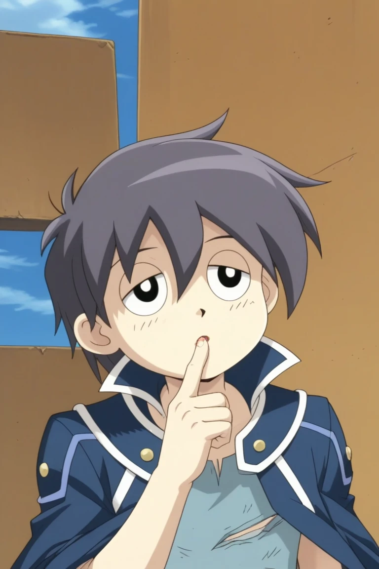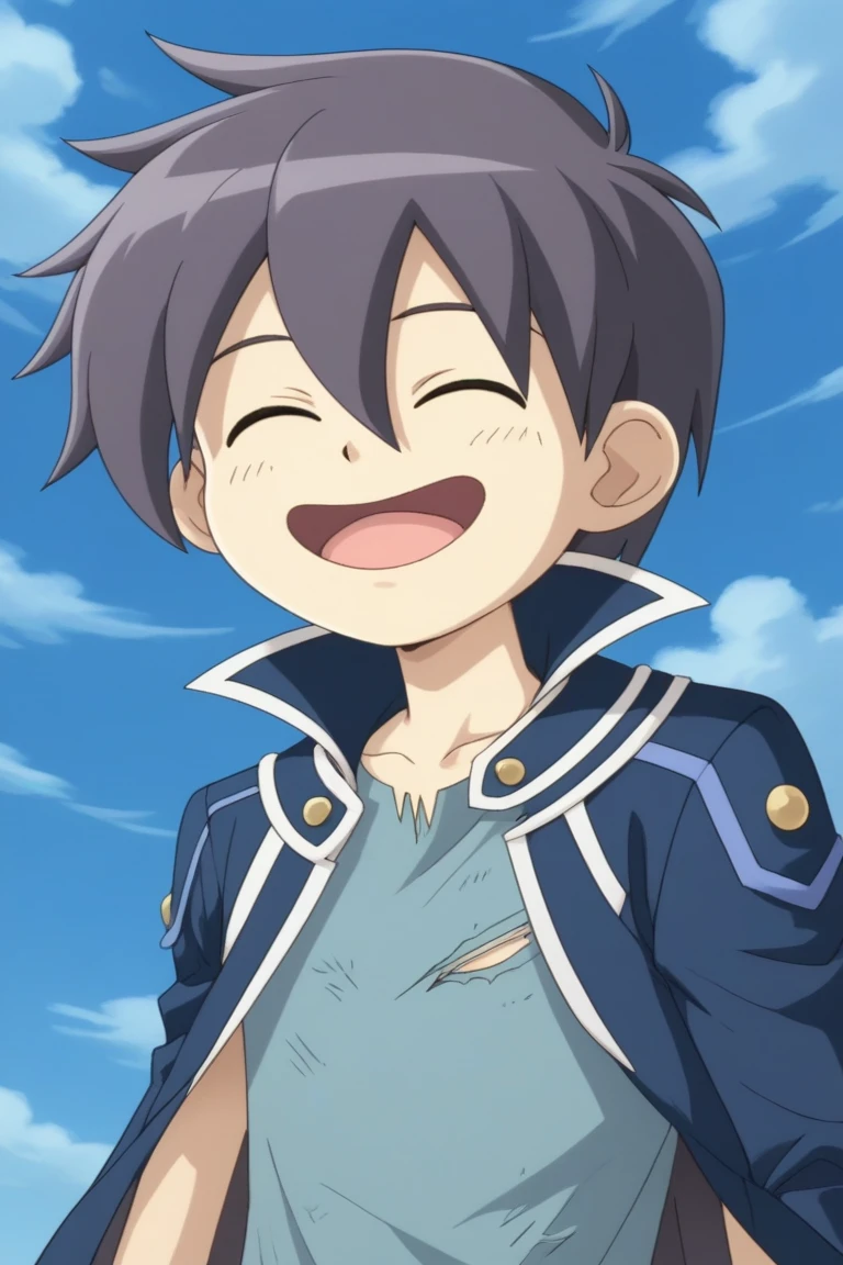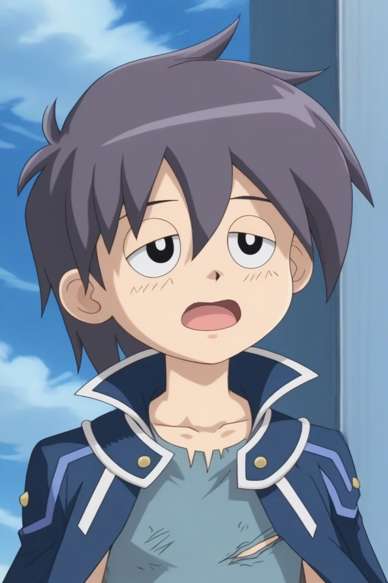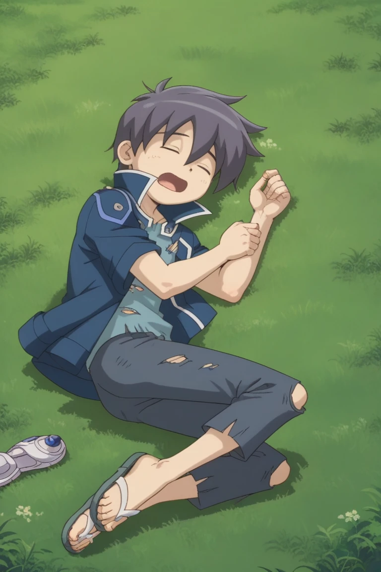blue shirt, grey pants, torn clothes, jacket on shoulders,sandals