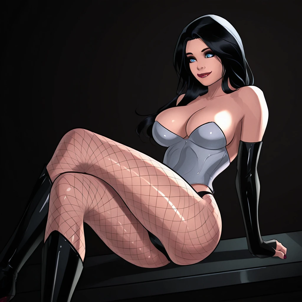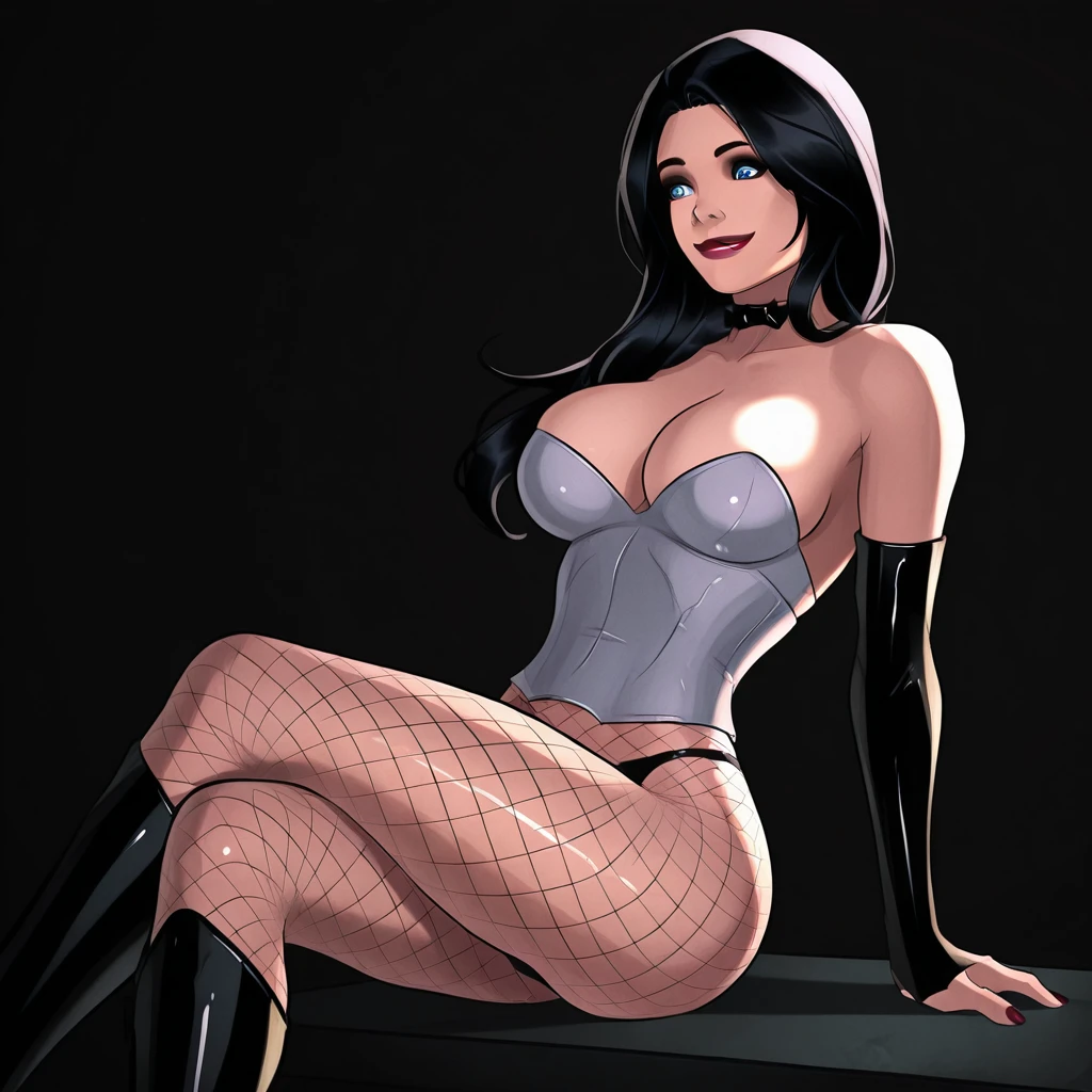 zatanna, black hair, long hair, dark red lips, blue eyes, black latex knee boots, stiletto heeled, fishnet pantyhose, black latex panties, white corset top, large round , cleavage, black latex fingerless elbow gloves
