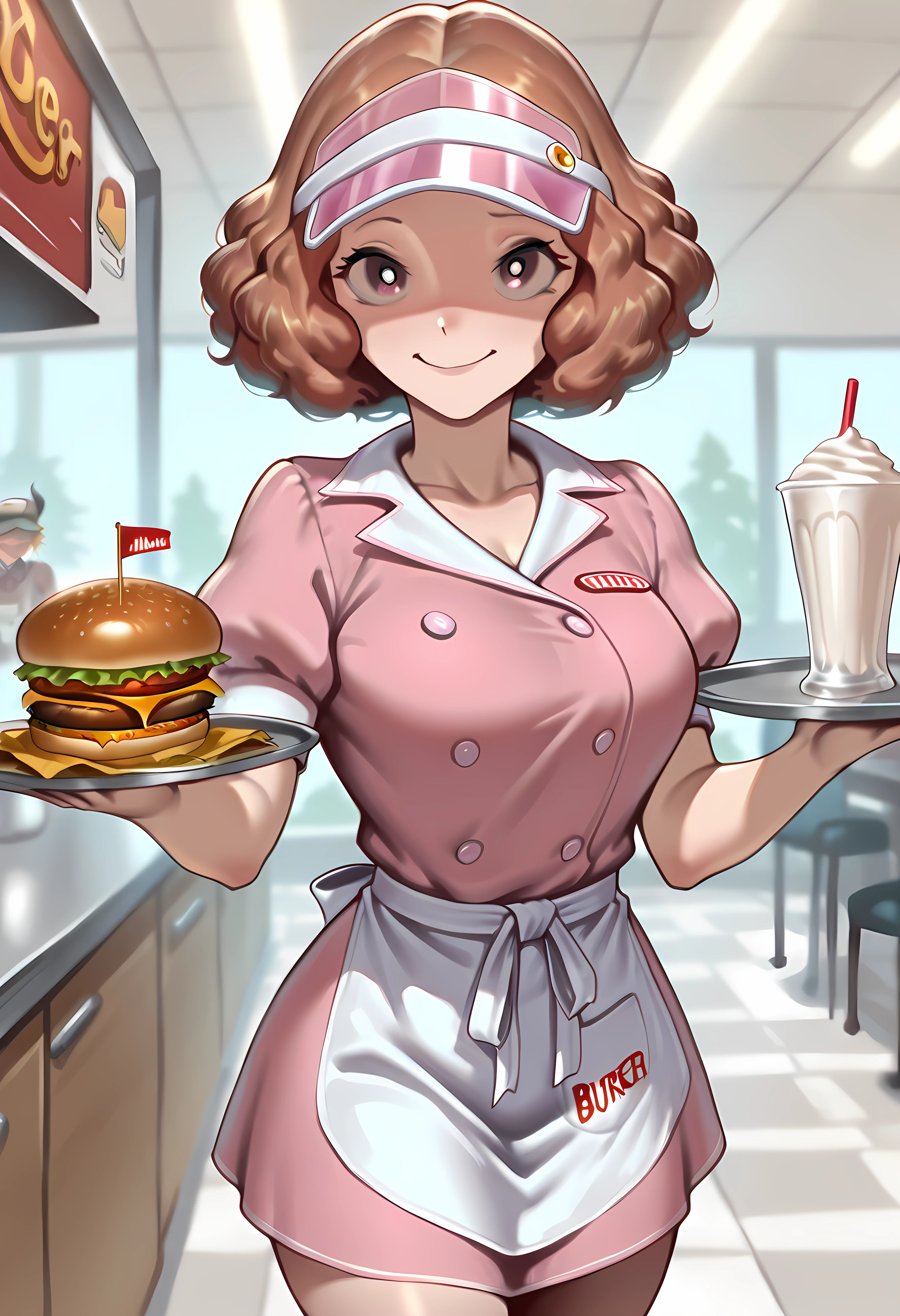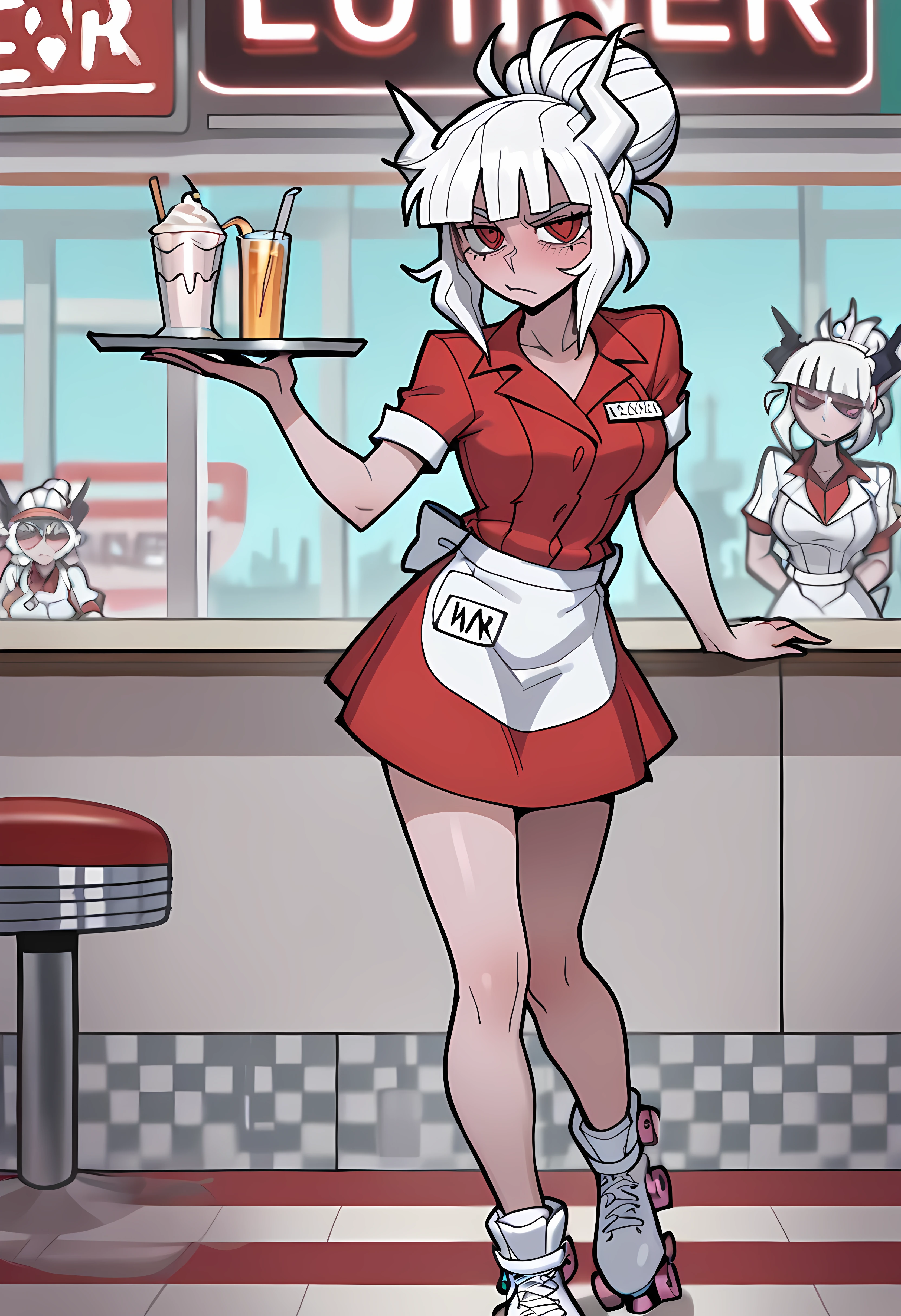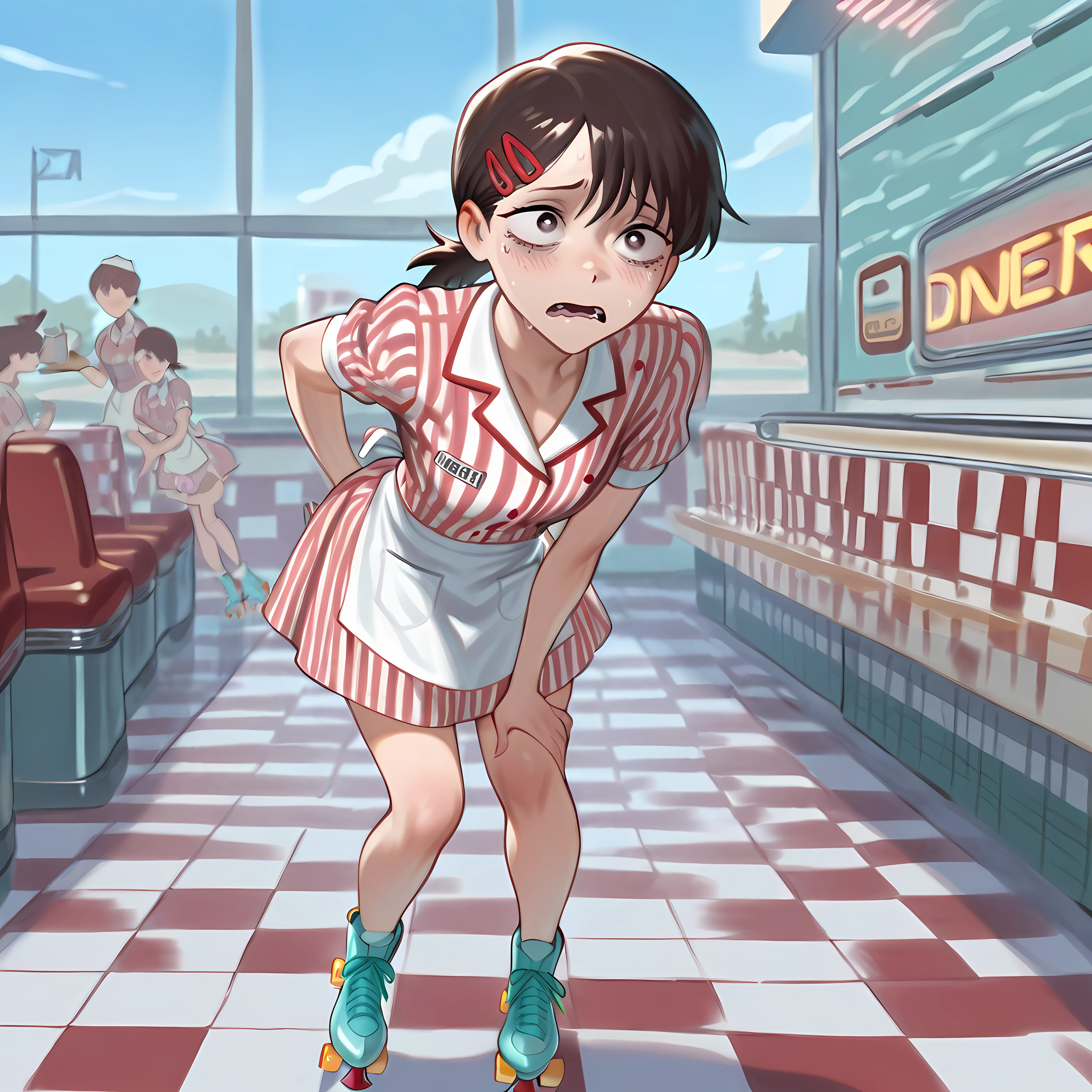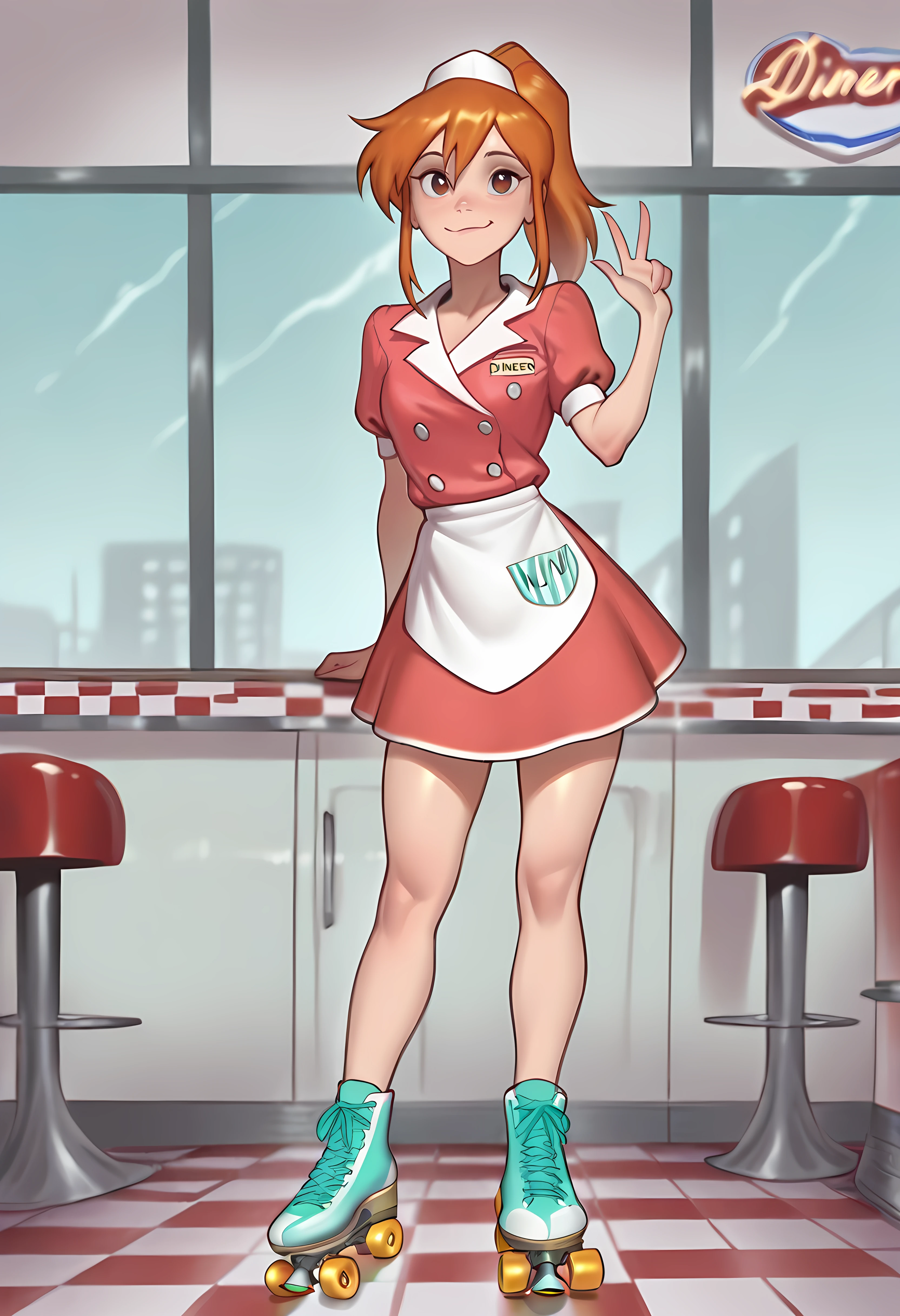 Additional: waitress, waist apron, collared dress, buttoned, name tag, hat, roller skates