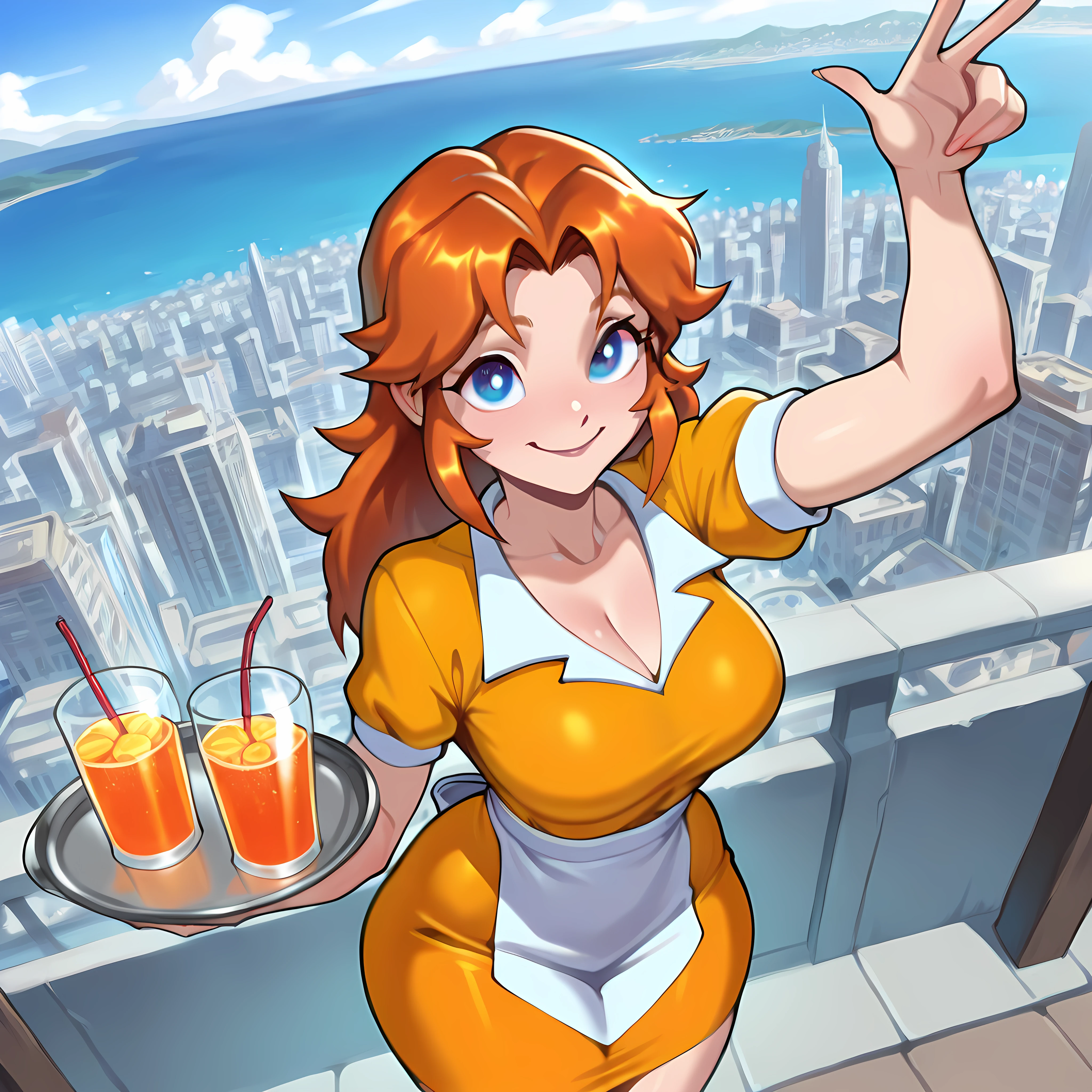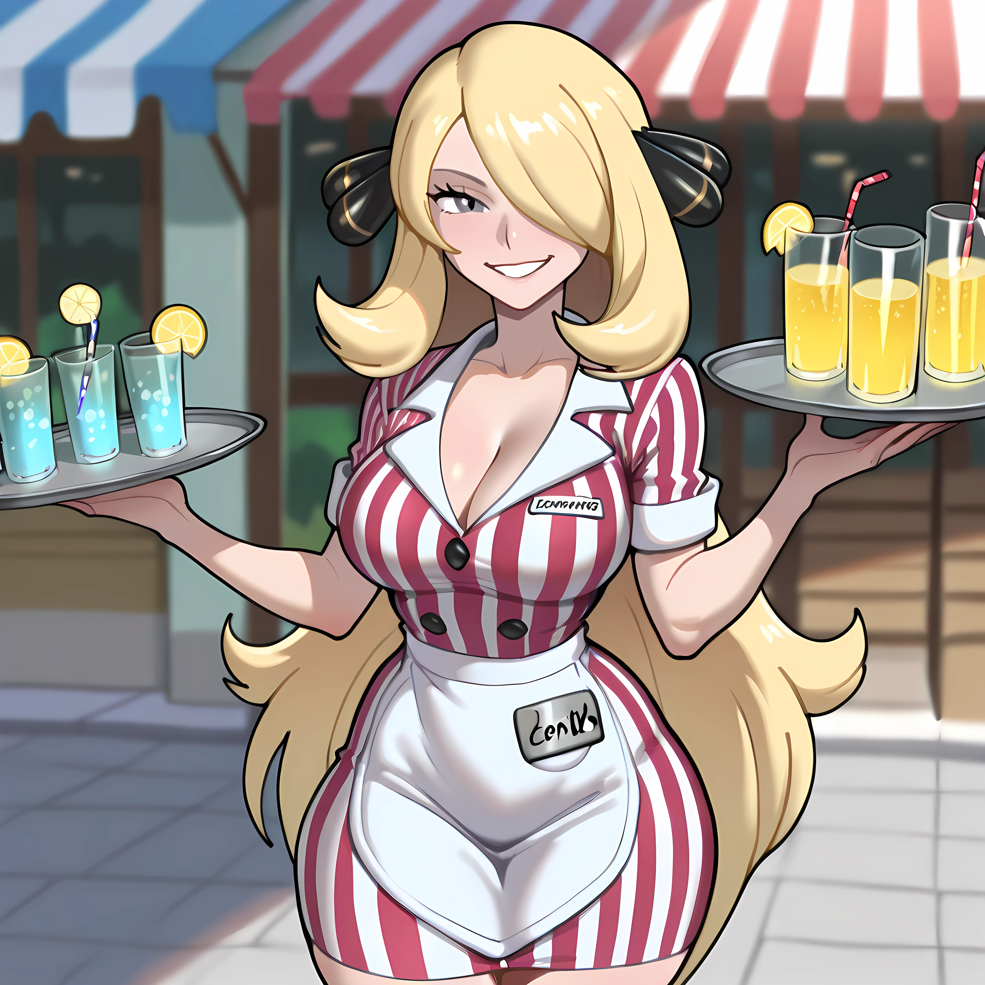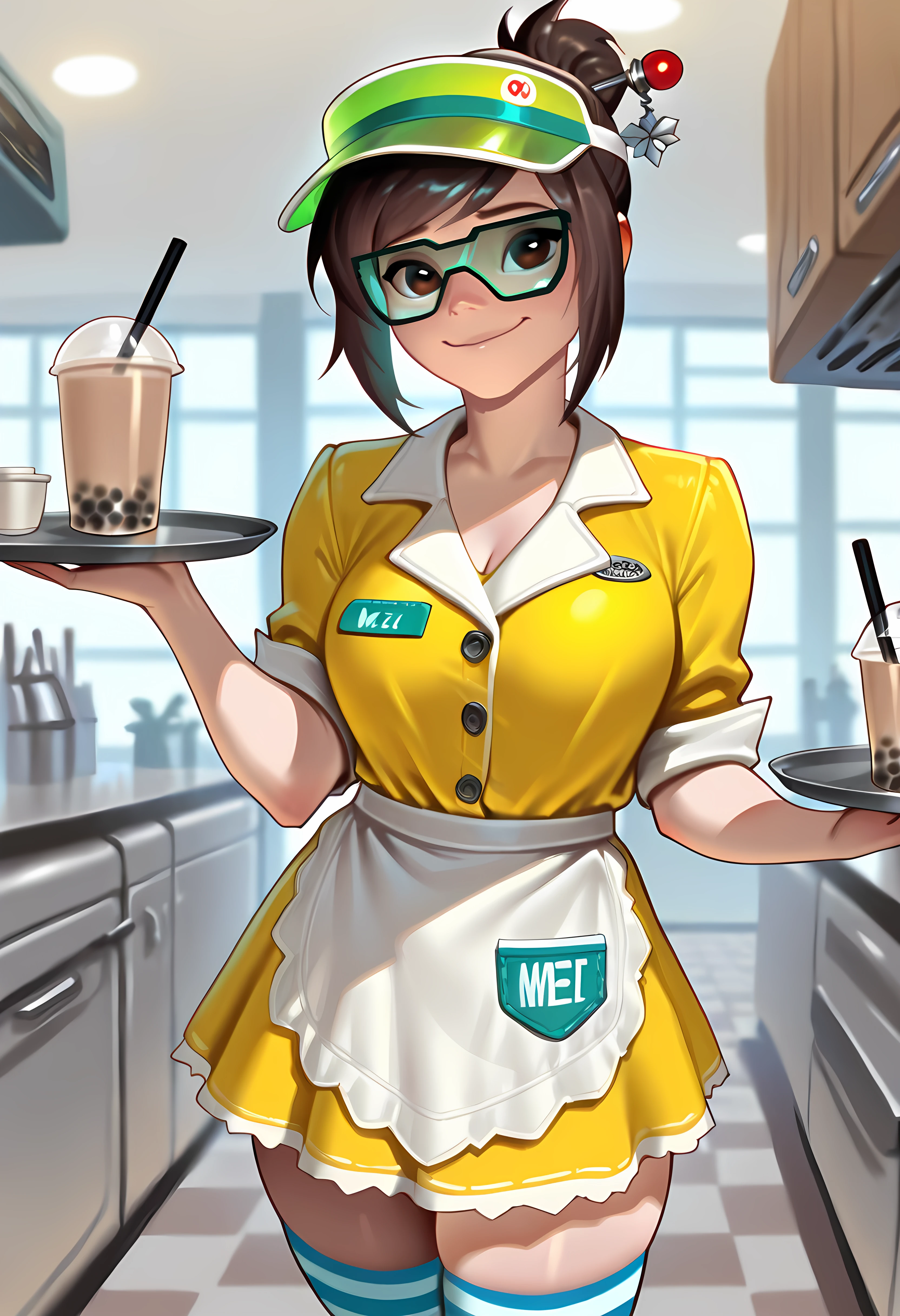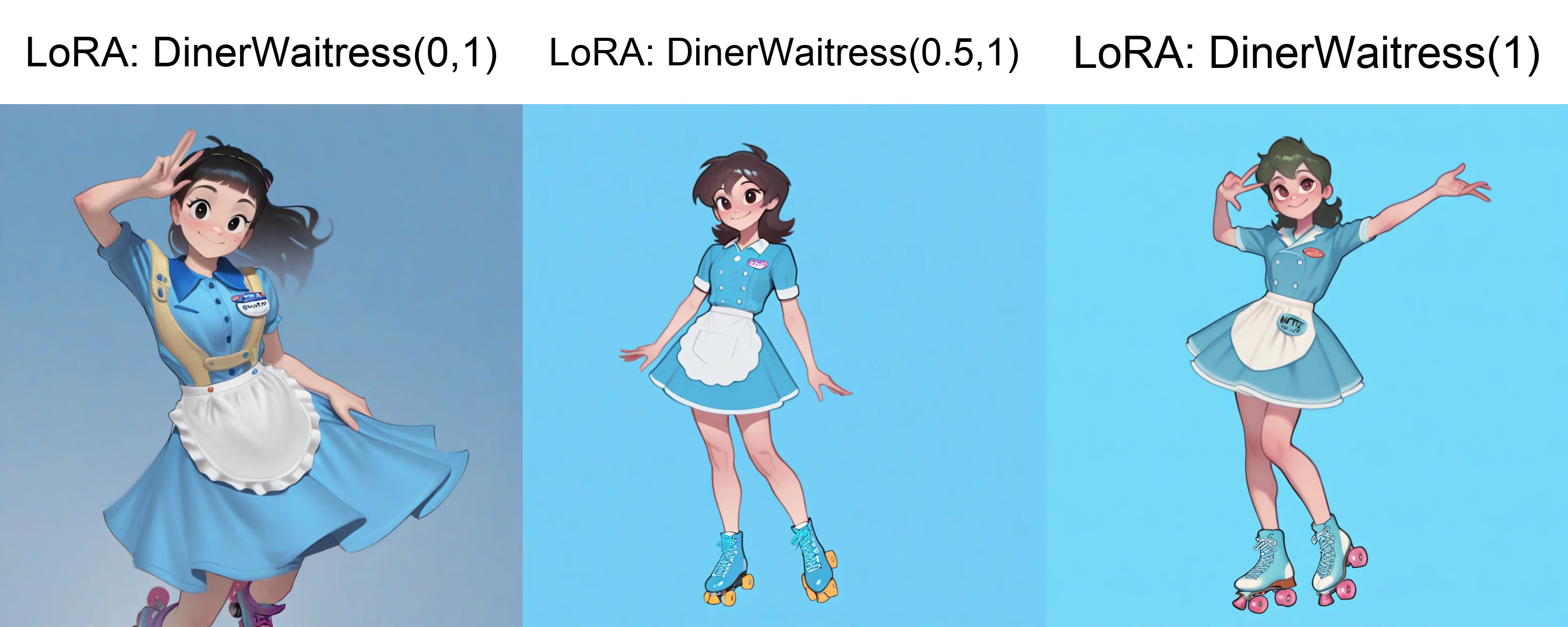 Additional: waitress, waist apron, collared dress, buttoned, name tag, hat, roller skates