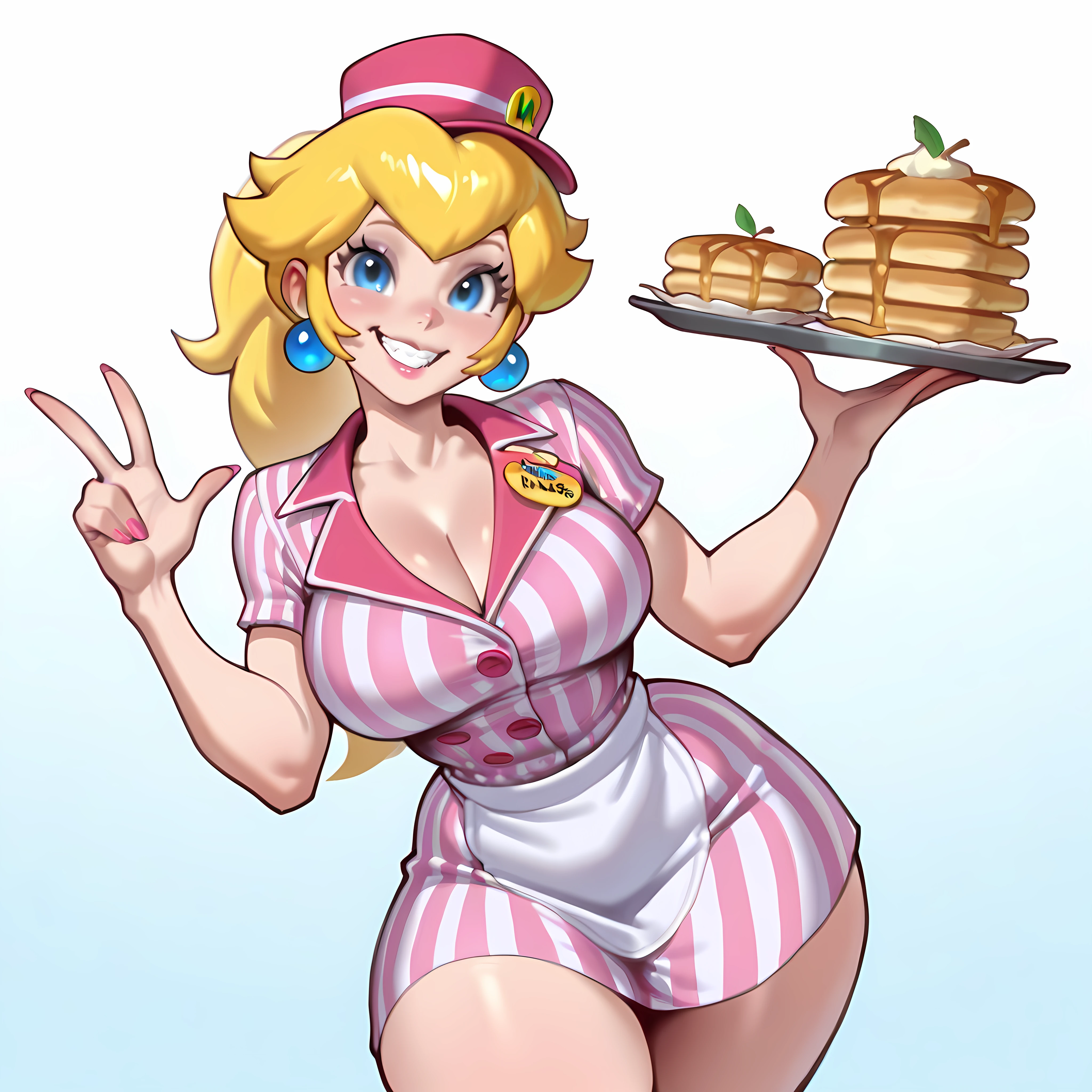waitress, waist apron, collared dress, buttoned, name tag, hat, roller skates