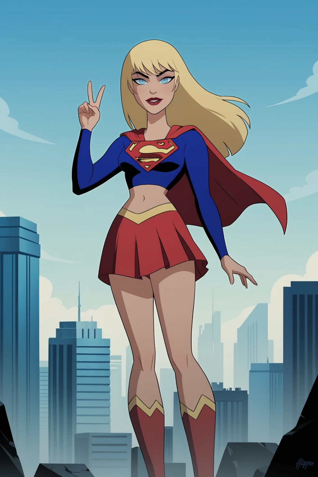 Supergirl/Powergirl from "Justice League Unlimited". I recommend using 0.7 strength but anywhere from 0.7 to 1 should be fine. All images are made using the AutismMix_Confetti model found here on CivitAI. There are 3 different outfits that this Lora was trained on, her original outfit with the white shirt and gloves, the powergirl outfit, and her later outfit with the blue shirt. Adding "retro artstyle" will give you a closer art style to the orginal show, and on the flip side of that, adding "retro artstyle" to the NEGATIVE prompt will make it easier to use a different artstyle.