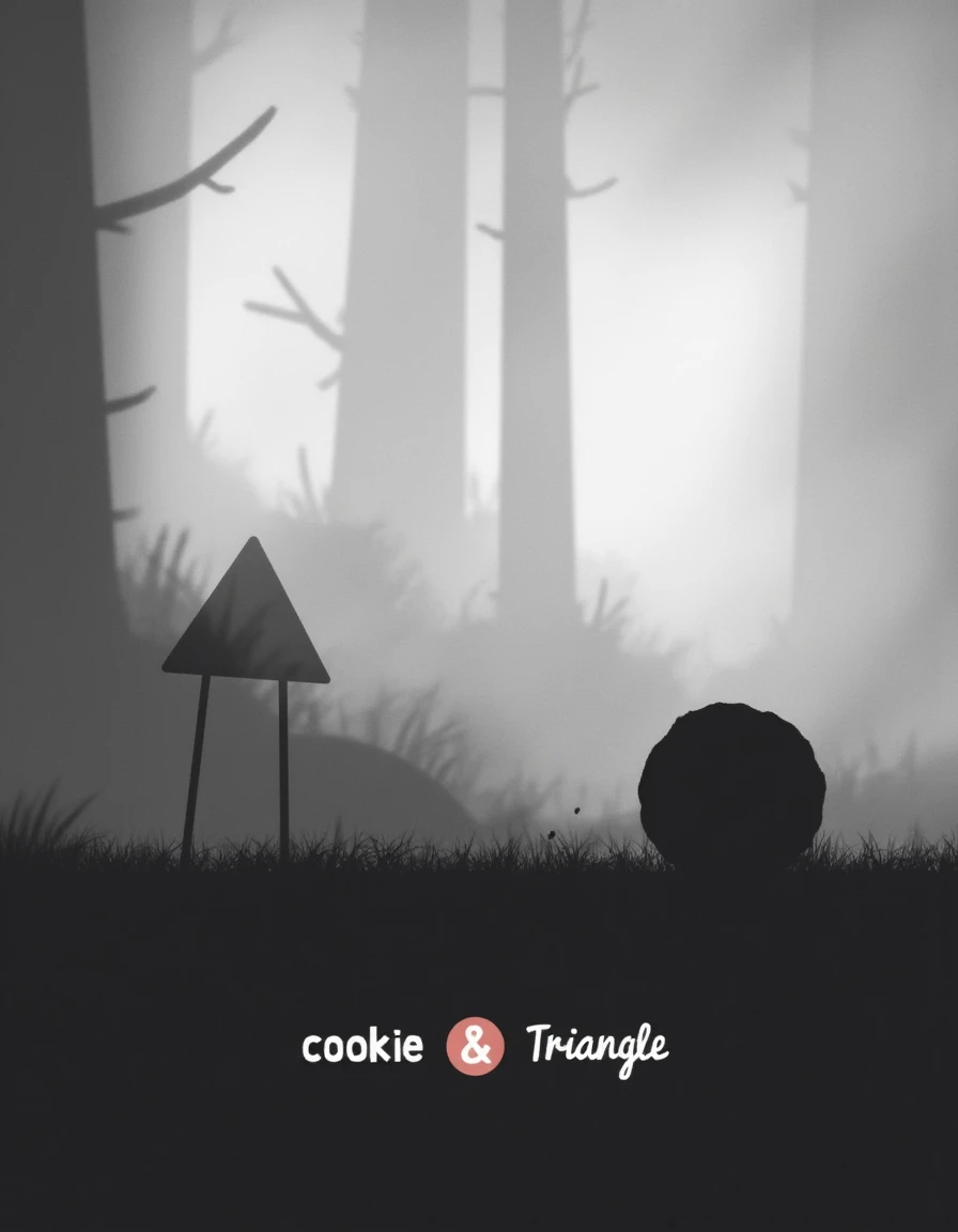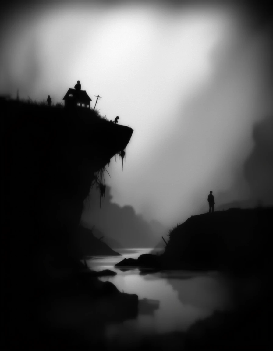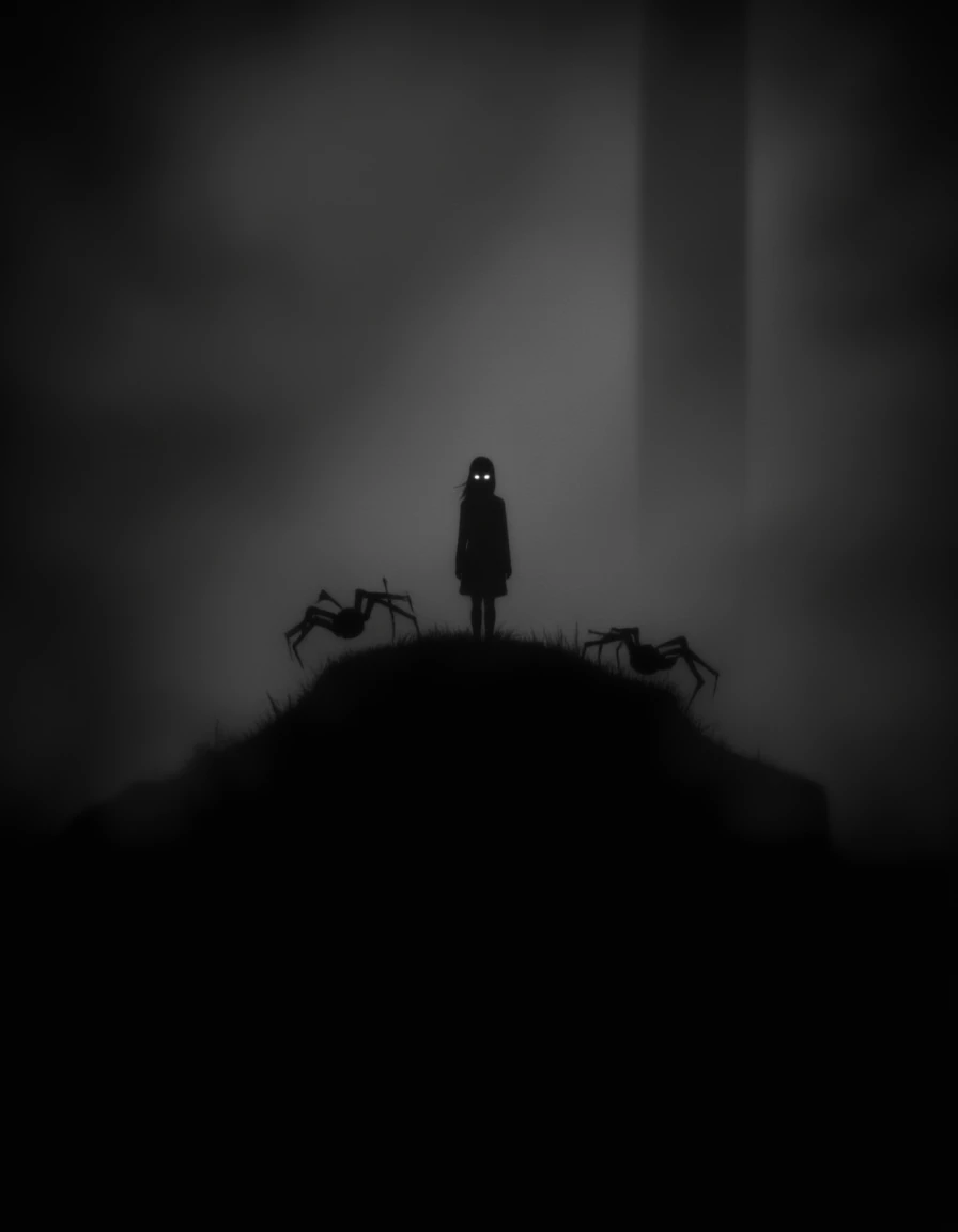• an illustration of a boy leaping across a dark, shadowy chasm with glowing eyes against a misty gray background, surrounded by silhouetted grass and sharply pointed branches in the style of limbo