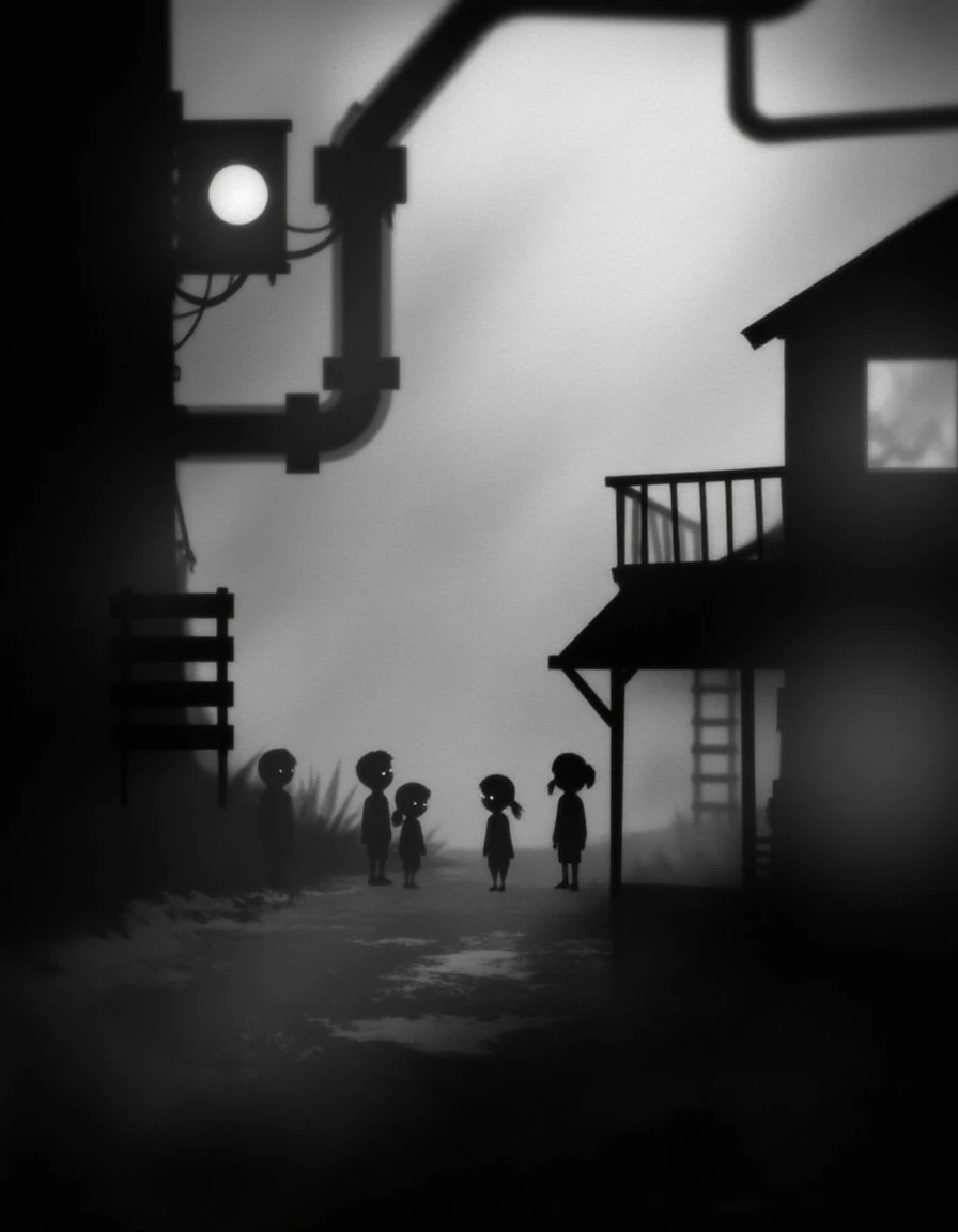 • an illustration of a boy with glowing eyes standing atop a hill, surrounded by sprawling, twisted leafless trees under a gradient of dark to light grey sky, with the shadows forming a menacing face below him with glowing white eyes and the word "LIMBO" centered below in bold letters in the style of limbo