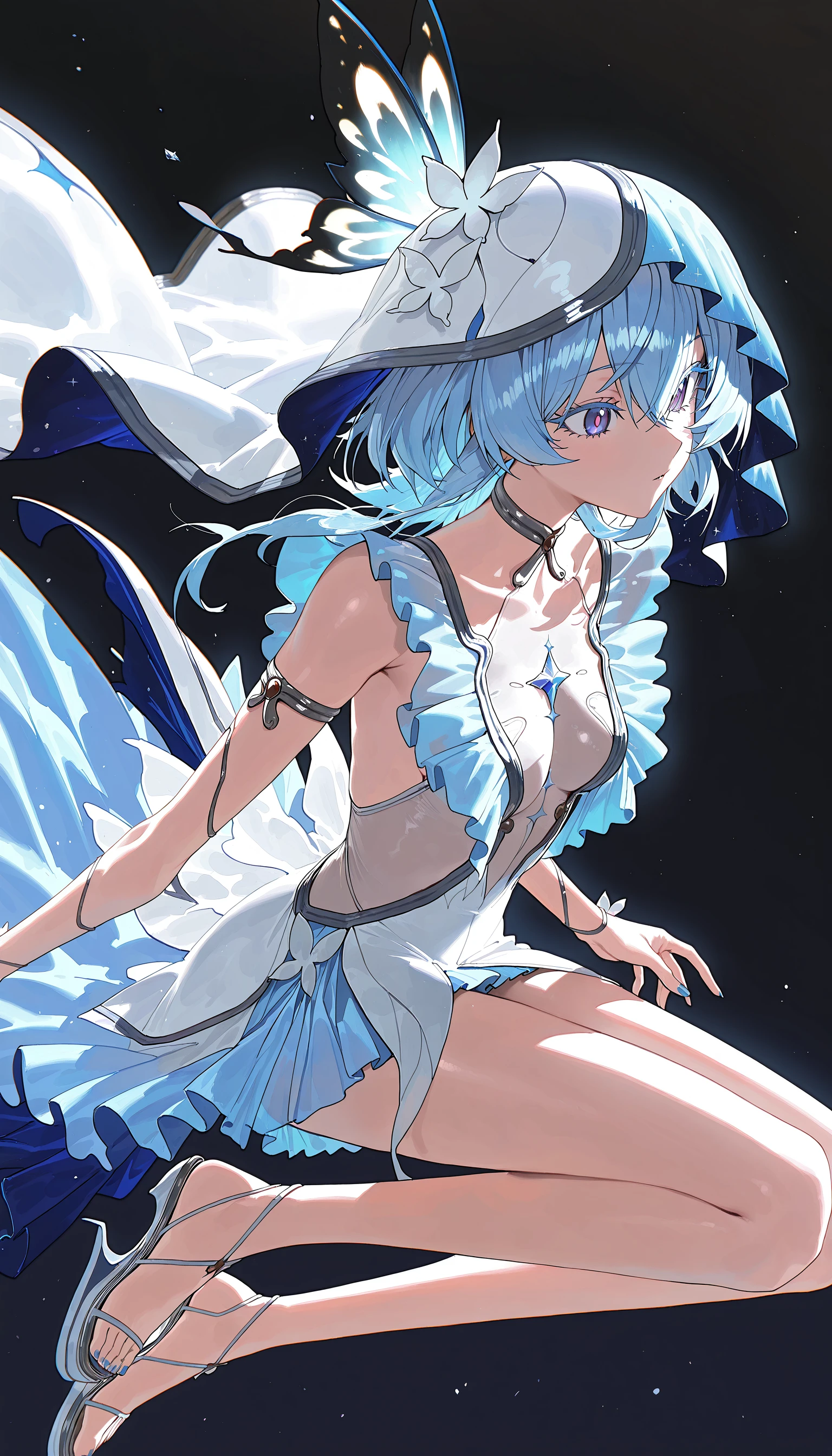 purple eyes, bright_pupils, blue hair , blue eyelashes ,Outfits: