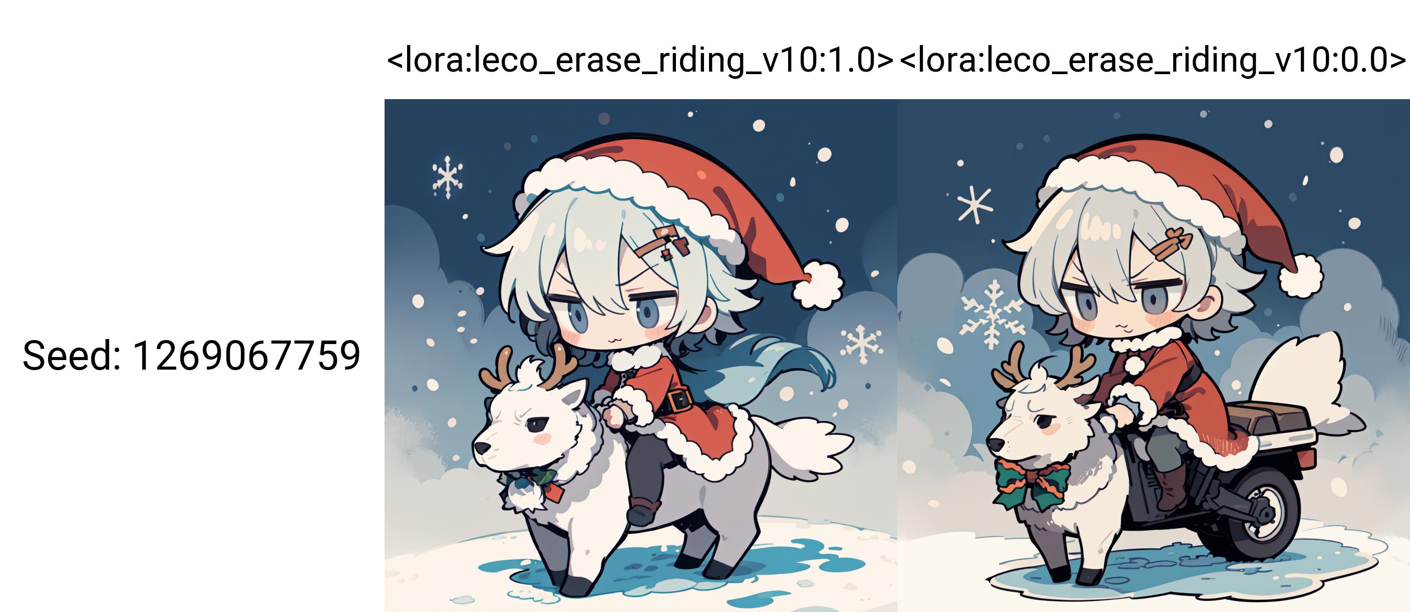 civitaiには「riding on a」というLoRAが以前からあり、私もこれを愛用していましたが、若干画風への影響があったため、LECOで作成しました。