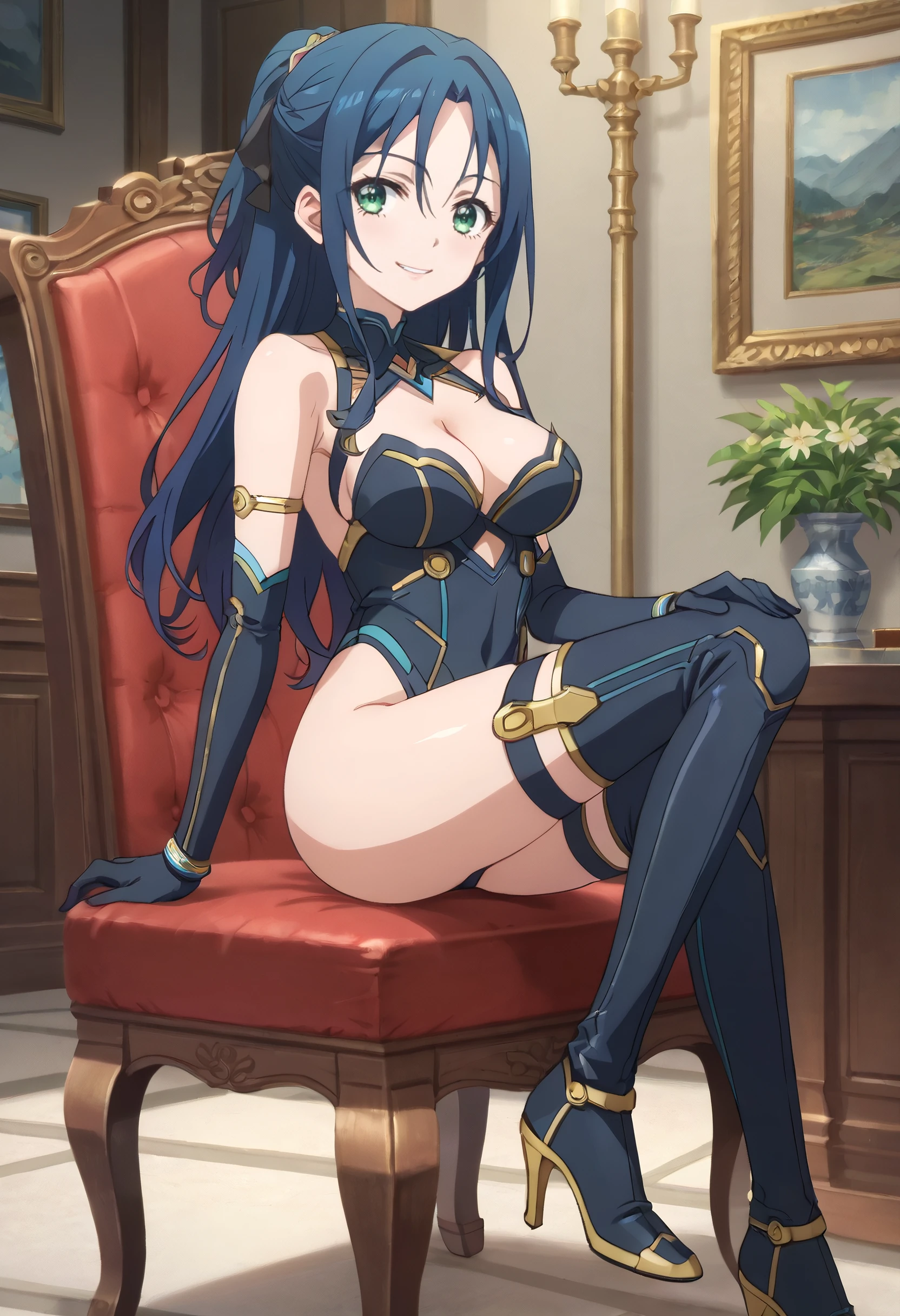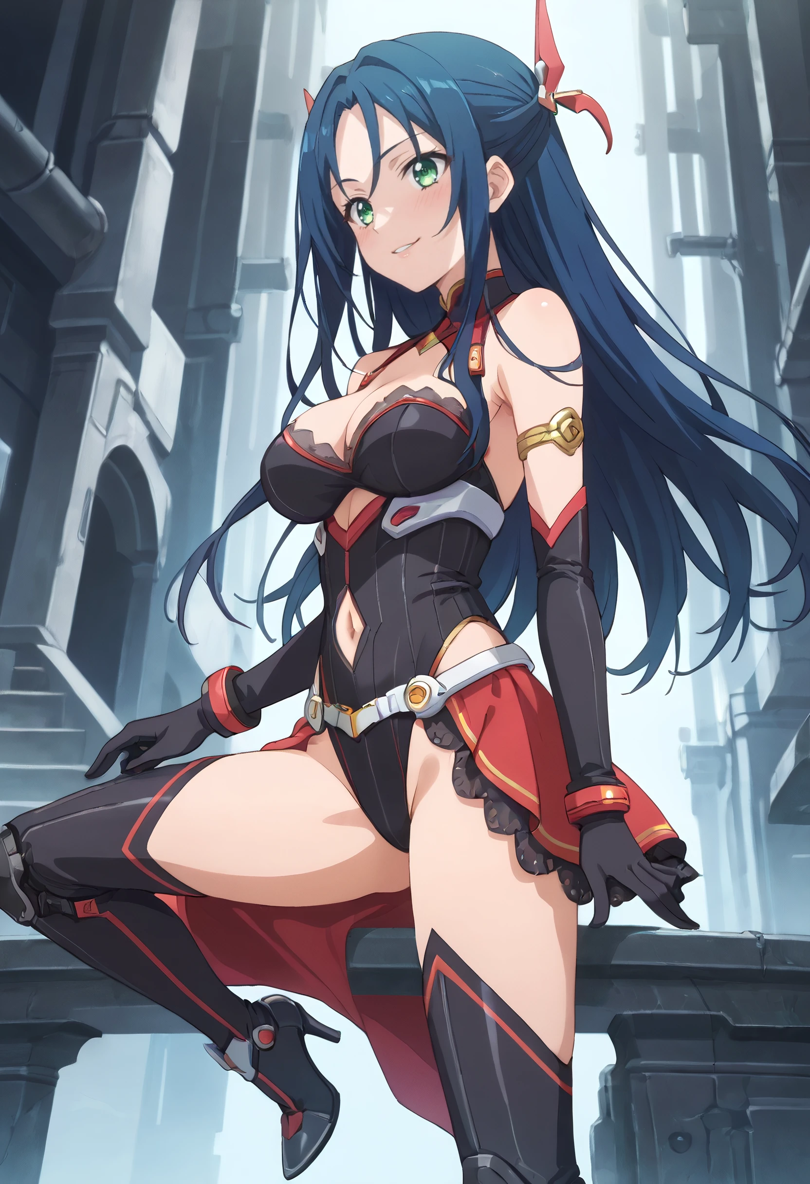 MiharuBodysuit, gloves, leotard, thighhighs, science fiction, cleavage, jewelry, panties, skirt, underwear, highleg, arm strap, armlet, high heels, boots, groin, highleg leotard, navel, thigh boots, elbow gloves, black leotard,