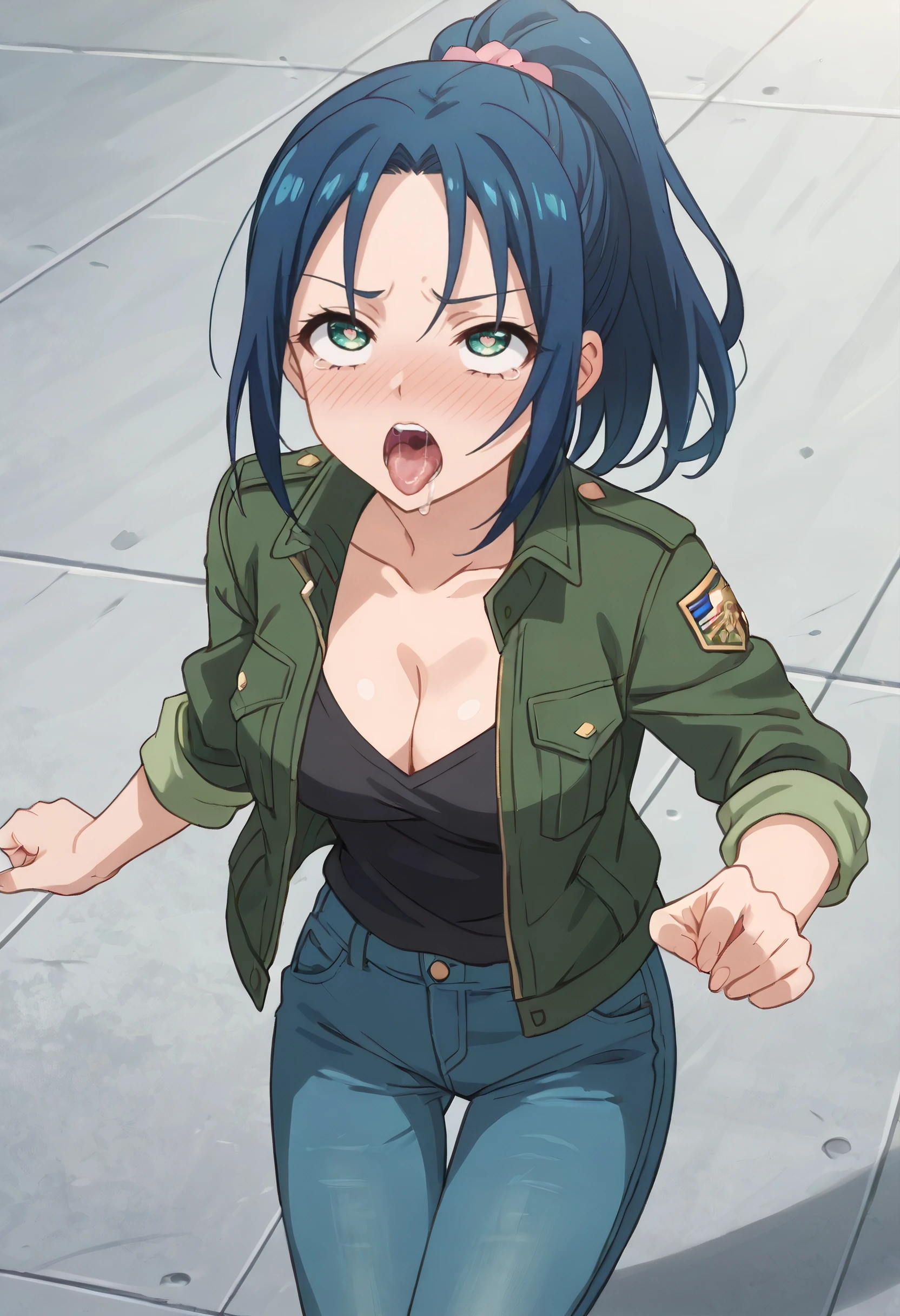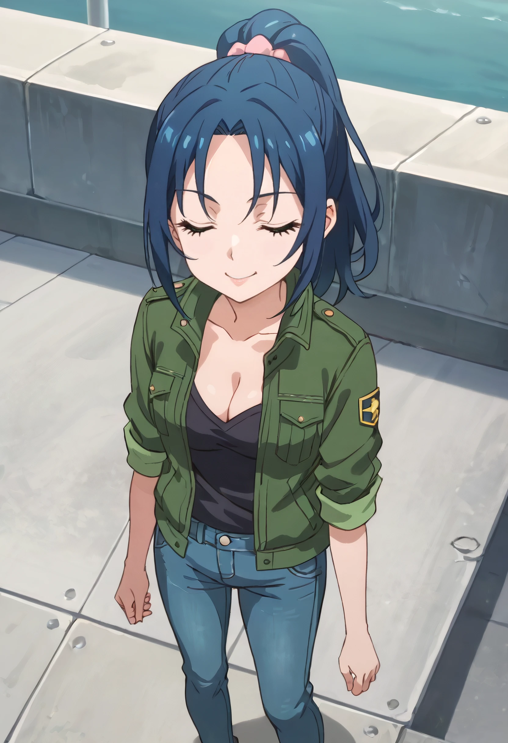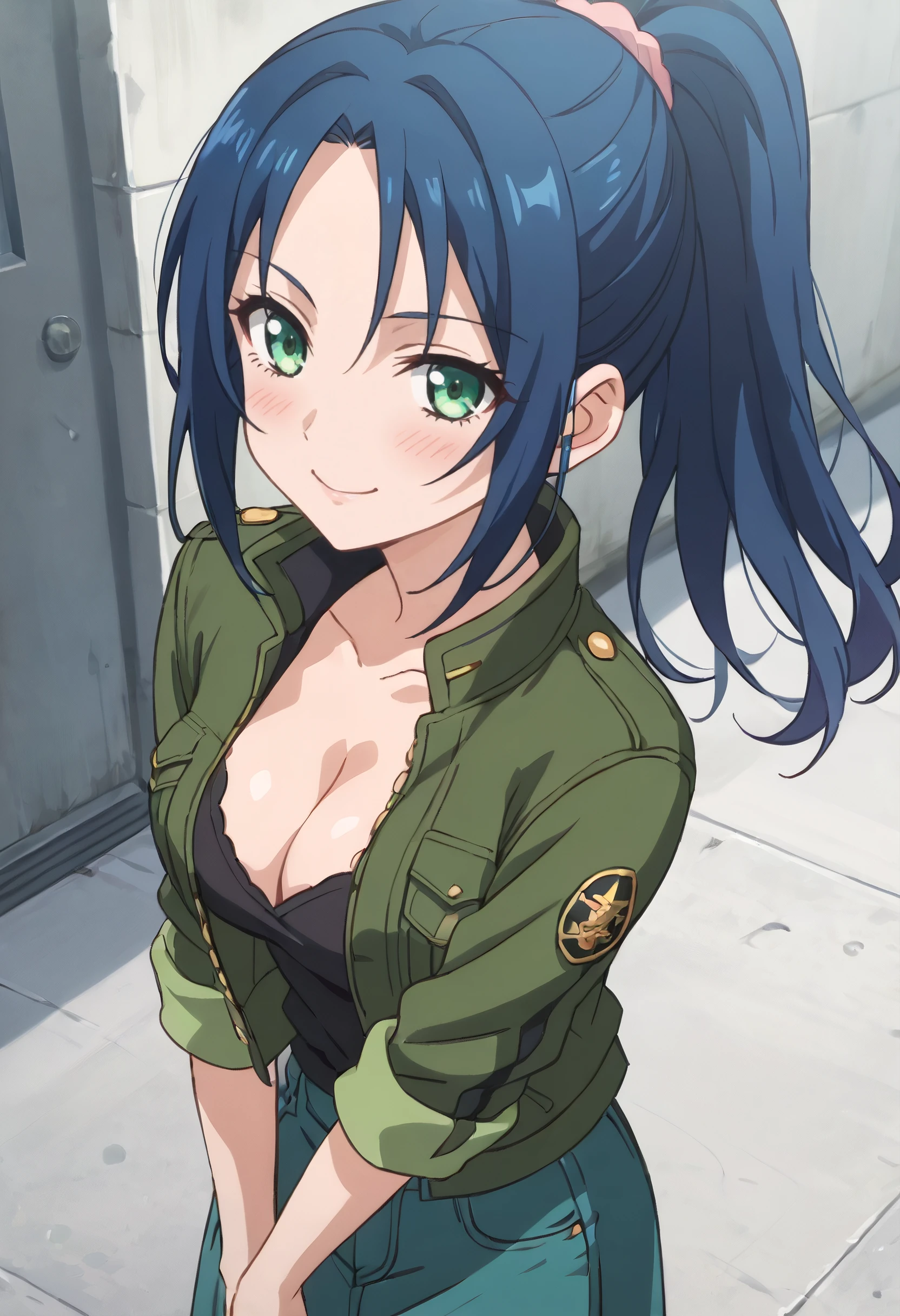 MiharuJacket, green jacket, military, military uniform, ponytail, uniform, cleavage, jacket, shirt, collarbone, long sleeves, pants, open clothes, sleeves rolled up, green skirt, denim, jeans, black shirt, open jacket,