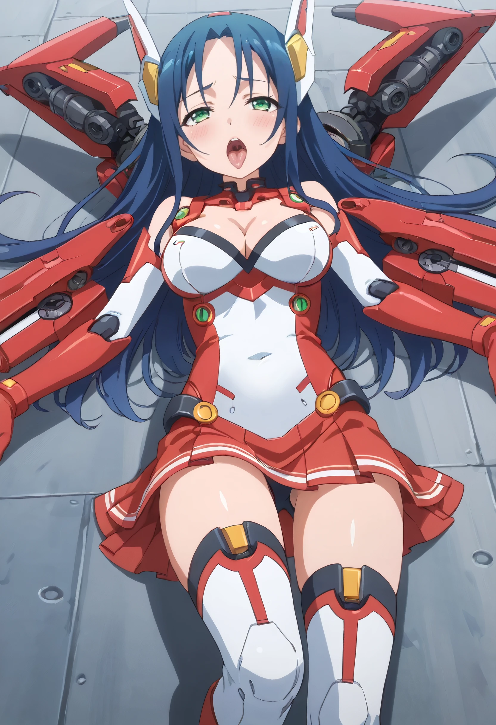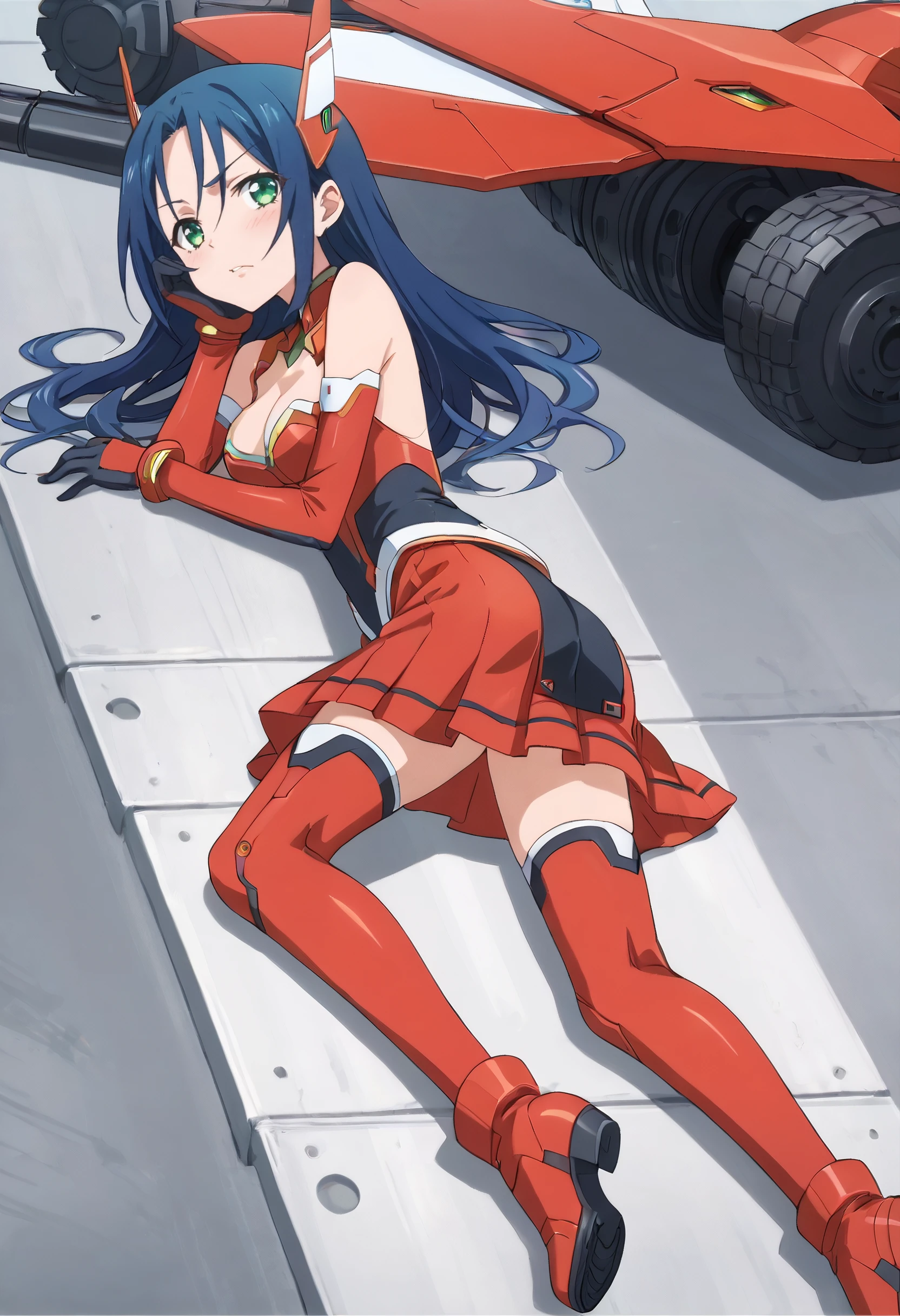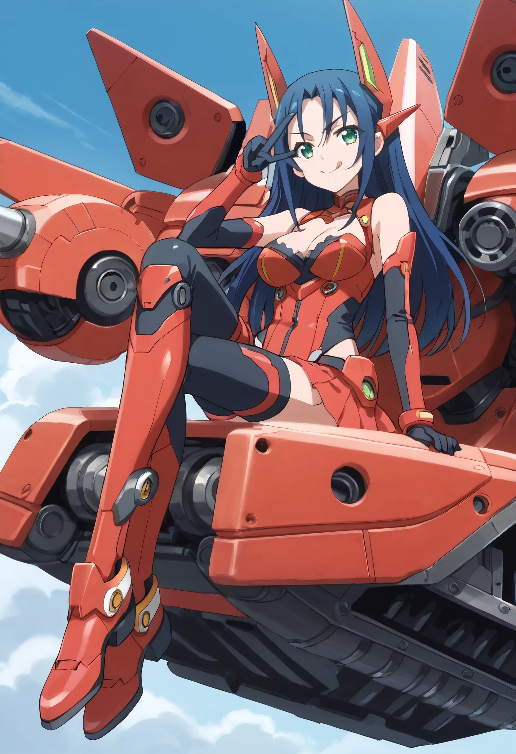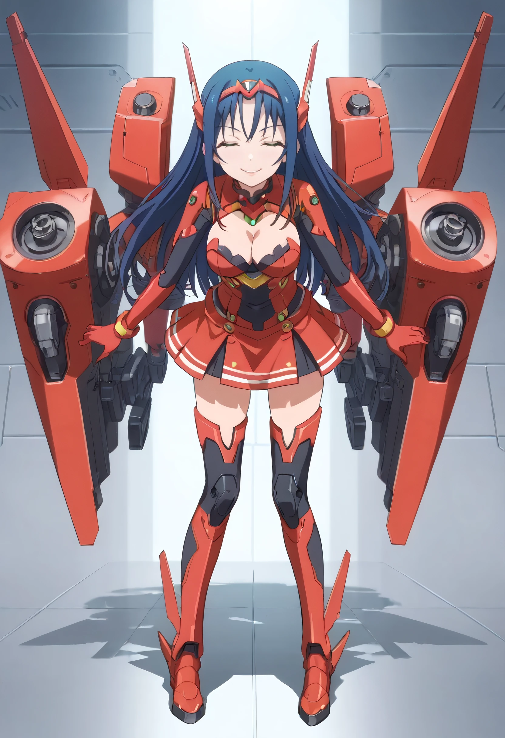MiharuMecha, gloves, mecha musume, mecha, headgear, science fiction, machinery, weapon, thighhighs, v-fin, cleavage, boots, pilot suit, leotard, skirt, bangs, red skirt, elbow gloves, thrusters, bodysuit,