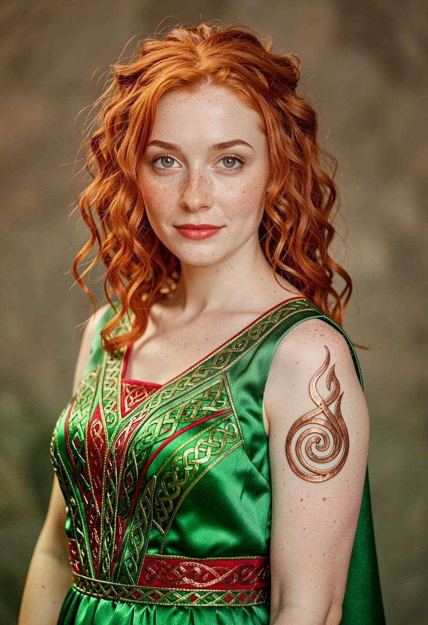 Rua Aingeal or Red Angel, a Redhead female of Irish descent. She has Smattering of Freckles across her Fair skin, Curly Red hair, and striking Green Eyes