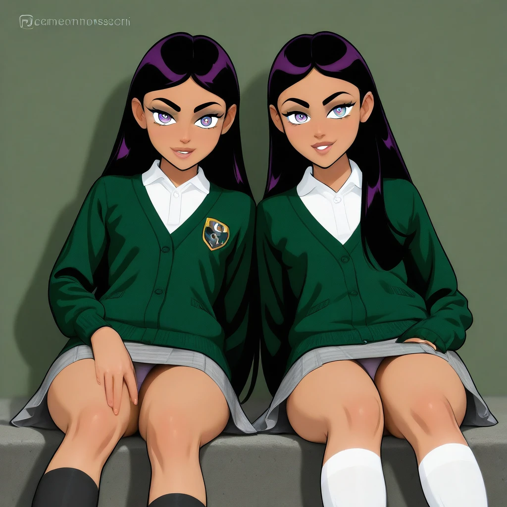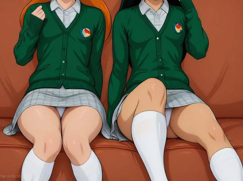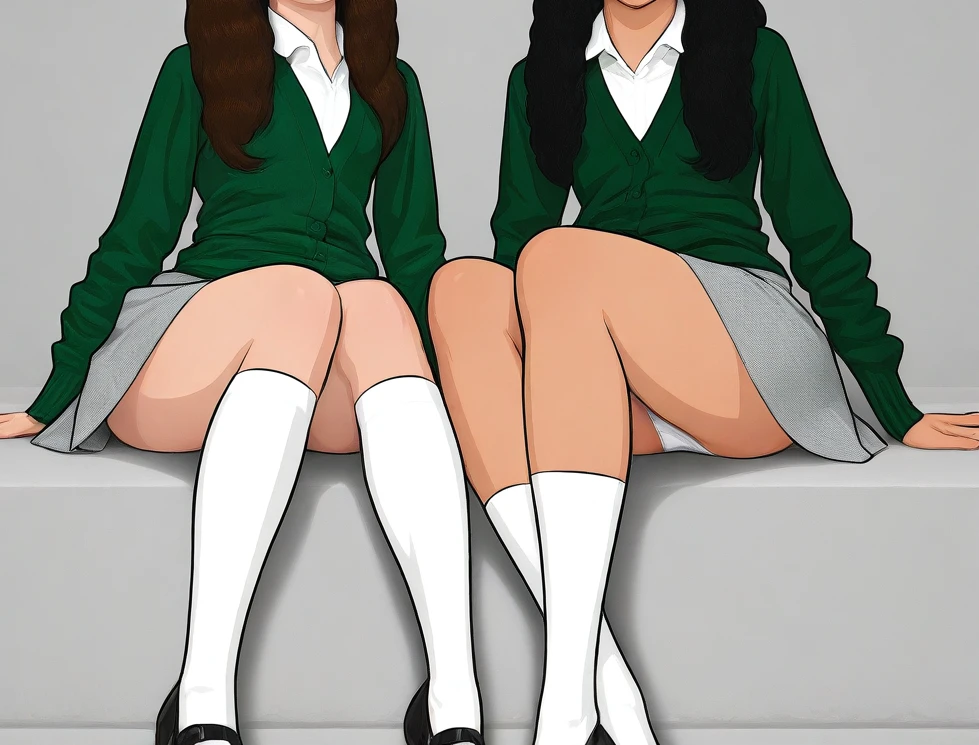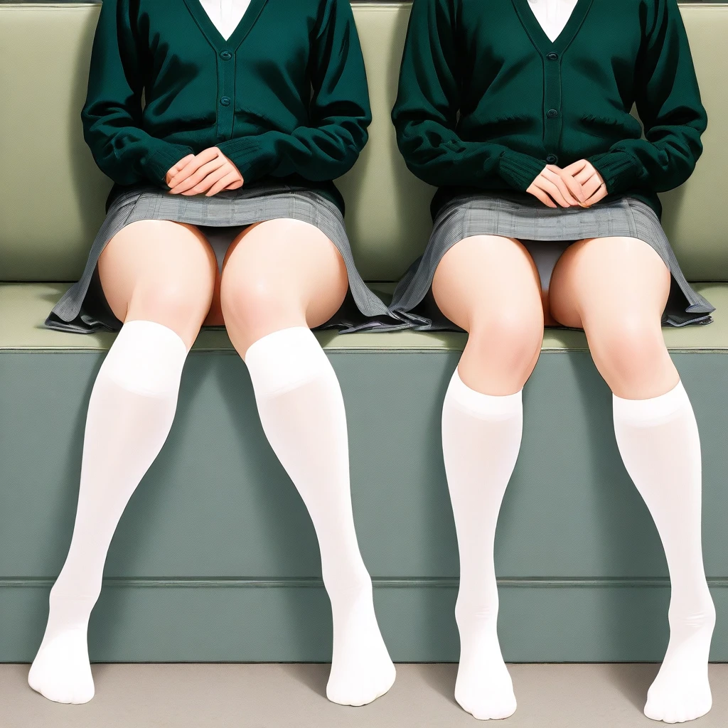 skirt, green cardigan, white shirt, *color* socks, *color* footwear