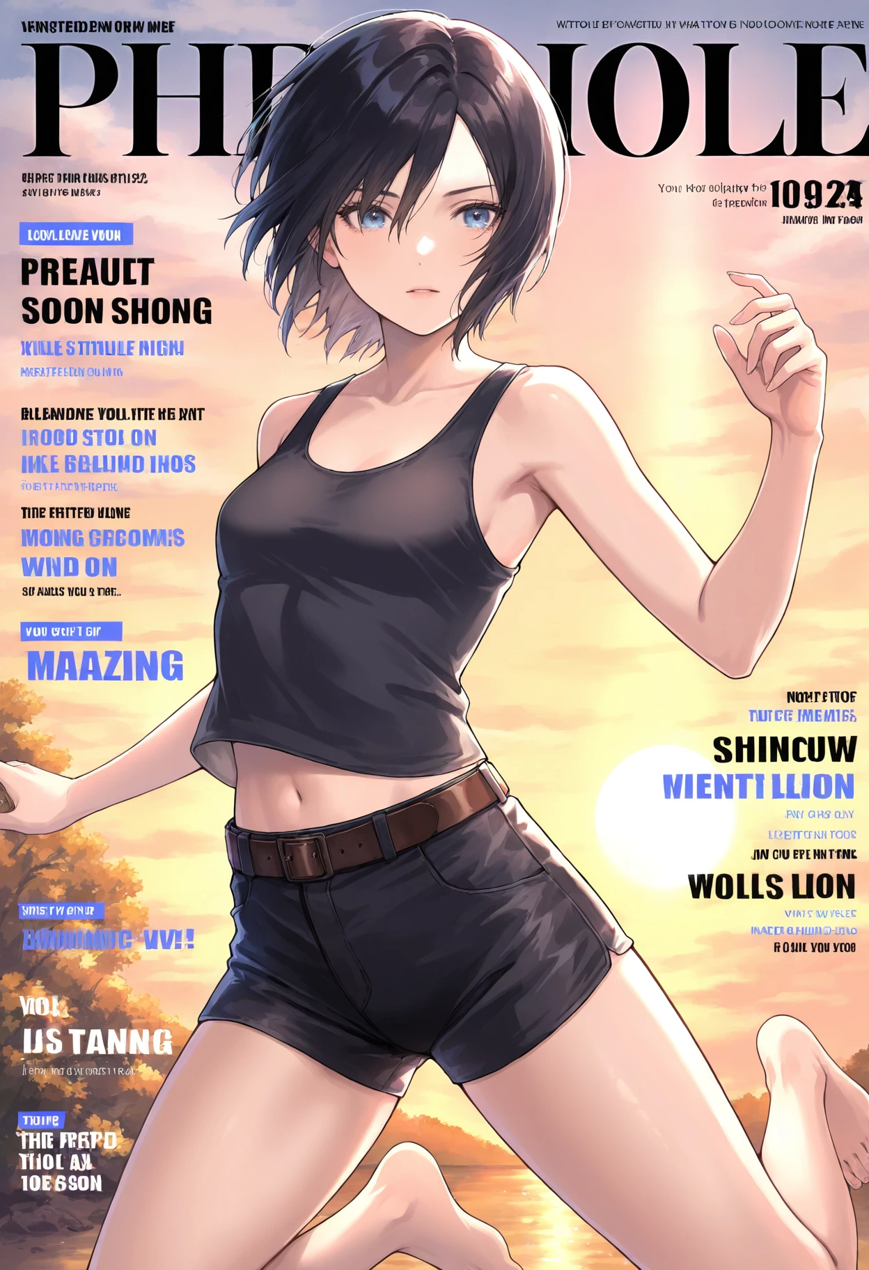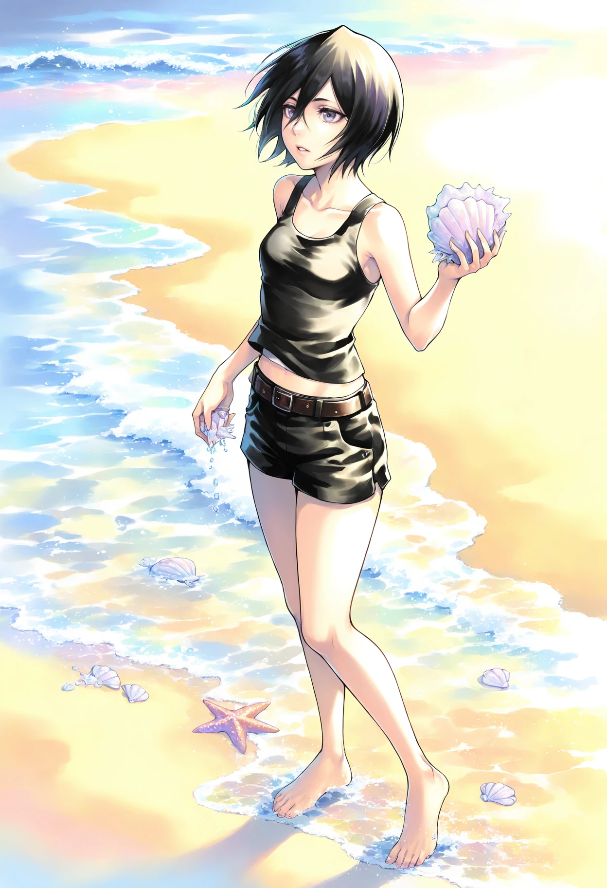 tank top,black tank top,shirt,black shirt,sleeveless,bare shoulders,bare arms,midriff,shorts,black shorts,short shorts,belt,barefoot,bare legs,breasts,small breasts