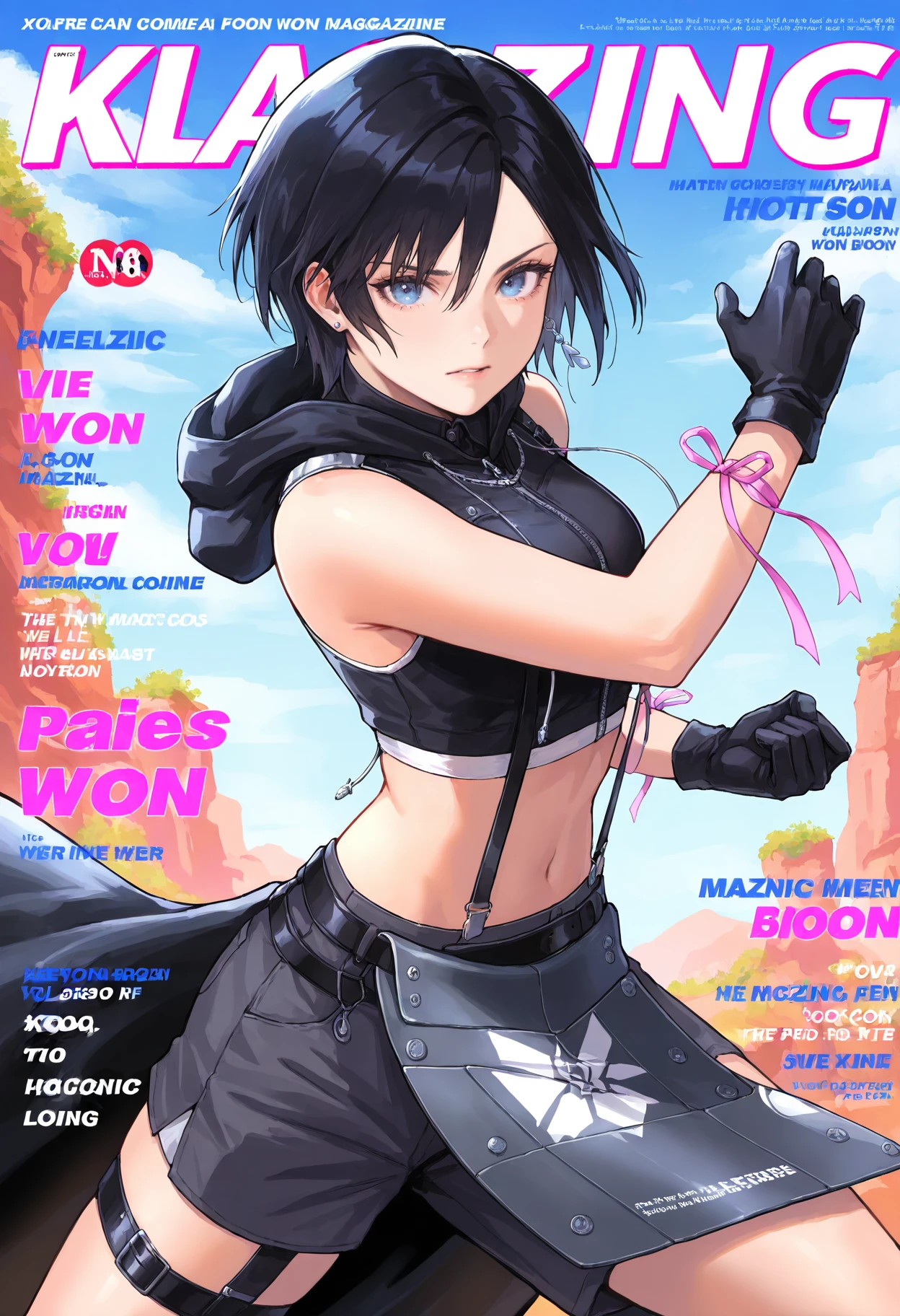earrings,single earring,hood,hood down,hoodie,cropped hoodie,jacket,black jacket,shirt,black shirt,sleeveless,sleeveless shirt,midriff,arm ribbon,ribbon,pink ribbon,suspenders,belt,thigh strap,shorts,black shorts,grey shorts,gloves,black gloves,armor,jewelry