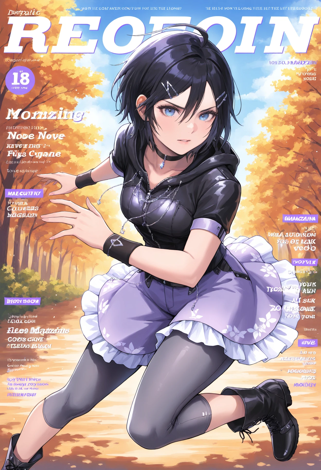 ahoge,hair ornament,hairclip,jewelry,necklace,choker,wristband,hood,jacket,shirt,short sleeves,skirt,purple skirt,frills,shorts,leggings,boots,ankle boots,black footwear