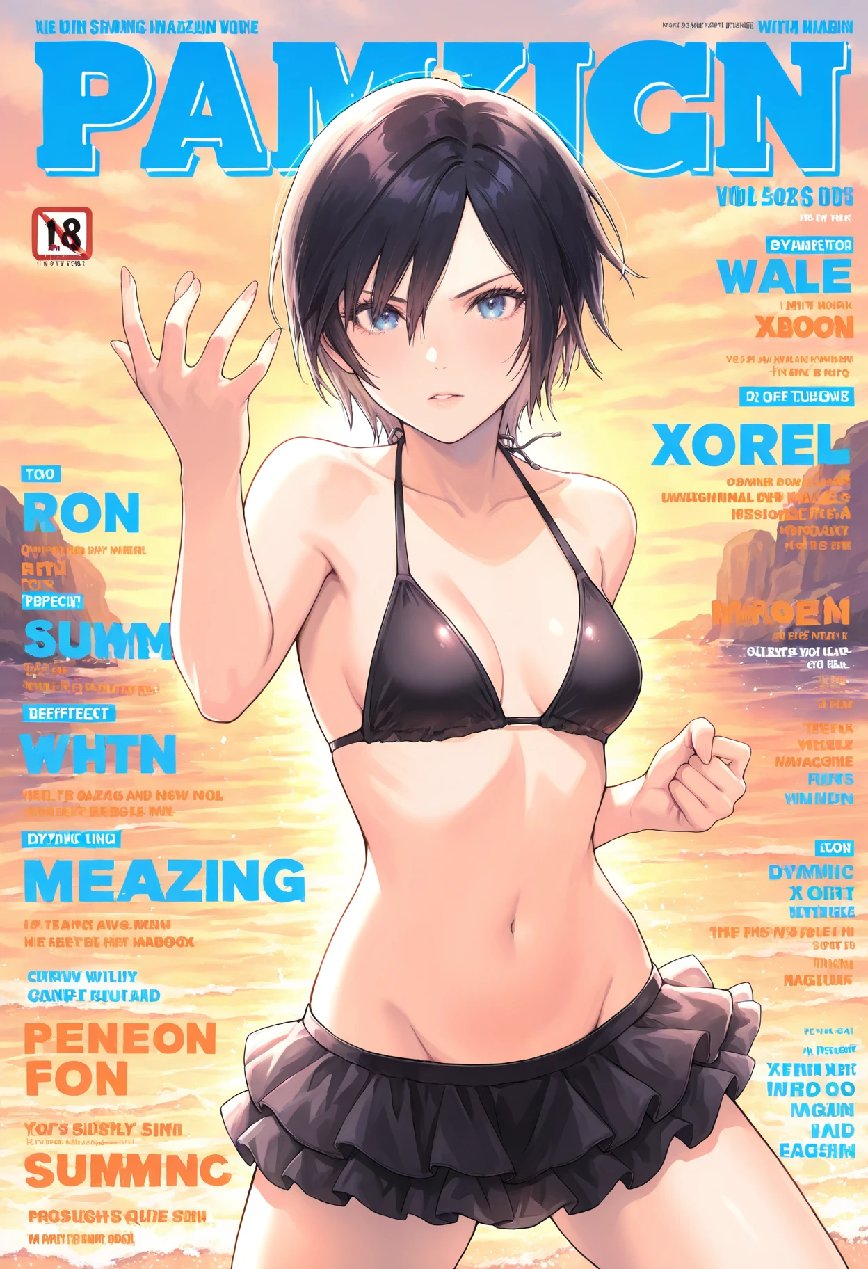 swimsuit,bikini,black bikini,frilled bikini,frills,bikini skirt,bare shoulders,breasts,medium breasts,small breasts,groin