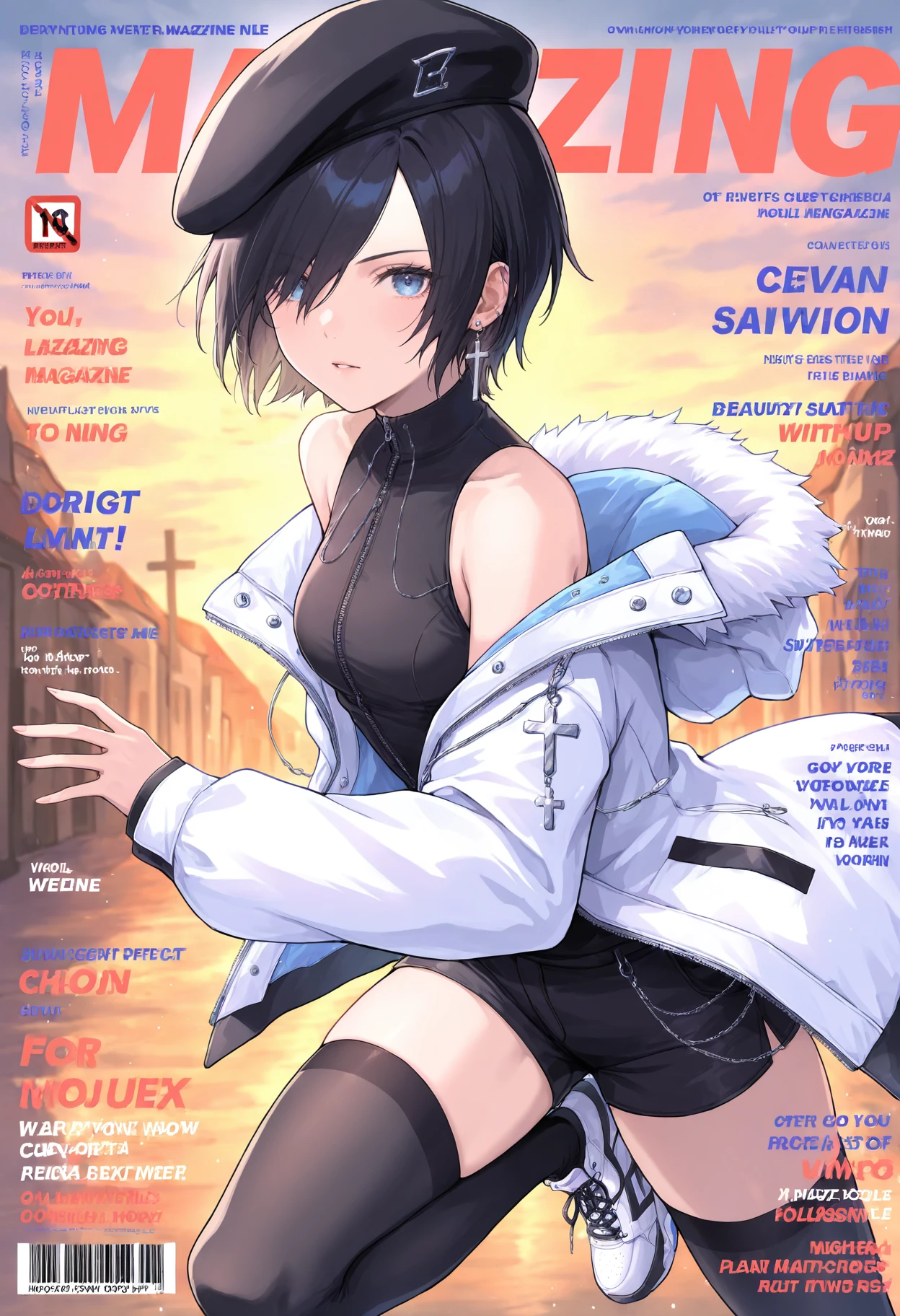 hair over one eye,earrings,cross,cross earrings,hat,beret,black headwear,jewelry,jacket,white jacket,,,zipper,shirt,black shirt,sleeveless,sleeveless shirt,off shoulder,bare shoulders,long sleeves,turtleneck,clothing cutout,shorts,black shorts,short shorts,thighhighs,black thighhighs,shoes,sneakers,white footwear