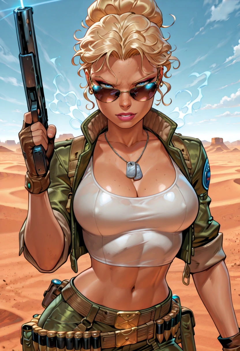 Outfit 1: green jacket, white crop top, belt, green pants, bandolier, necklace, ammunition belt, sunglasses, fingerless gloves, dog tags, jewelry, open clothes, navel, cleavage