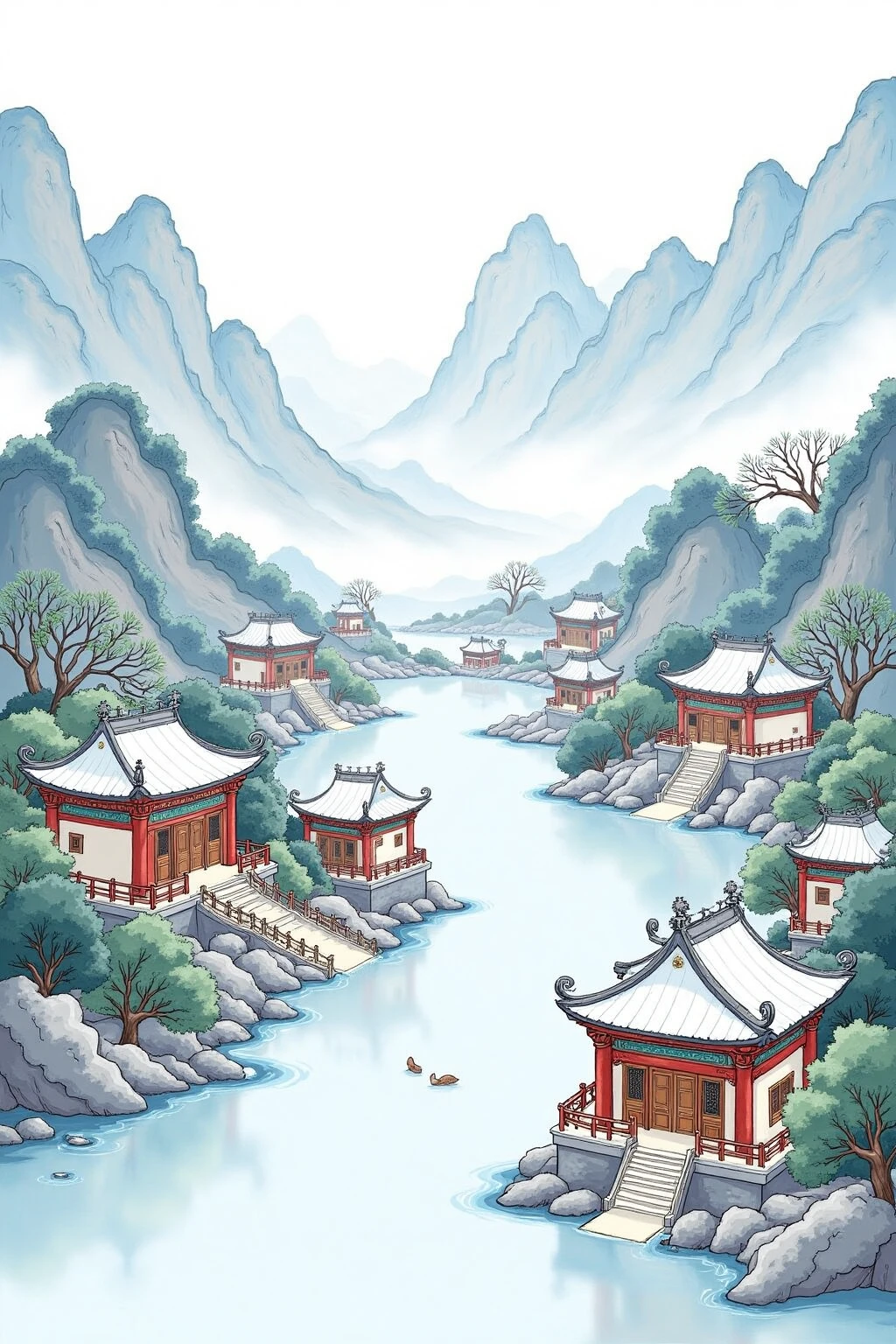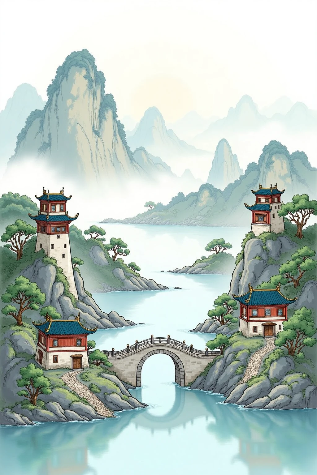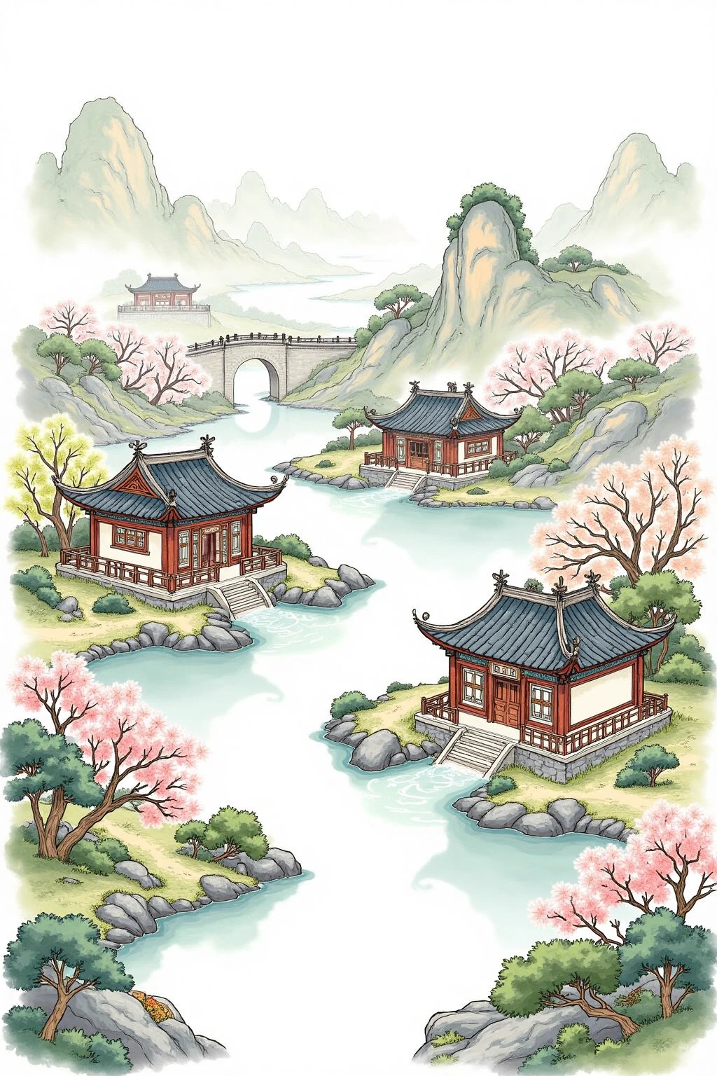 Base Prompt:Chinese - style architectural and landscape illustration