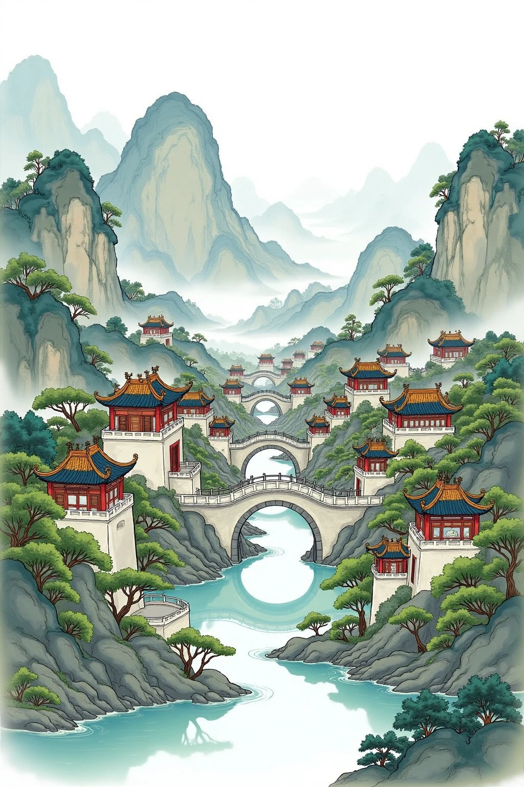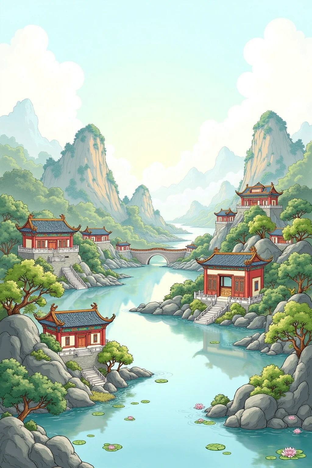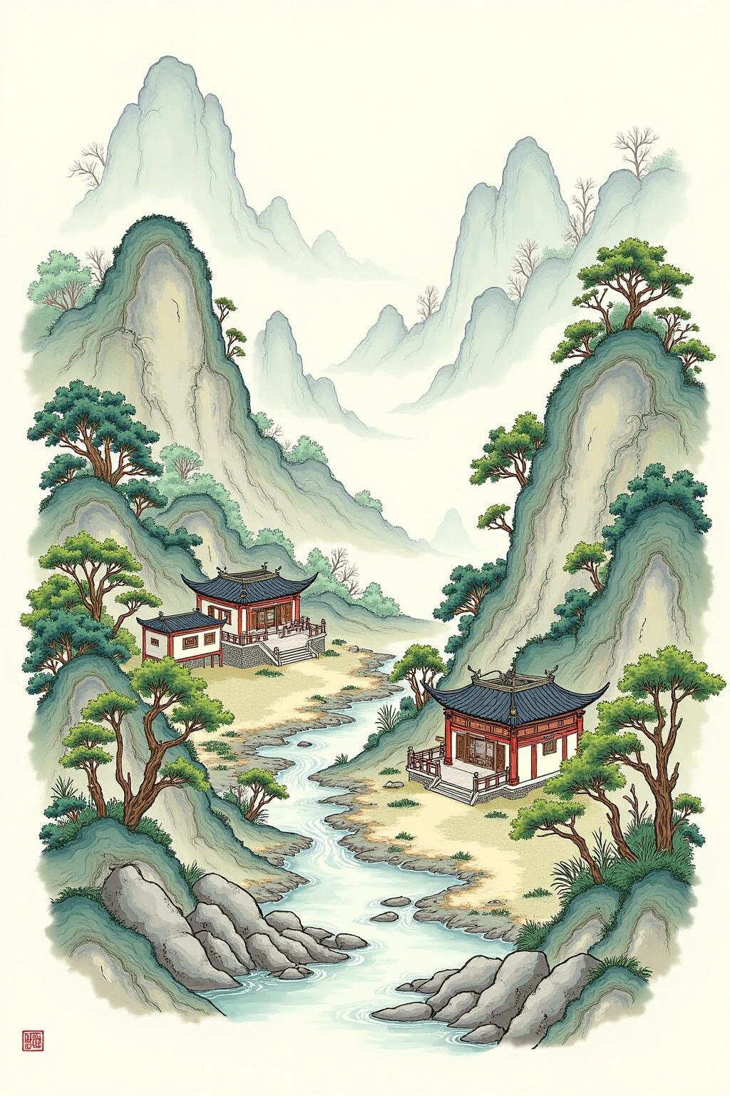 Base Prompt:Chinese - style architectural and landscape illustration