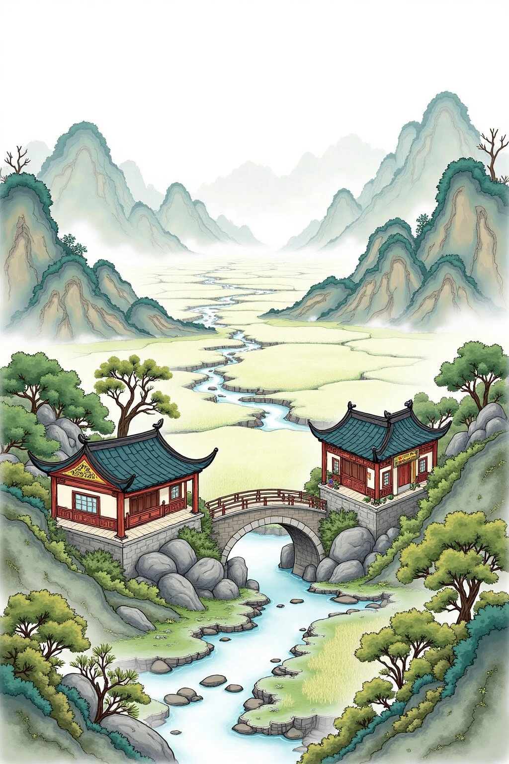 Chinese - style architectural and landscape illustration, craft a rural panorama with thatched cottages, rice fields, and a small stone bridge over a brook.