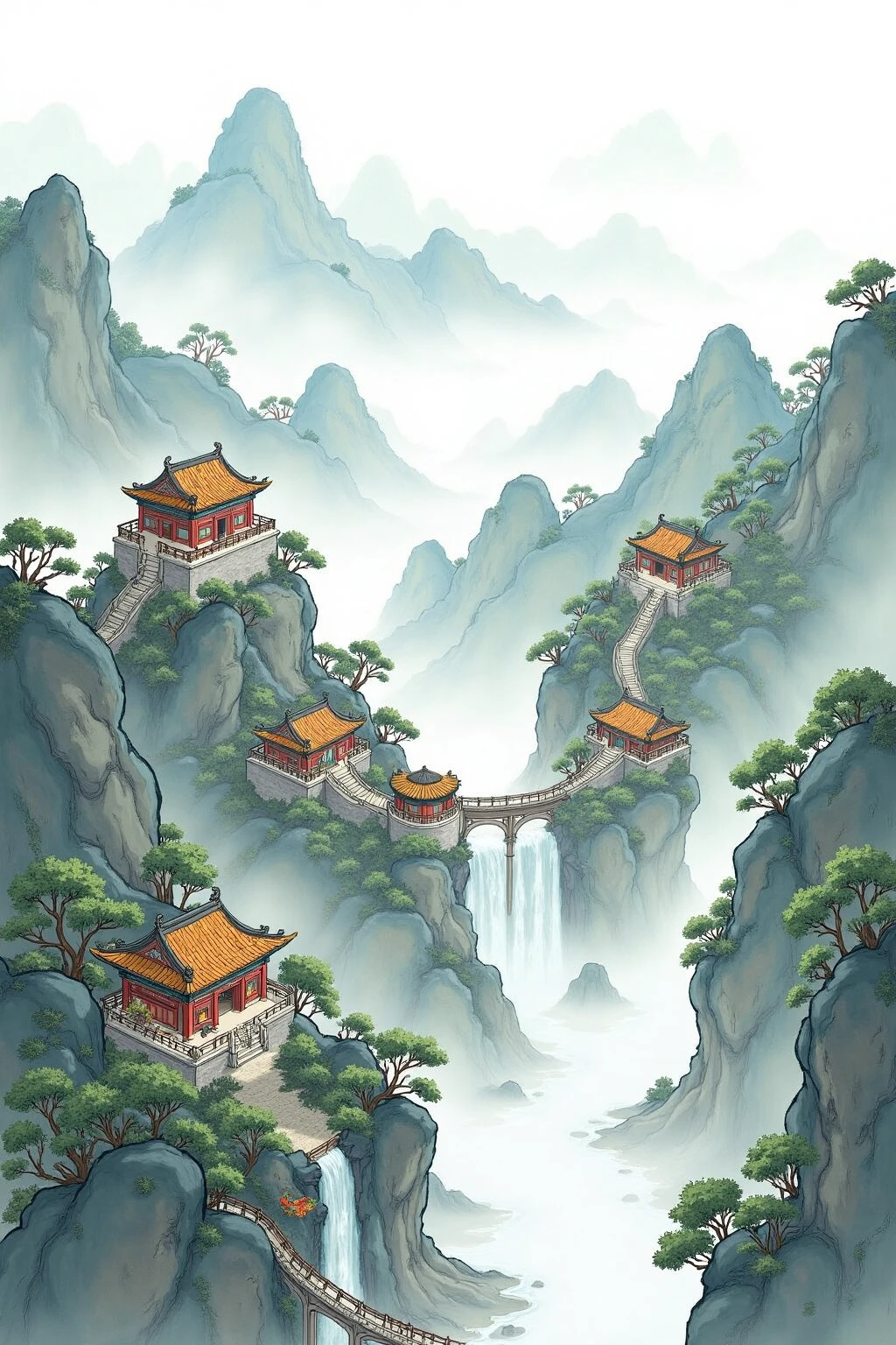 Chinese - style architectural and landscape illustration, depict a misty mountain temple complex, with tiered halls, winding paths, and cascading waterfalls.