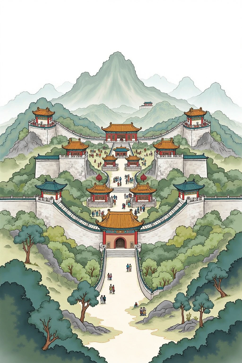 Chinese - style architectural and landscape illustration, build a grand city wall view, with watchtowers, gates, and bustling streets inside.