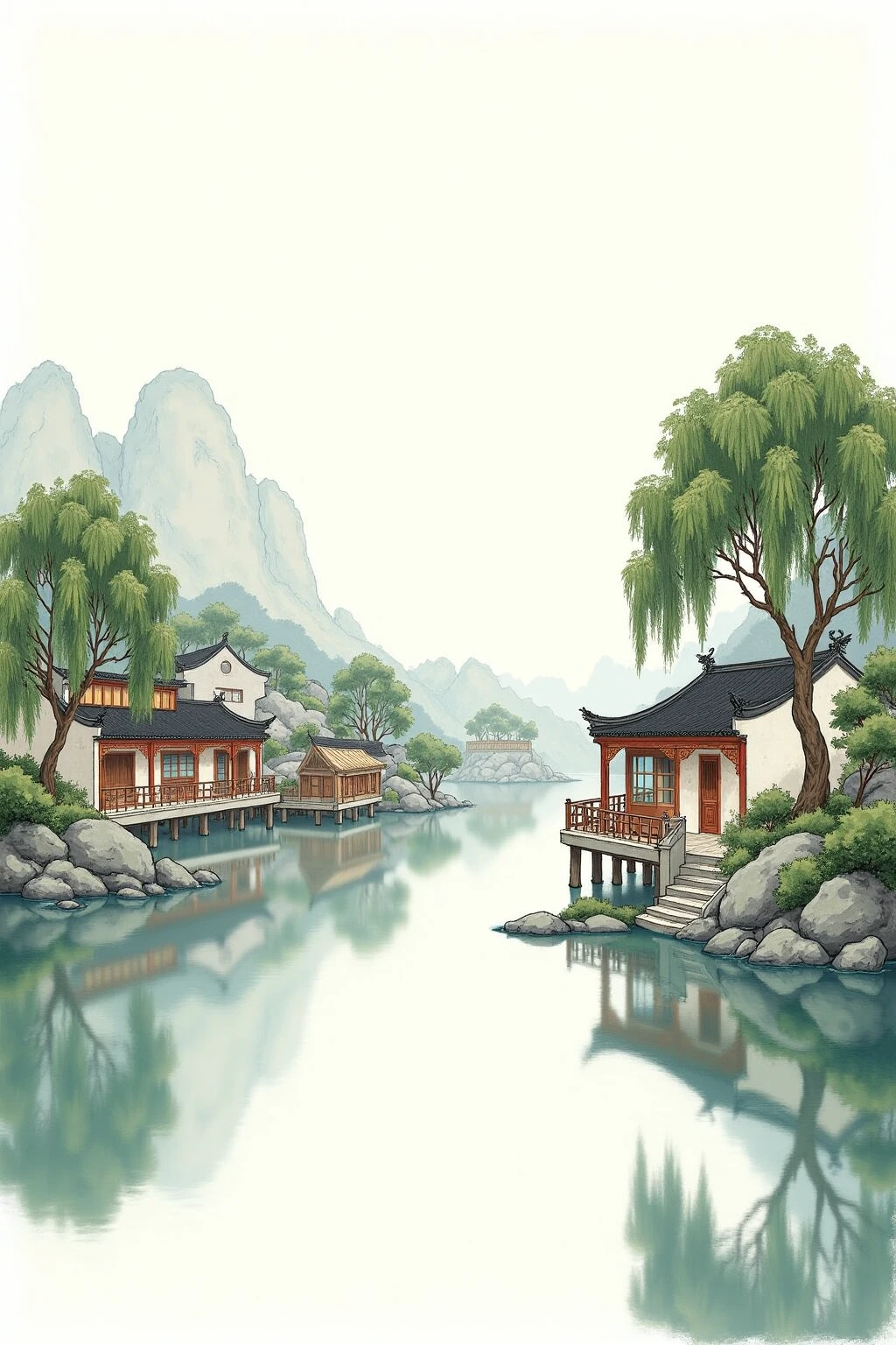 Chinese - style architectural and landscape illustration, make a riverside scene with stilted houses, willow trees, and stone docks, reflecting in the water.
