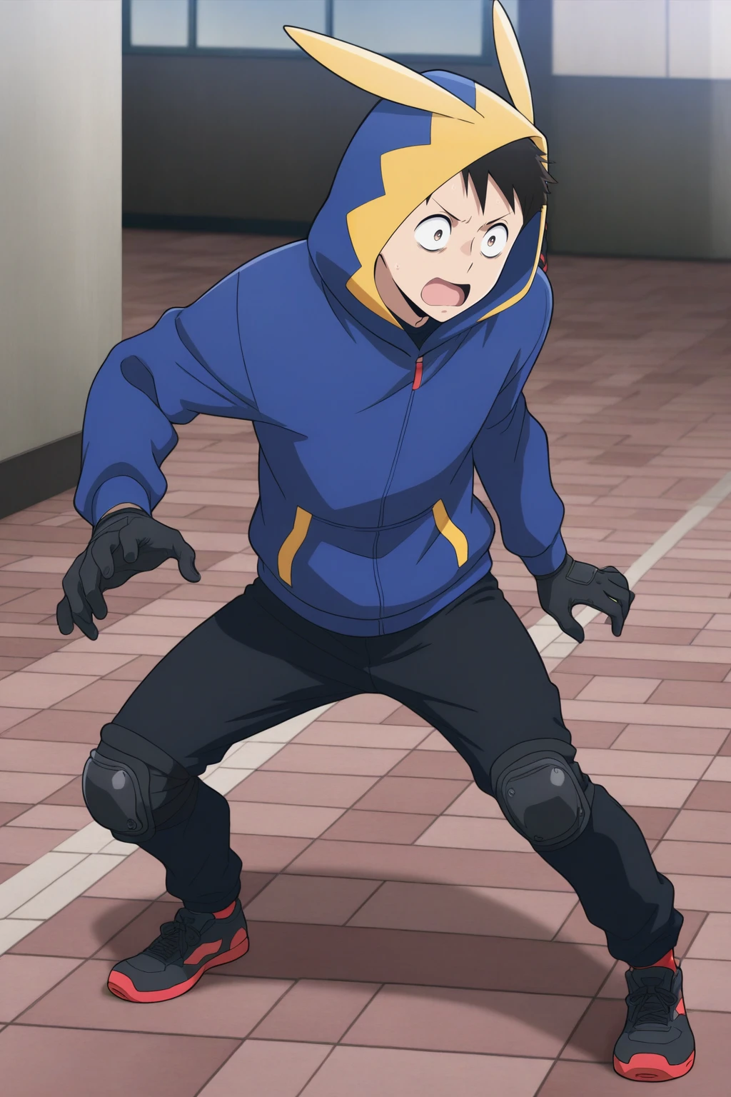 hood with ears, blue hoodie, black pants, black gloves with knee pads, black sneakers with red soles,