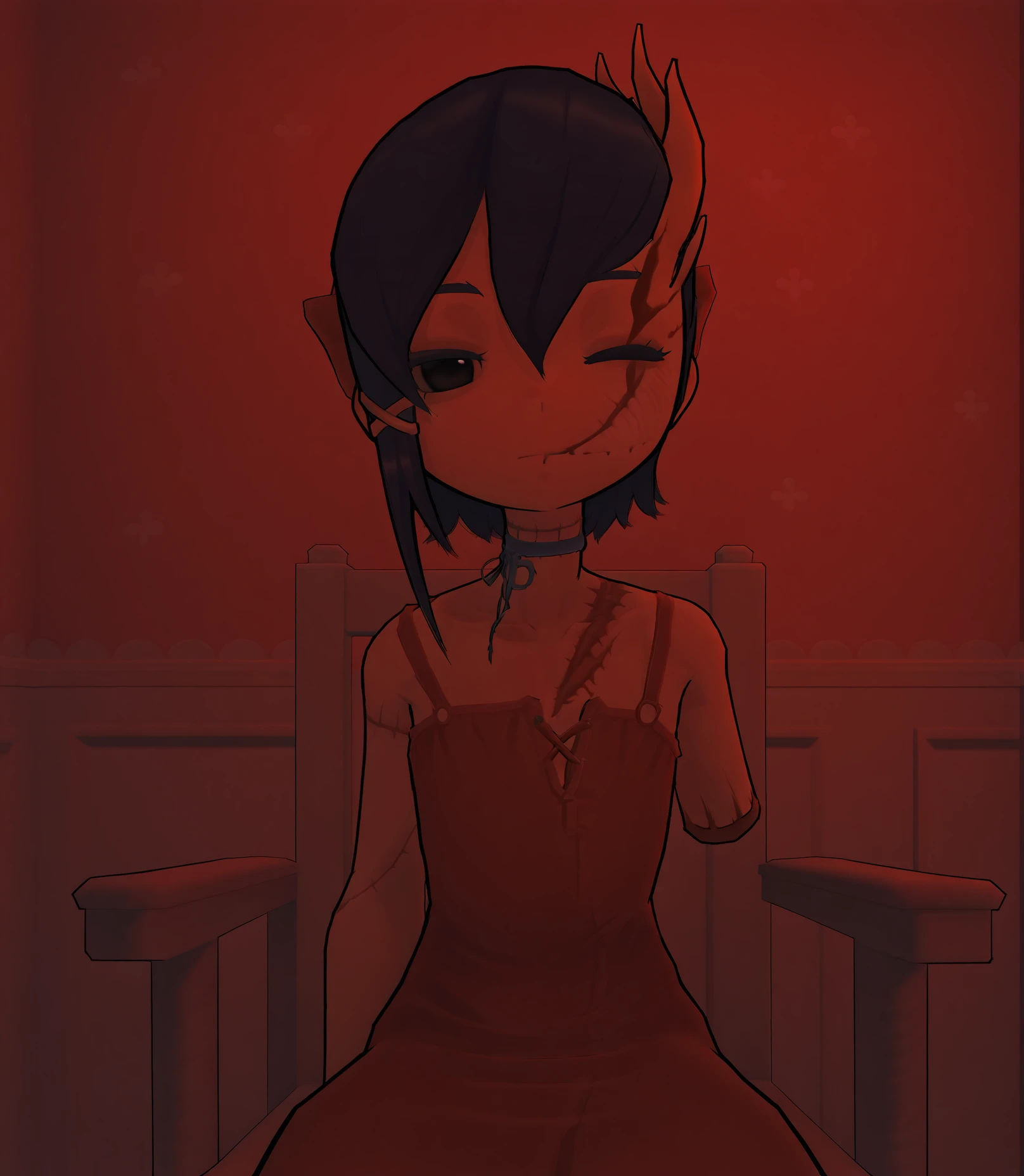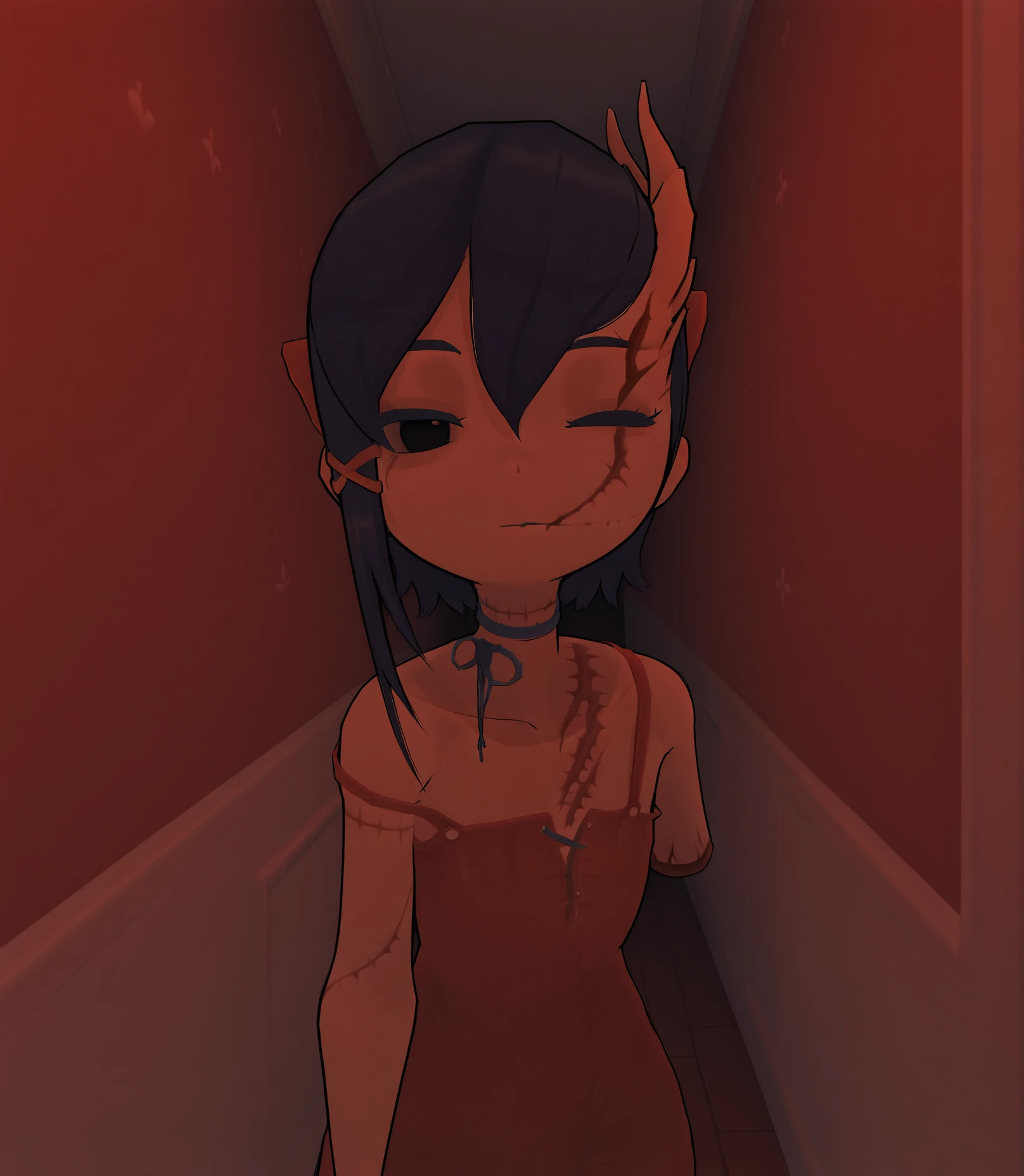 dress, red dress, strap slip, choker, blue choker