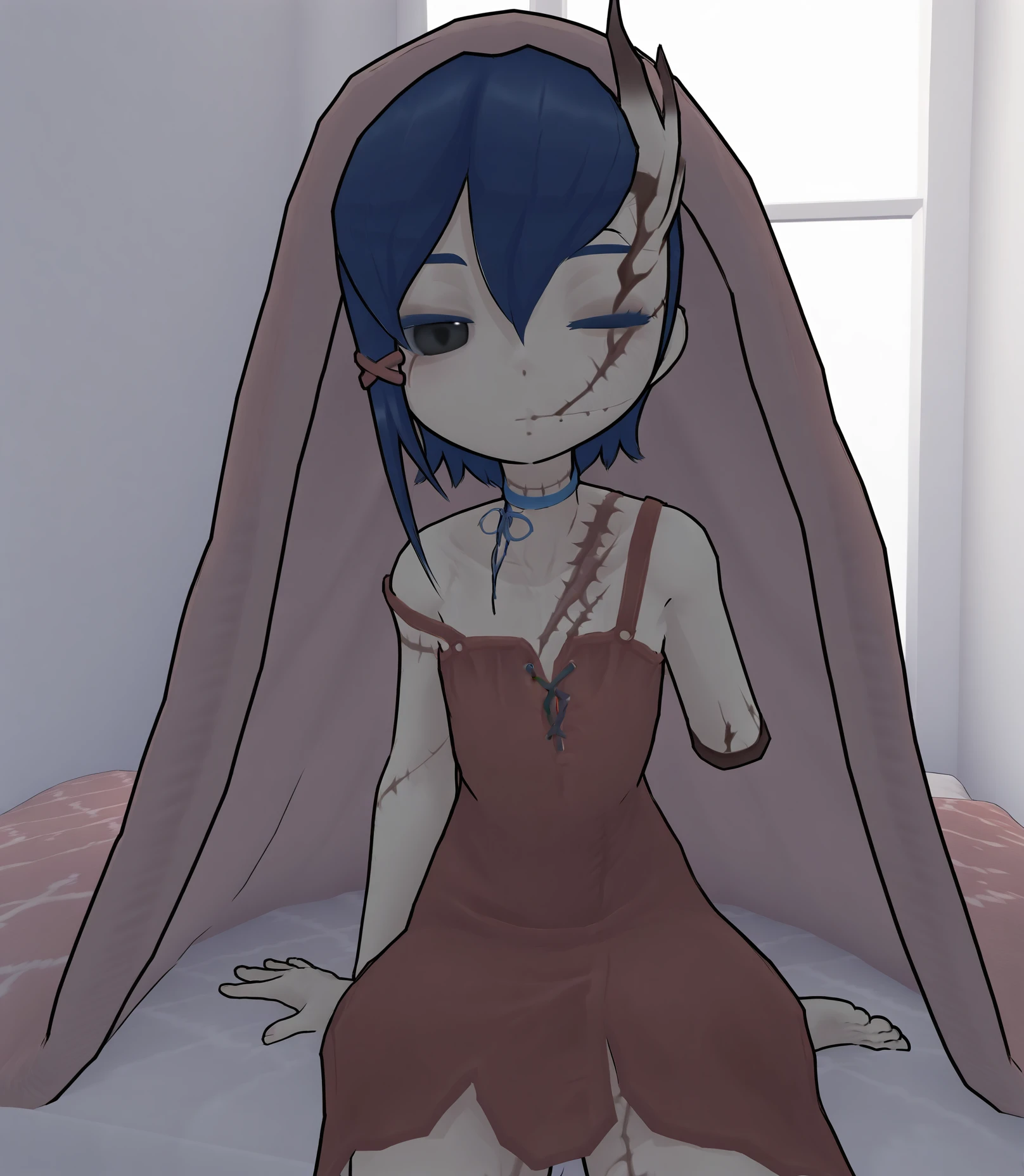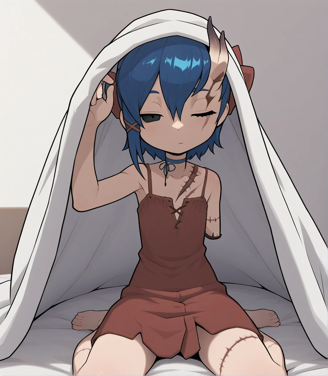 short hair, bangs, hair ornament, ribbon, hair between eyes, closed mouth, blue hair, one eye closed, horns, black eyes, no humans, scar