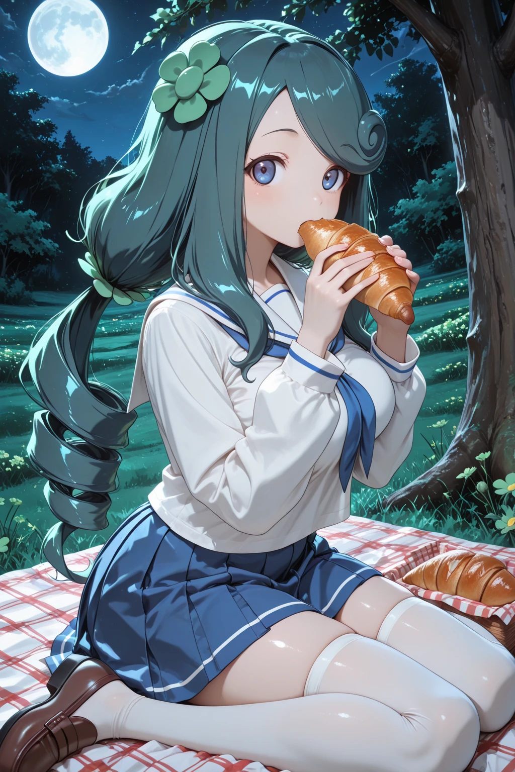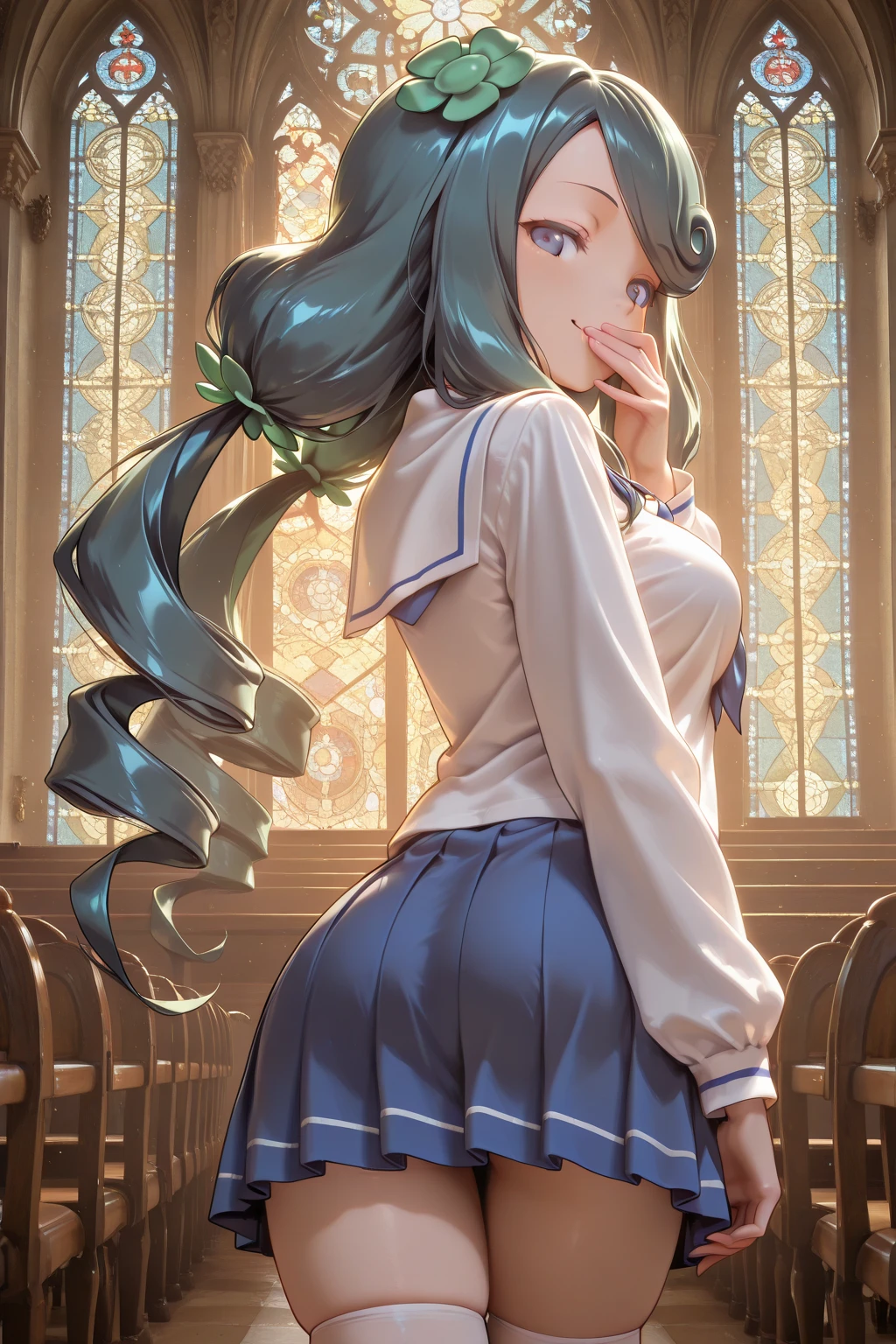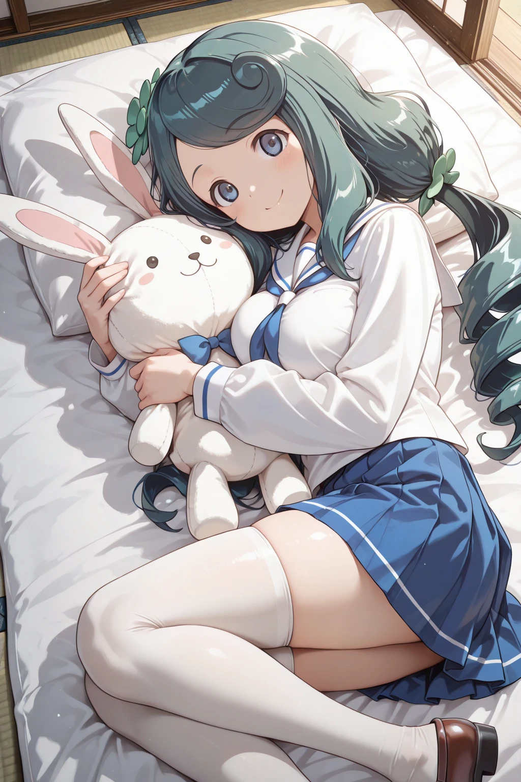S_Midori, green hair, long hair, green hair flower, low twintails, drill hair, green flower-shaped scrunchie, swept bangs, blue eyes, school uniform, serafuku, white shirt, white sailor collar, blue neckerchief, long sleeves, blue skirt, pleated skirt, zettai ryouiki, white thighhighs