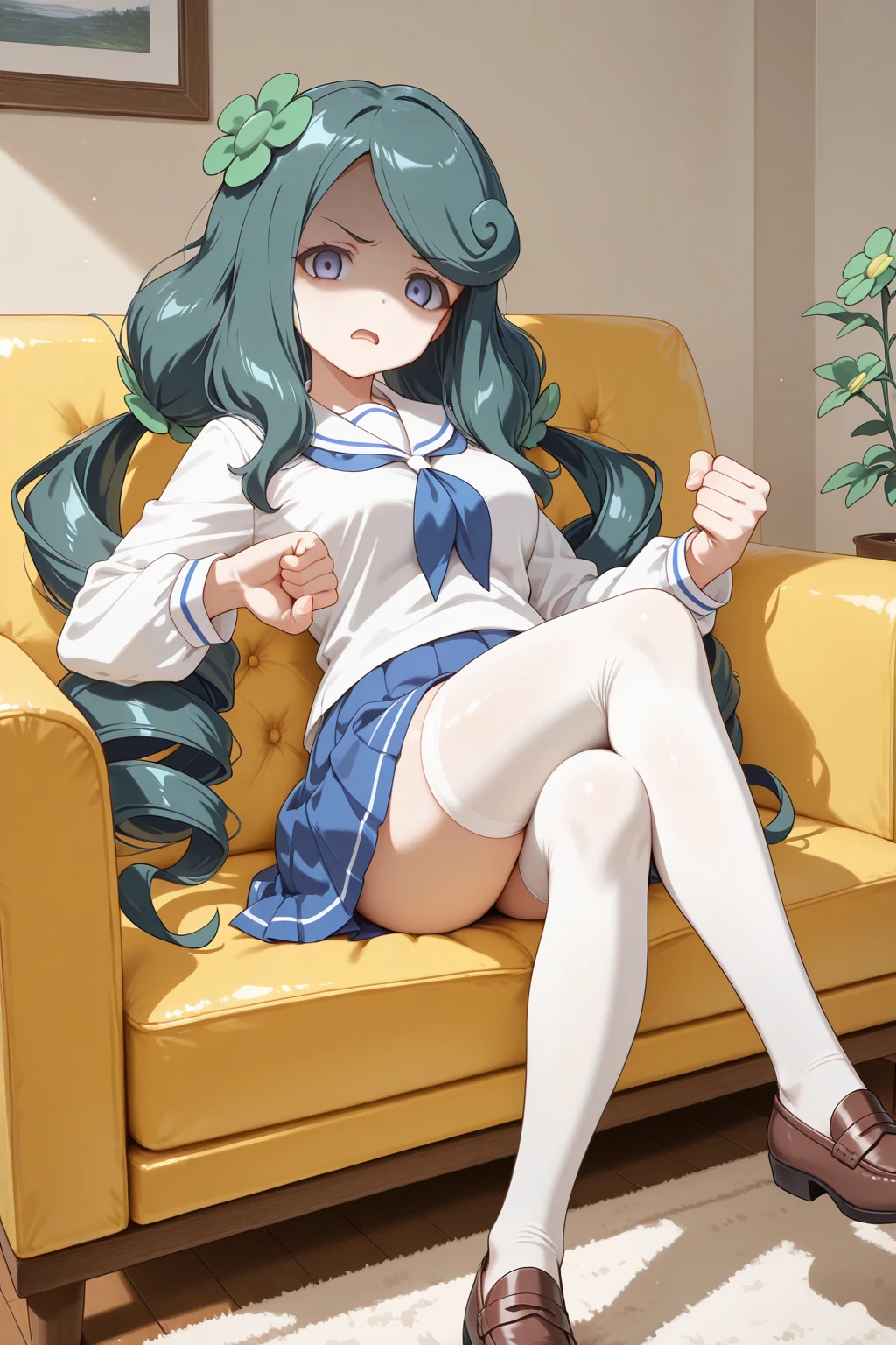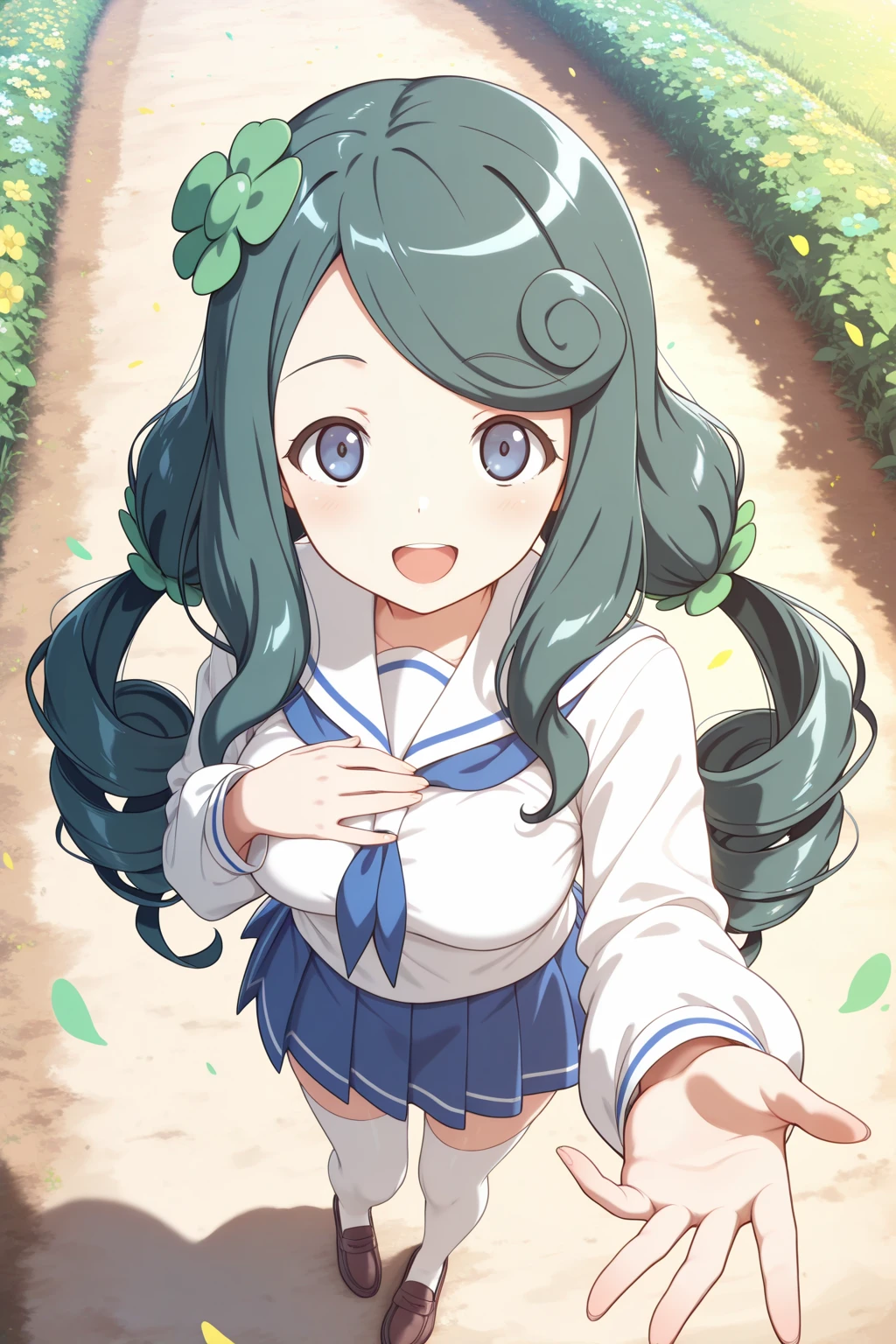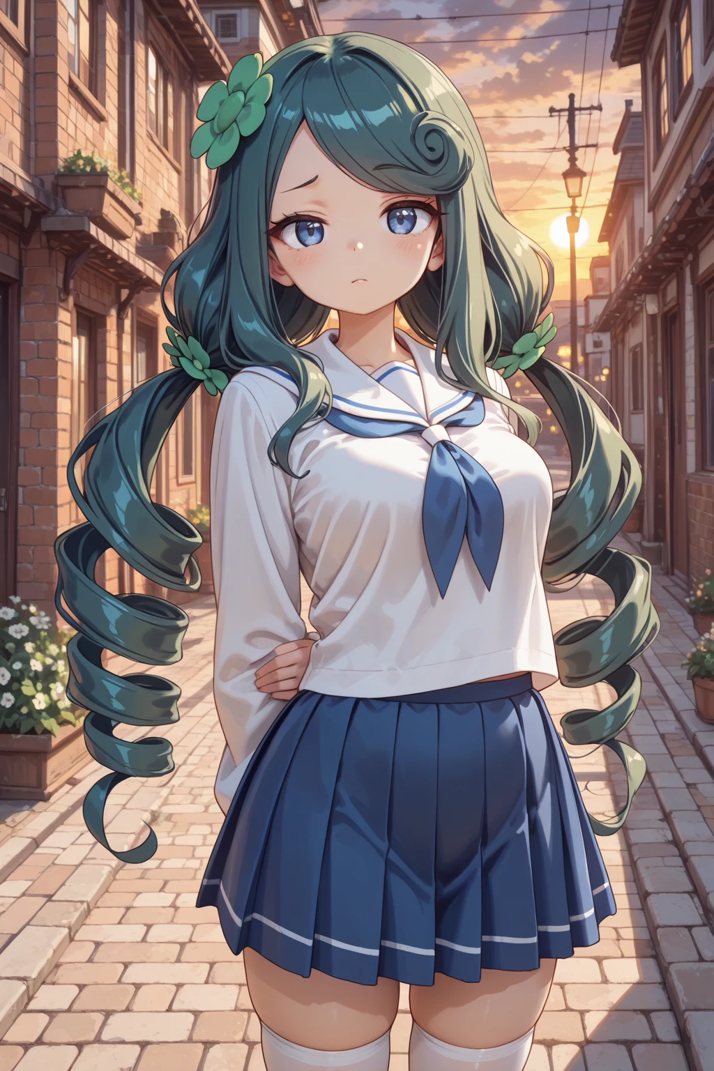 トリガーワード:S_Midori, green hair, long hair, green hair flower, low twintails, drill hair, green flower-shaped scrunchie, swept bangs, blue eyes, school uniform, serafuku, white shirt, white sailor collar, blue neckerchief, long sleeves, blue skirt, pleated skirt, zettai ryouiki, white thighhighs追加:brown loafers