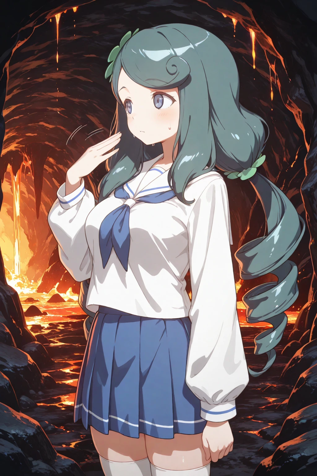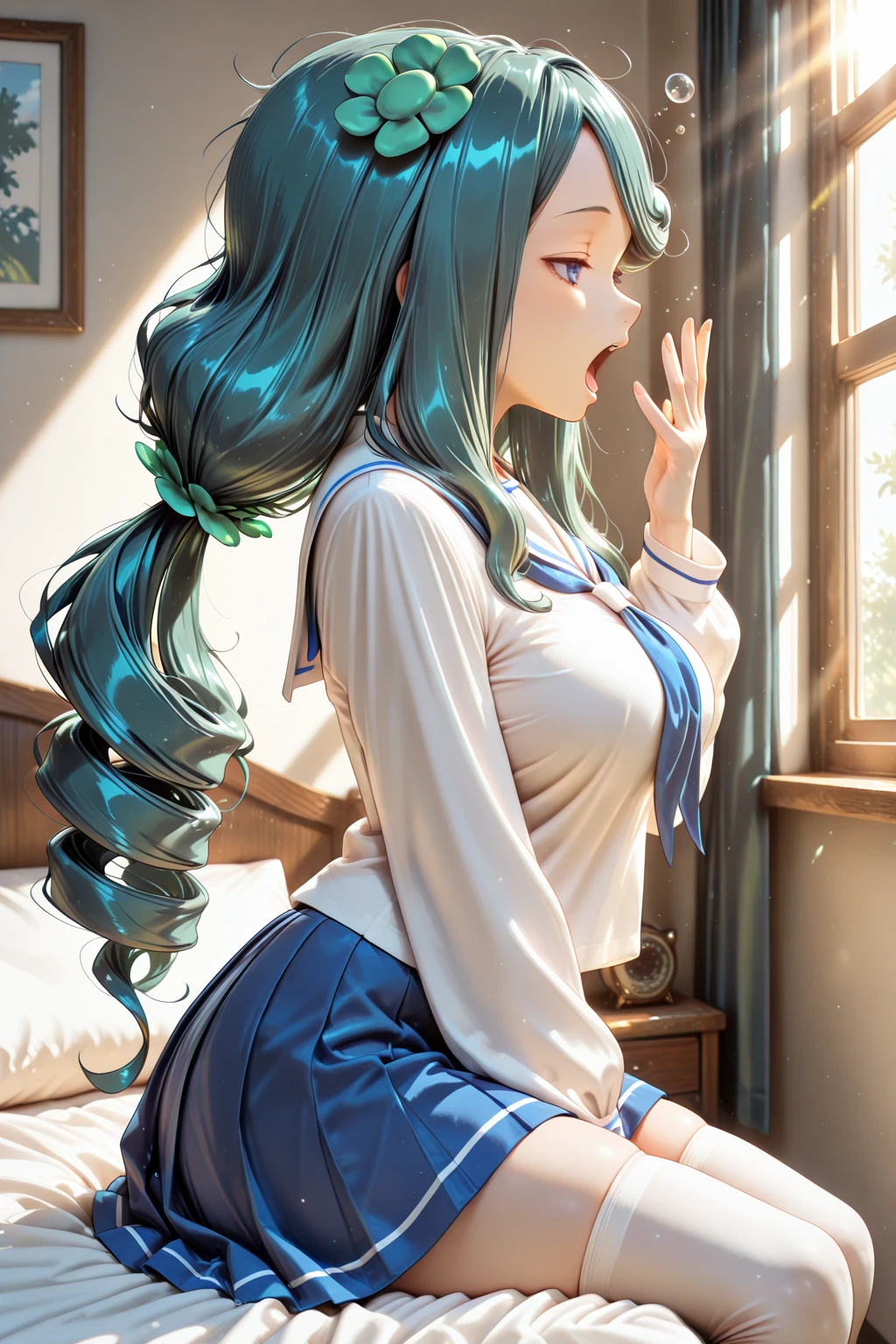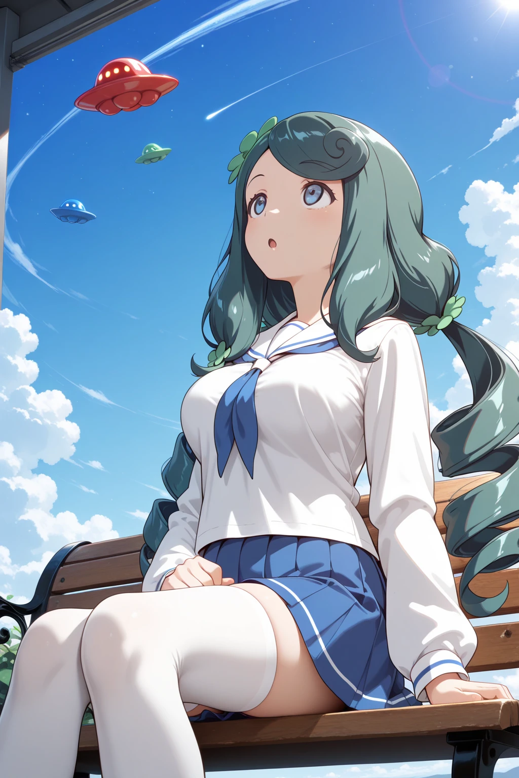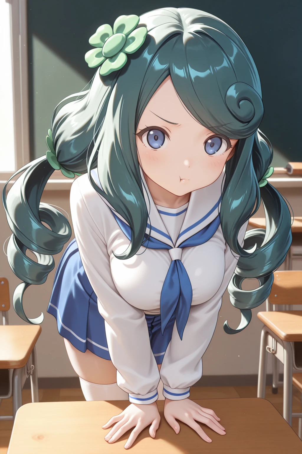 トリガーワード:S_Midori, green hair, long hair, green hair flower, low twintails, drill hair, green flower-shaped scrunchie, swept bangs, blue eyes, school uniform, serafuku, white shirt, white sailor collar, blue neckerchief, long sleeves, blue skirt, pleated skirt, zettai ryouiki, white thighhighs追加:brown loafers