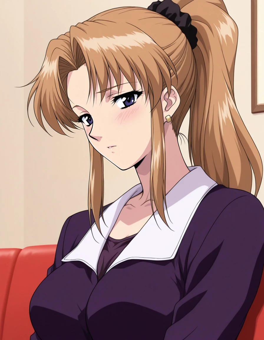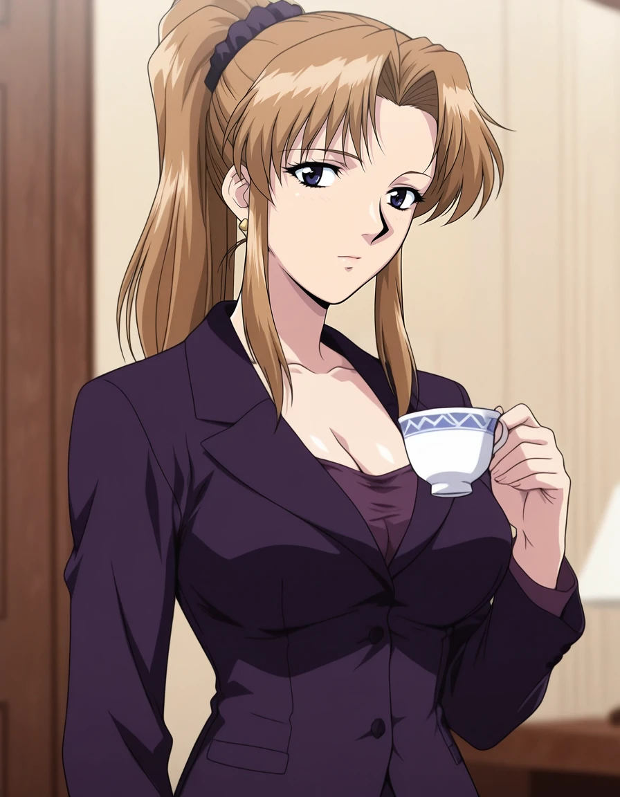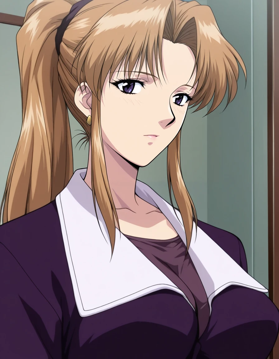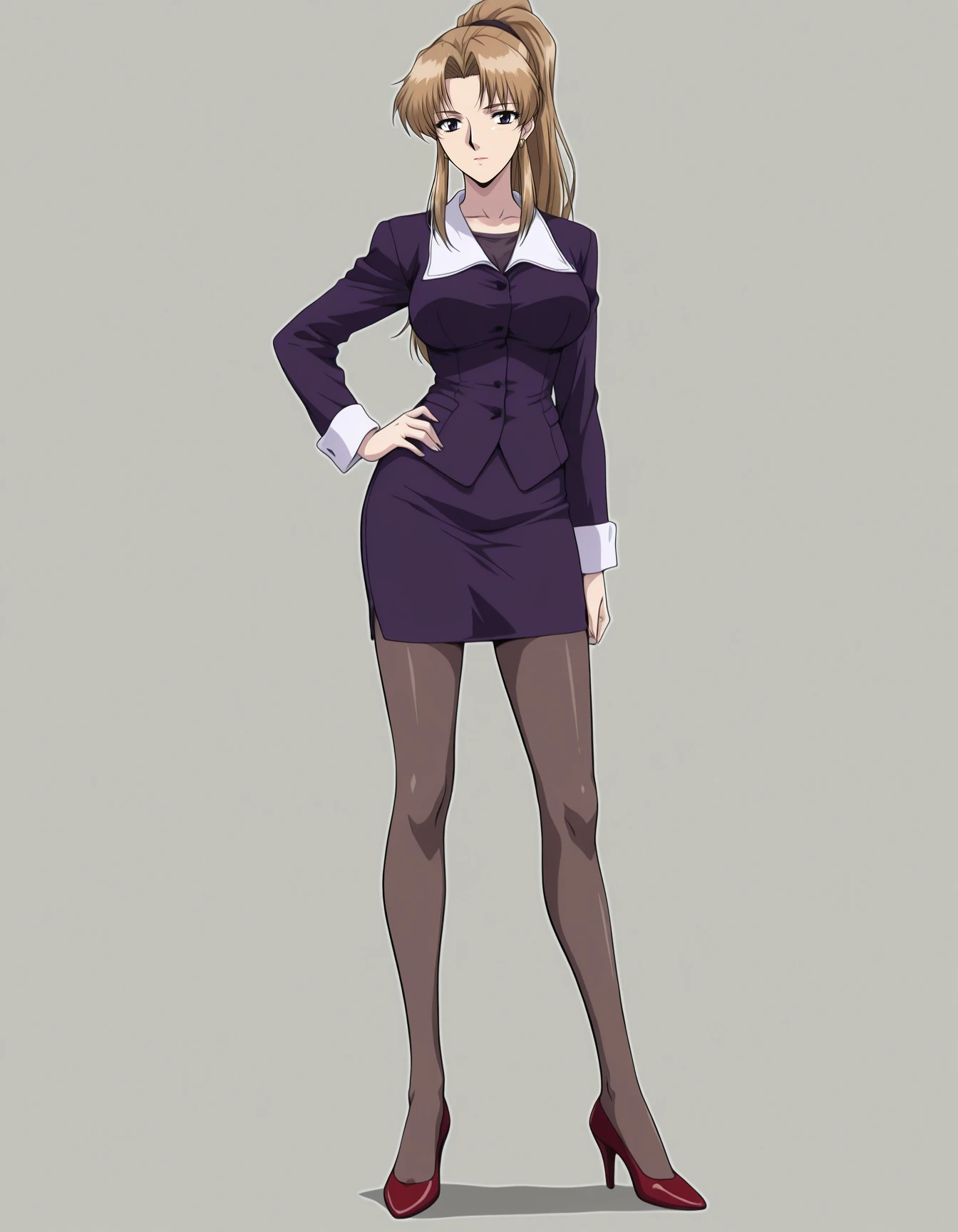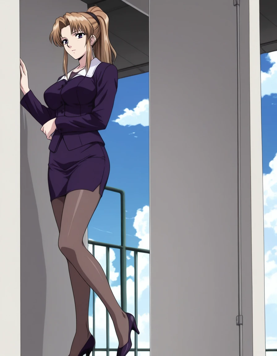 mai_hgteacher,anime_coloring,1990s \(style\),mature_female,(aged_up:1.5),long_legs,long_hair,ponytail,brown_hair,blue_eyes,earrings,purple_eyes,skirt_suit,pantyhose,red_high_heelsRecommend preferred Strength: 0.7~1.