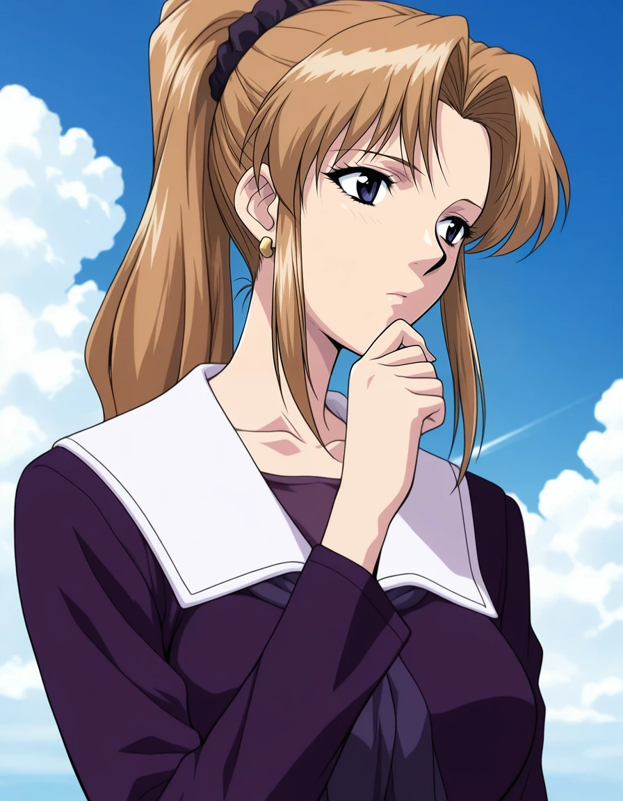 mai_hgteacher,anime_coloring,1990s \(style\),mature_female,(aged_up:1.5),long_legs,long_hair,ponytail,brown_hair,blue_eyes,earrings