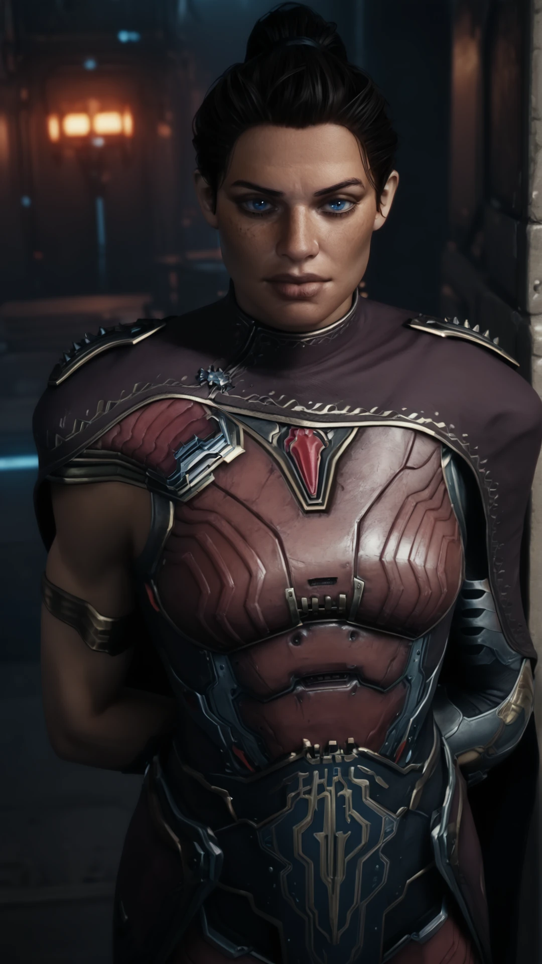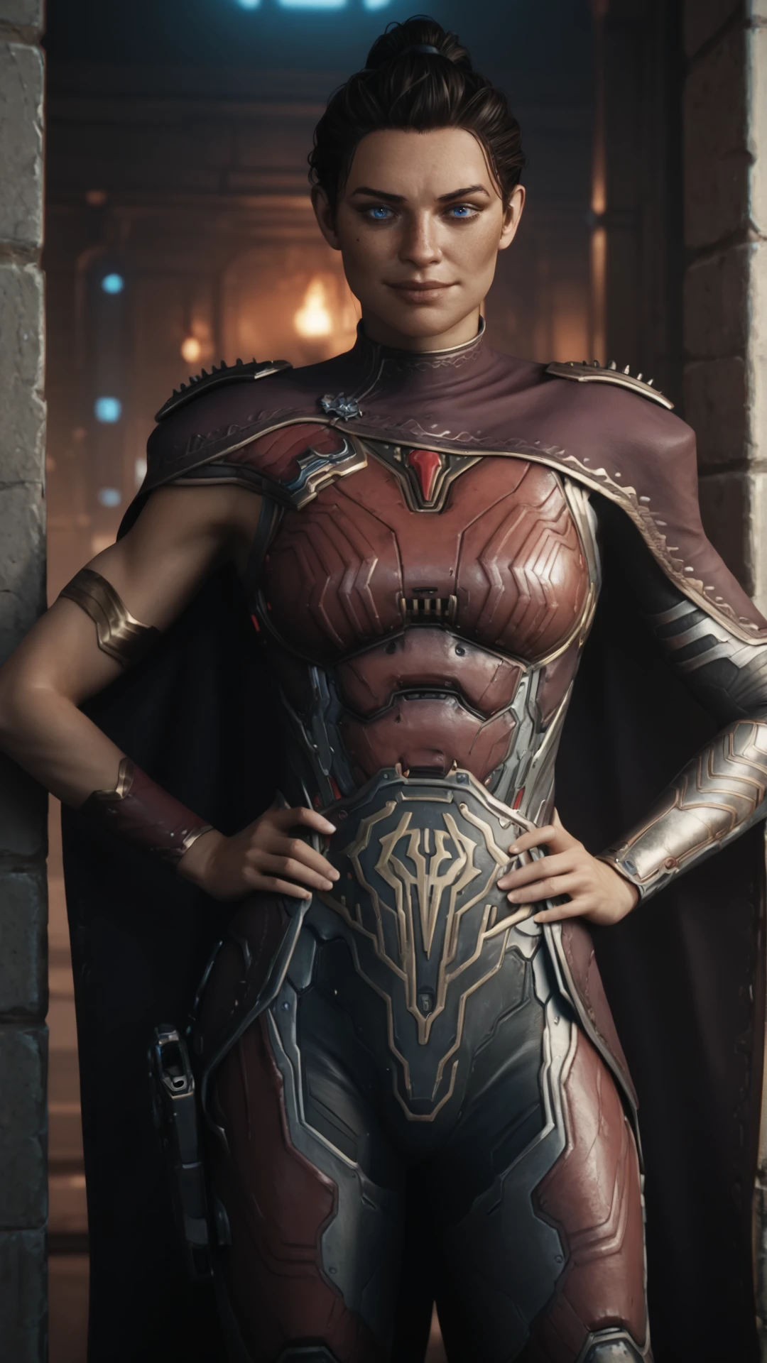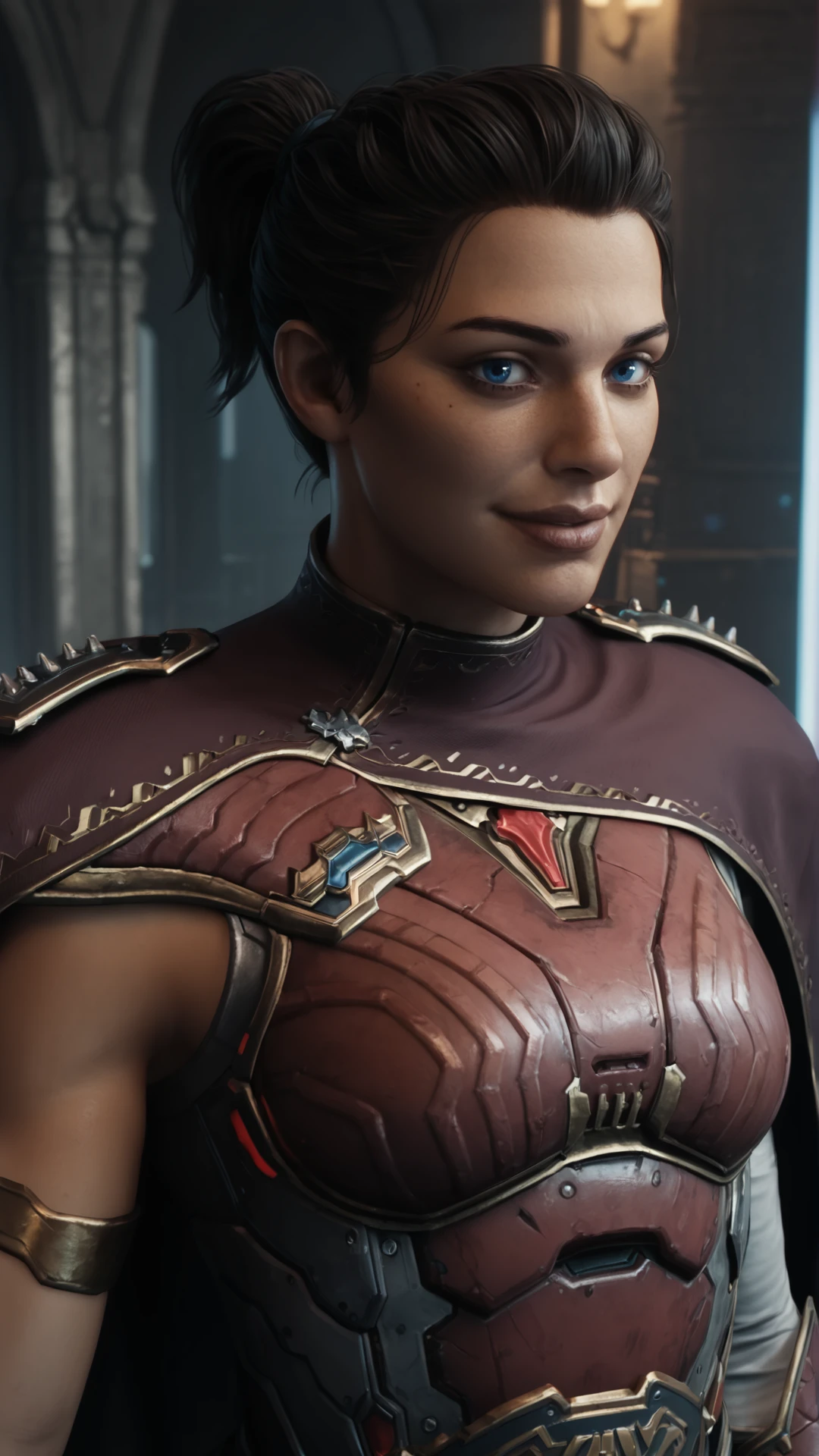 For looks - black hair, short hair, short ponytail, blue eyes, dark-skinned female, lips, (scar on cheek)