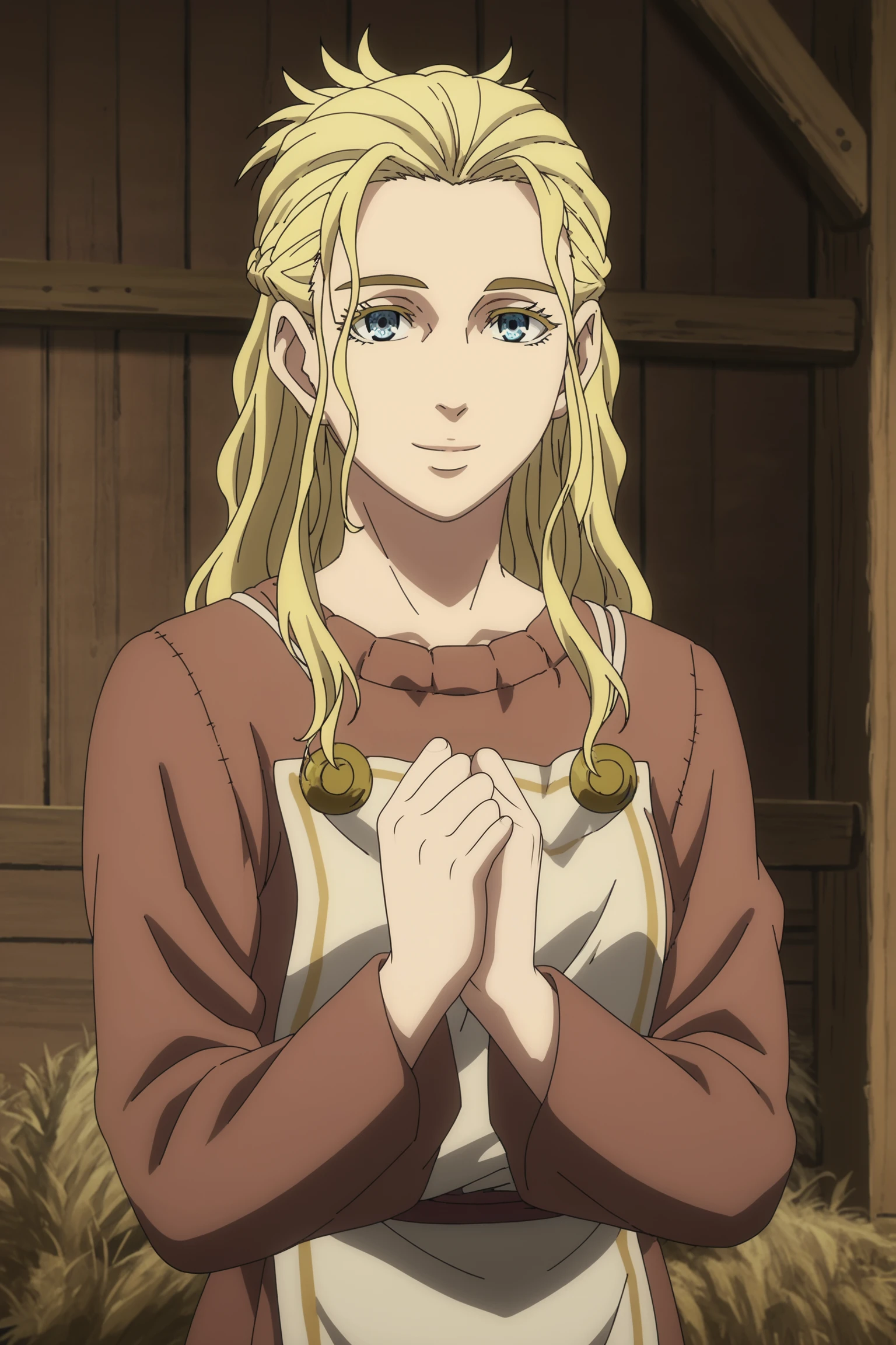 Arnheid slave outfit, long sleeves, blonde hair, blue eyes, long hair, braid, hair up | Hair down | apron | nightgown