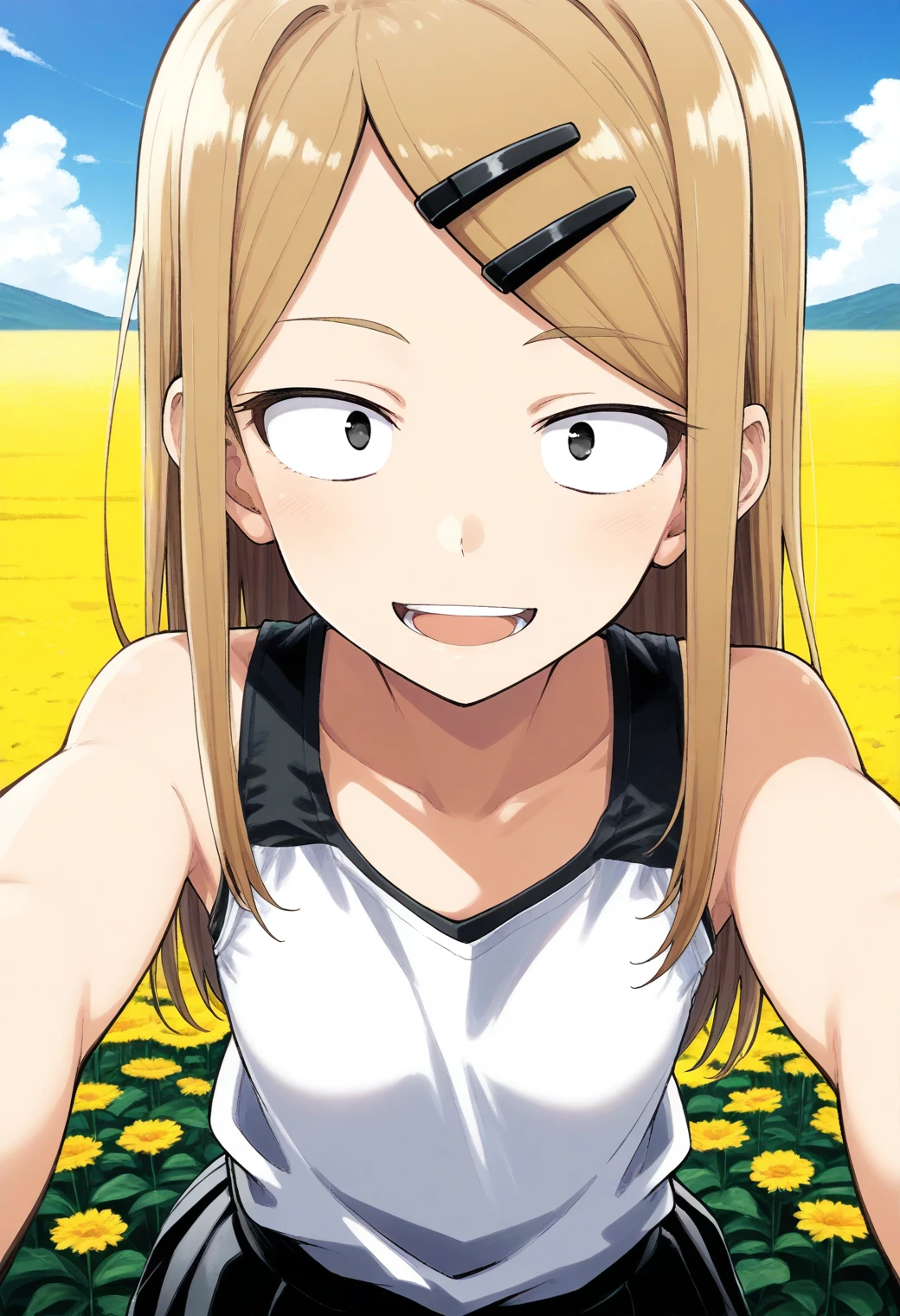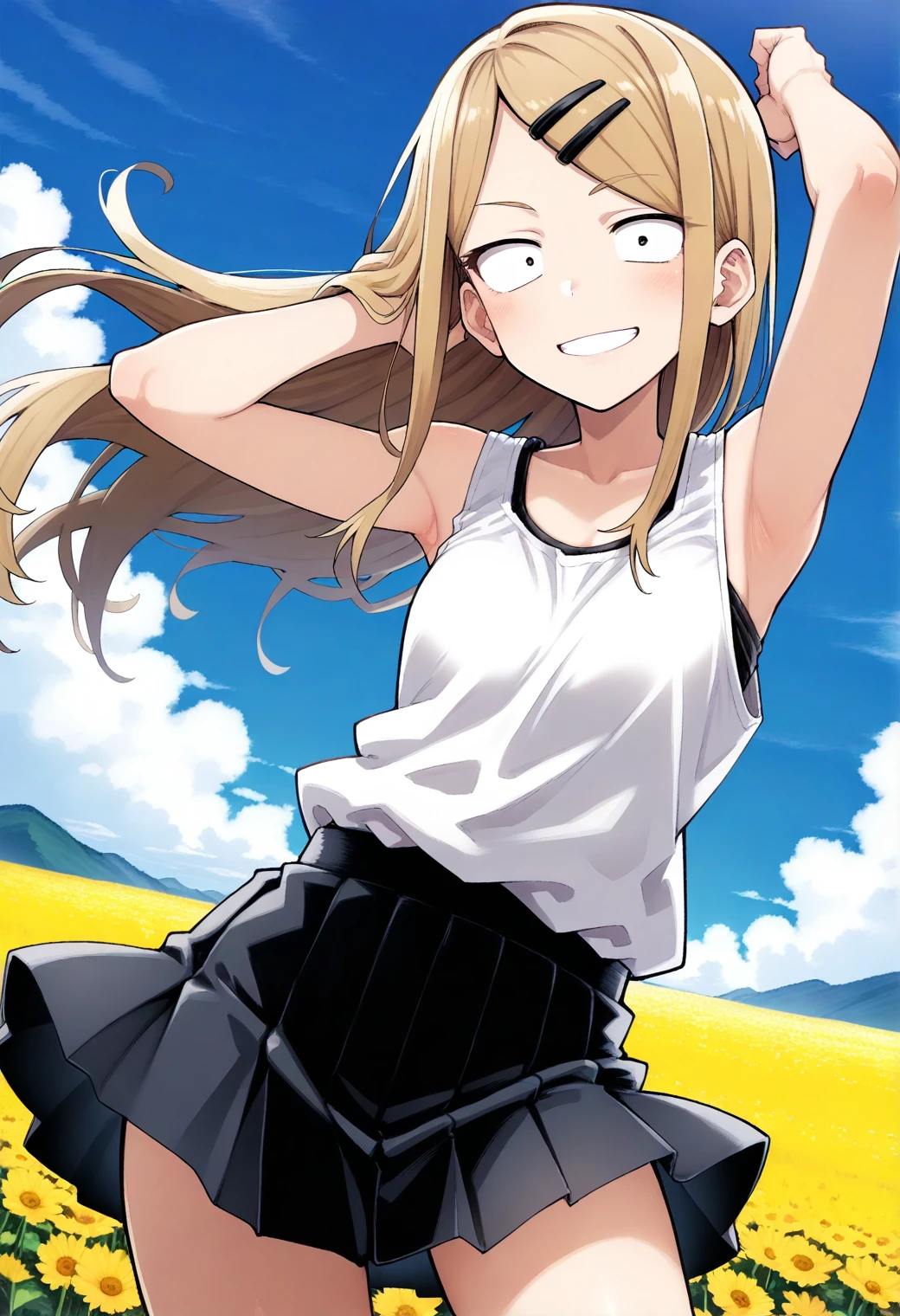 endou_saya, sanpaku, black eyes, blonde hair, long hair, hairclip, white shirt, tank top, pleated skirt,