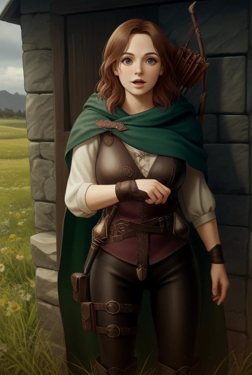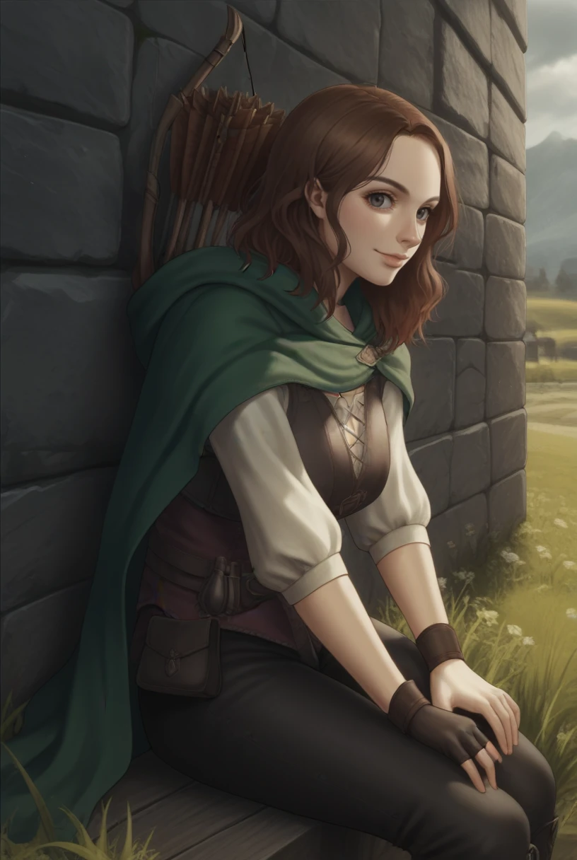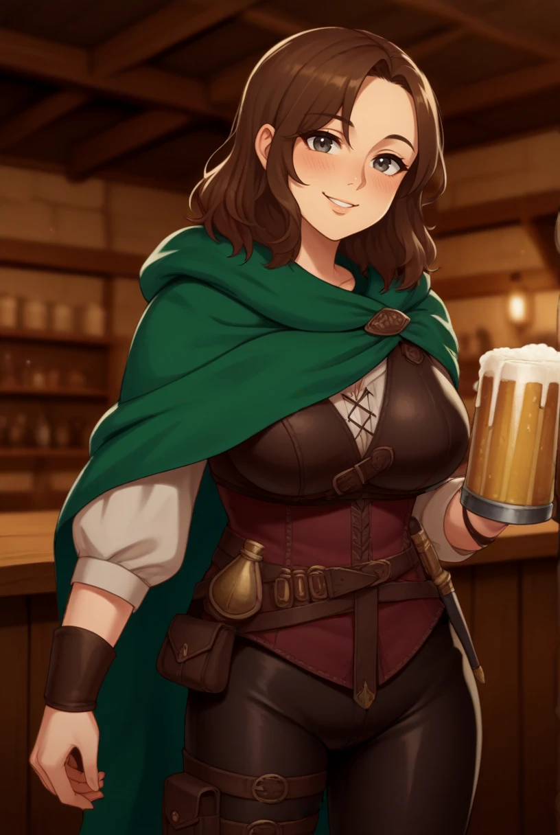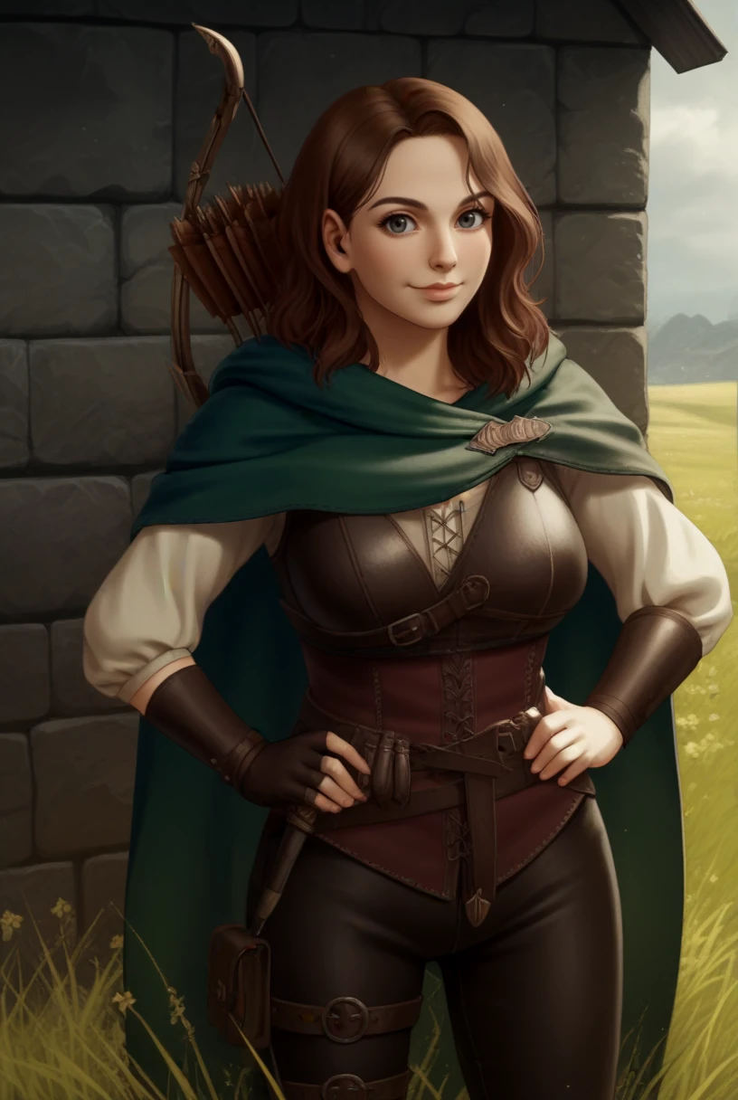 Outfit: ["brown hair, medium hair, grey eyes, green cape, belt, single glove, fingerless glove, bracelet, leather pants, undershirt, pouch, leather boots, leather armor"]
