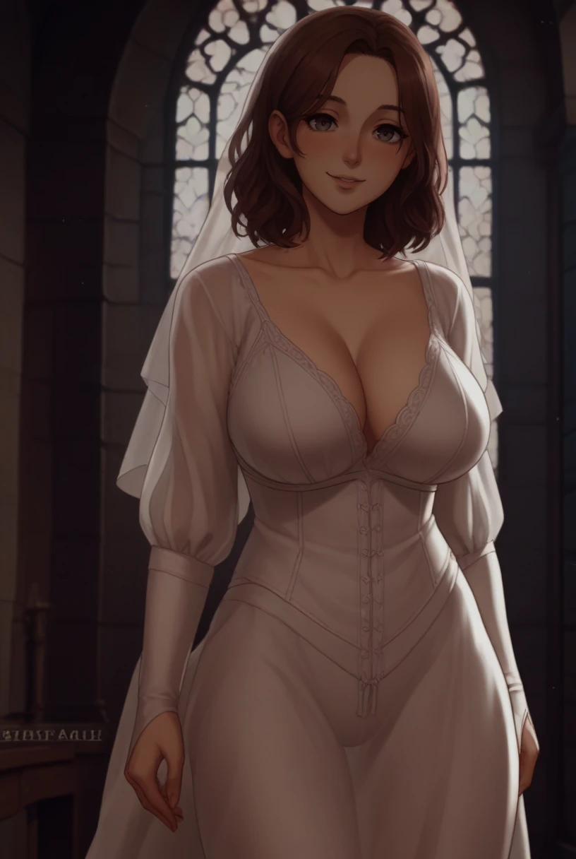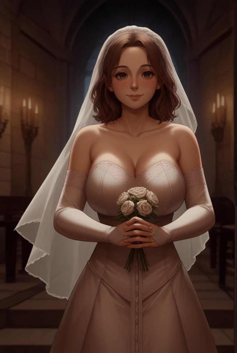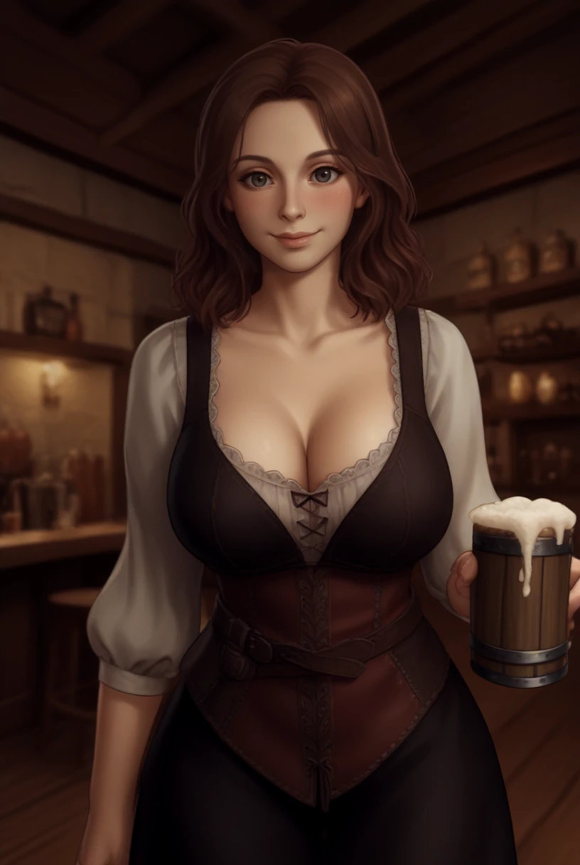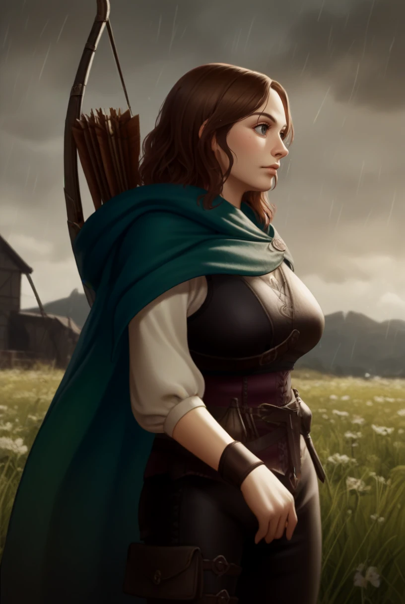 Outfit: ["brown hair, medium hair, grey eyes, green cape, belt, single glove, fingerless glove, bracelet, leather pants, undershirt, pouch, leather boots, leather armor"]