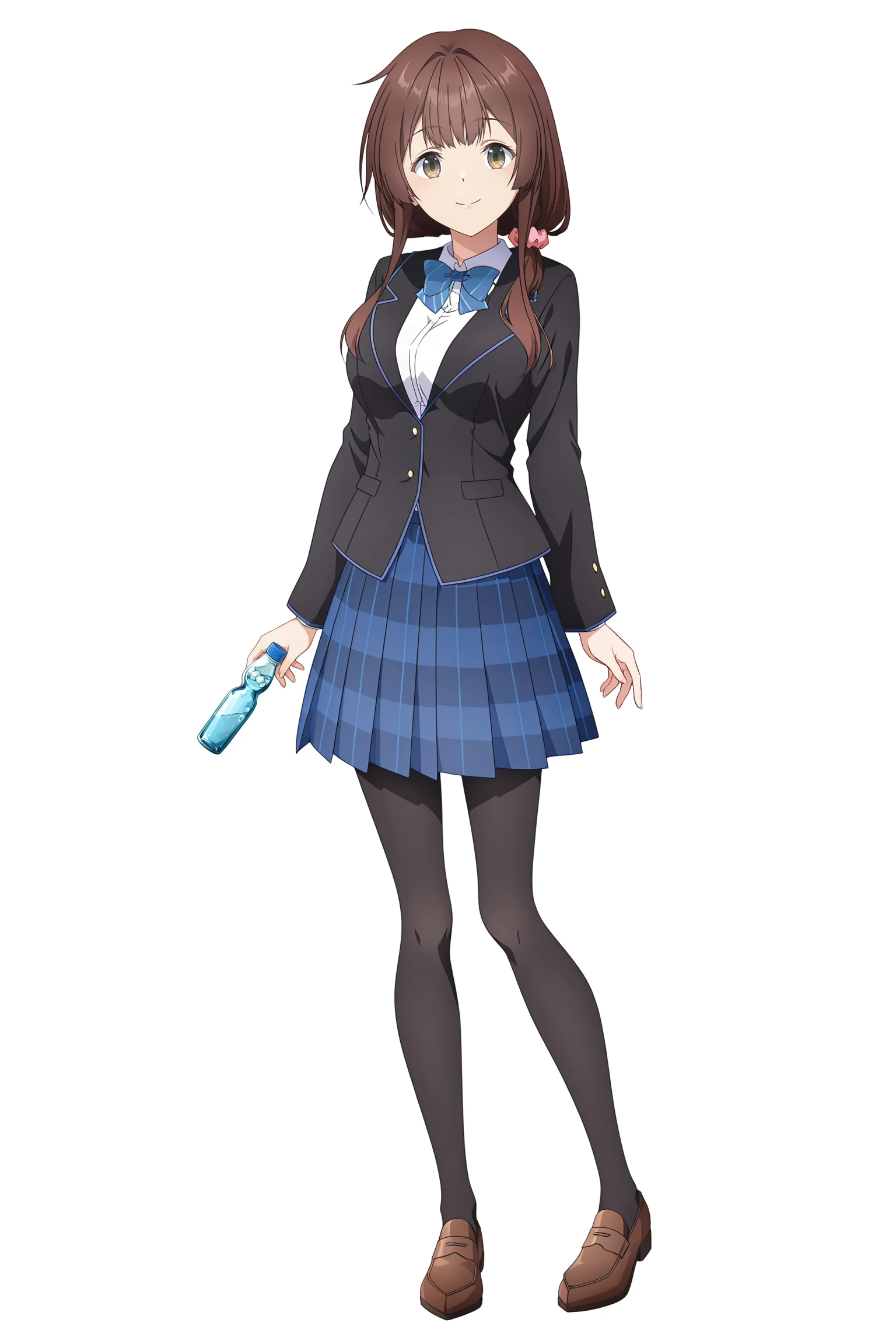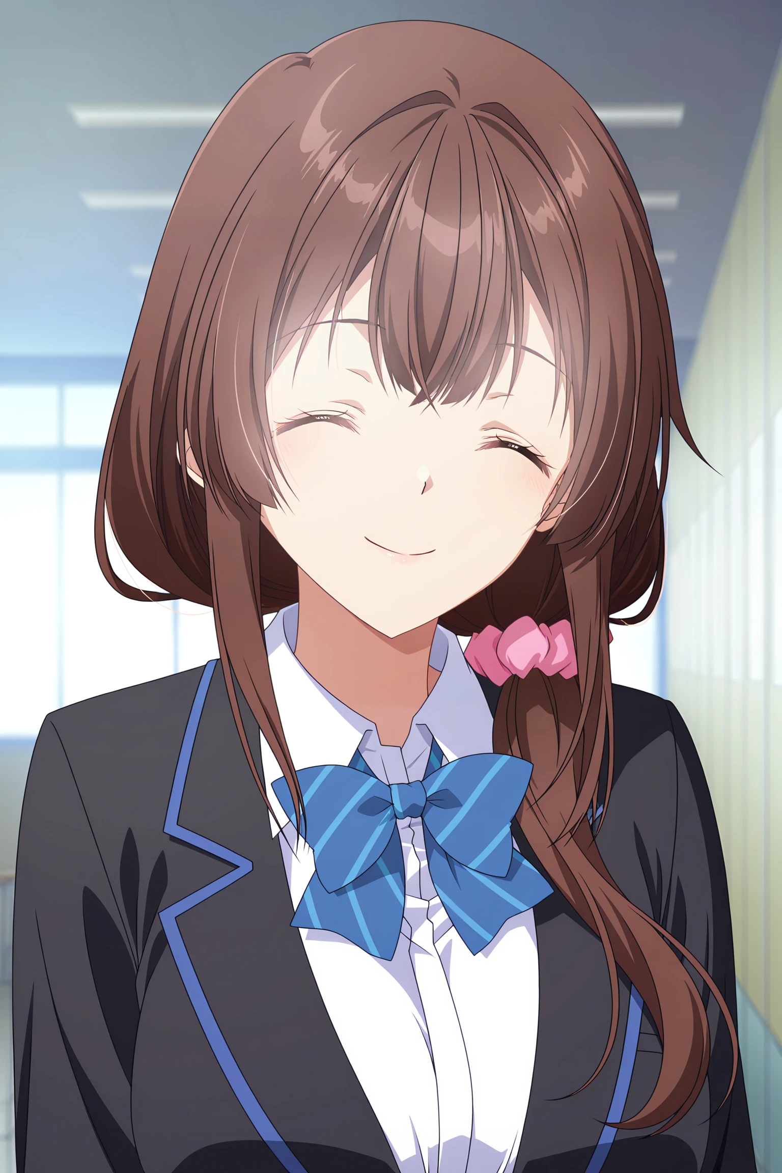 Yua Uchida,pink scrunchie,hair over shoulder,brown hair,