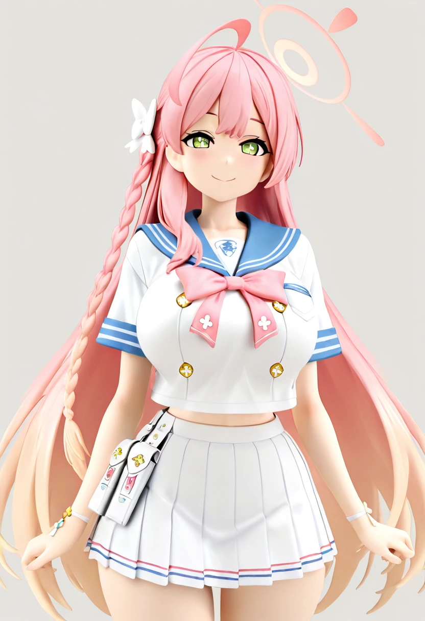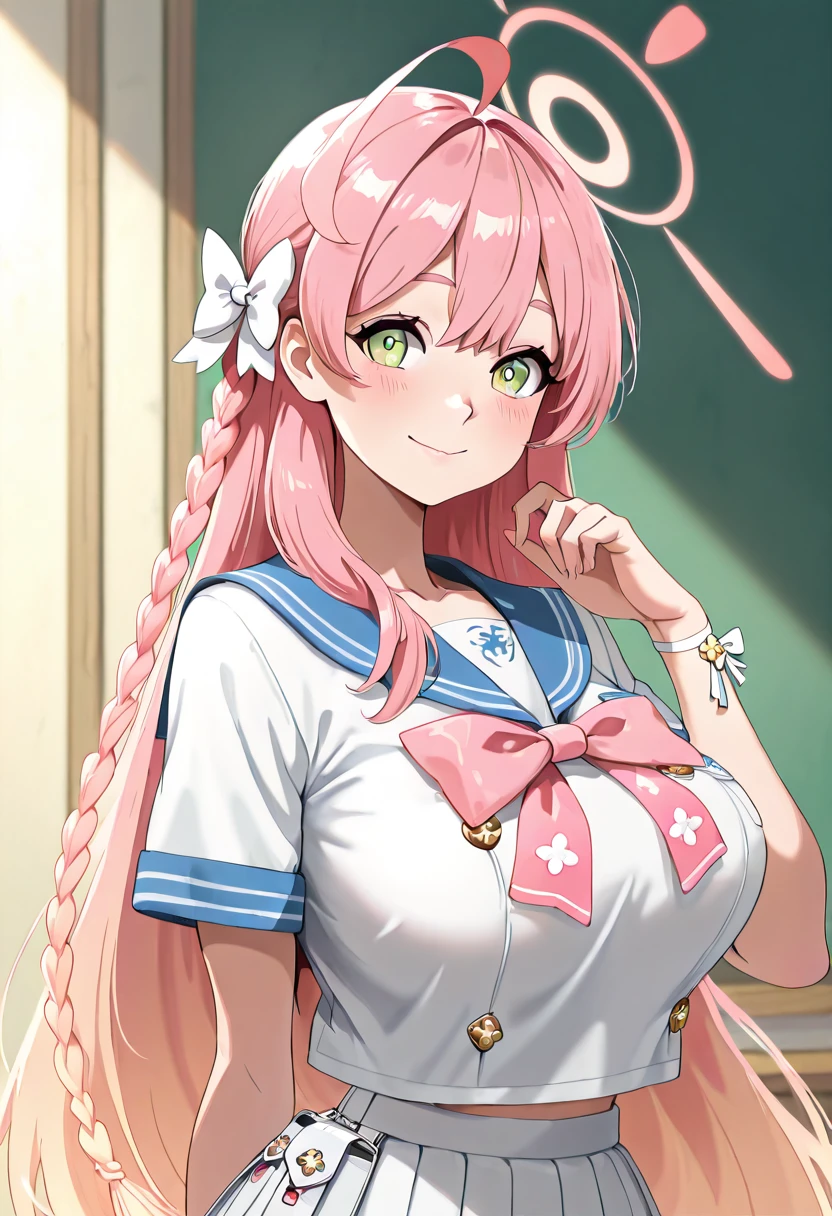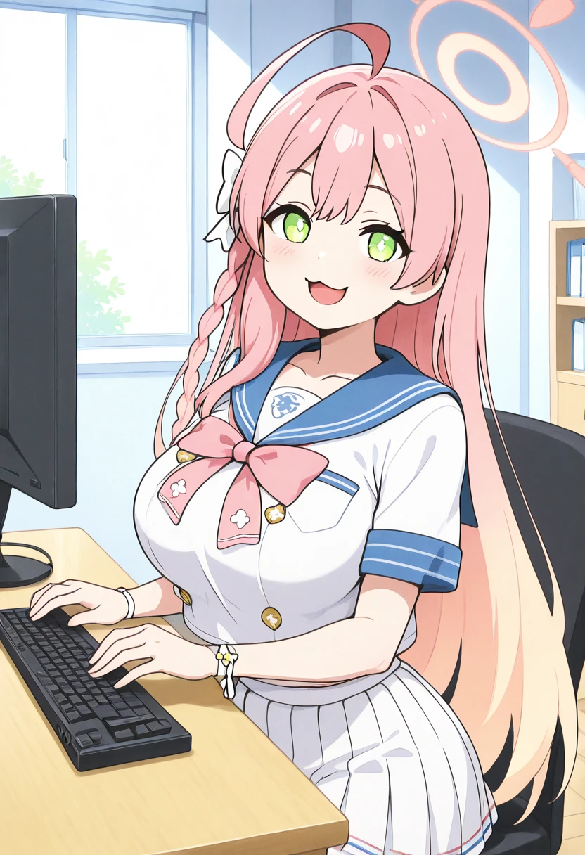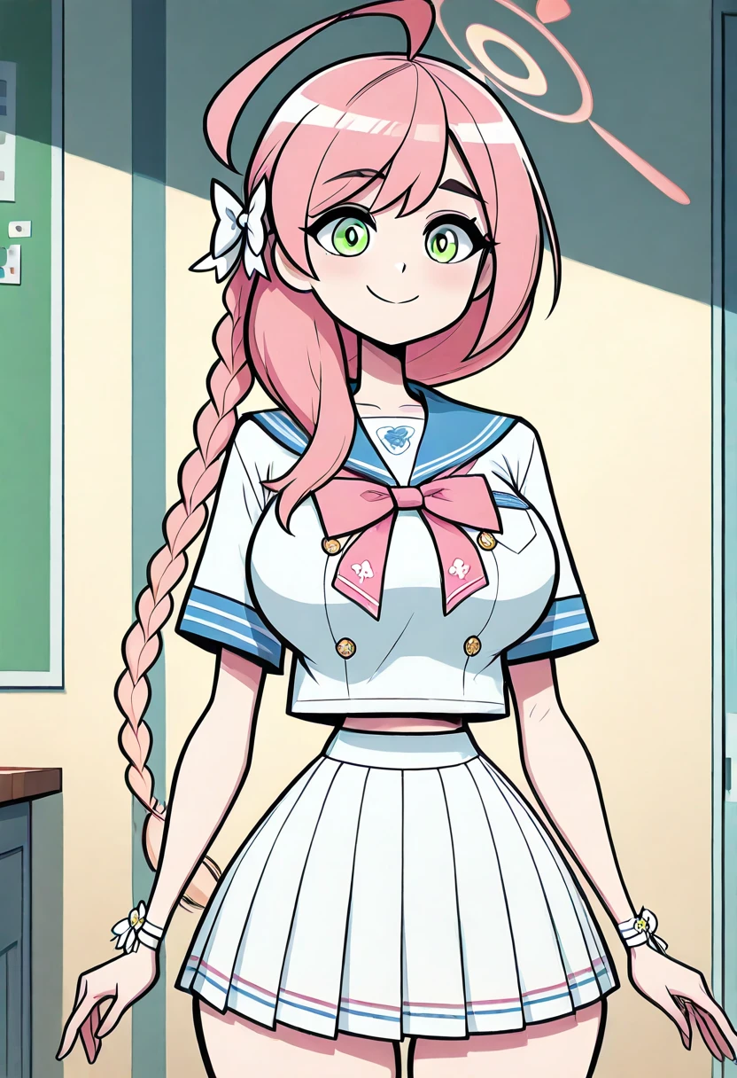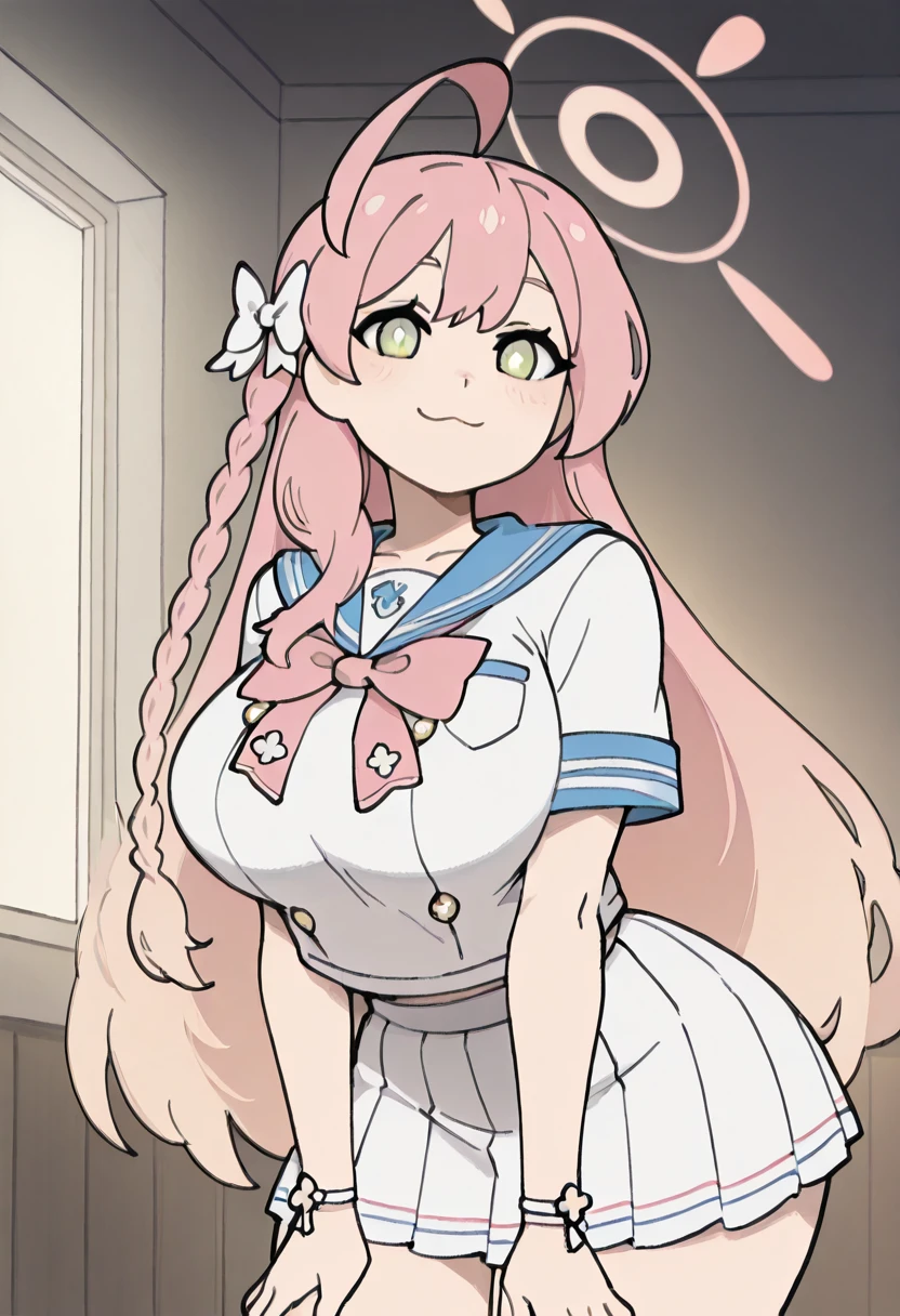 zzHanako, green eyes, pink hair, long hair, ahoge, single braid, hair bow, large breasts, school uniform, blue sailor collar, pink bowtie, sailor shirt, white shirt, short sleeves, wristband, pleated skirt, white skirt,