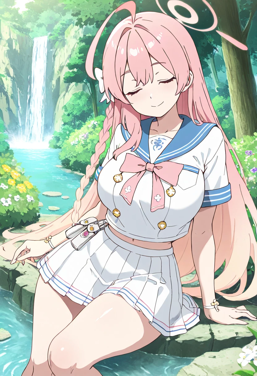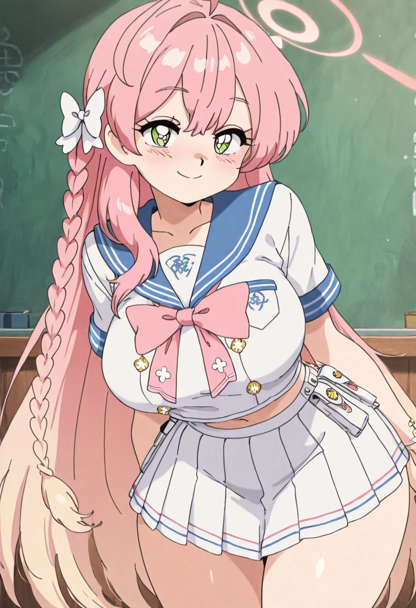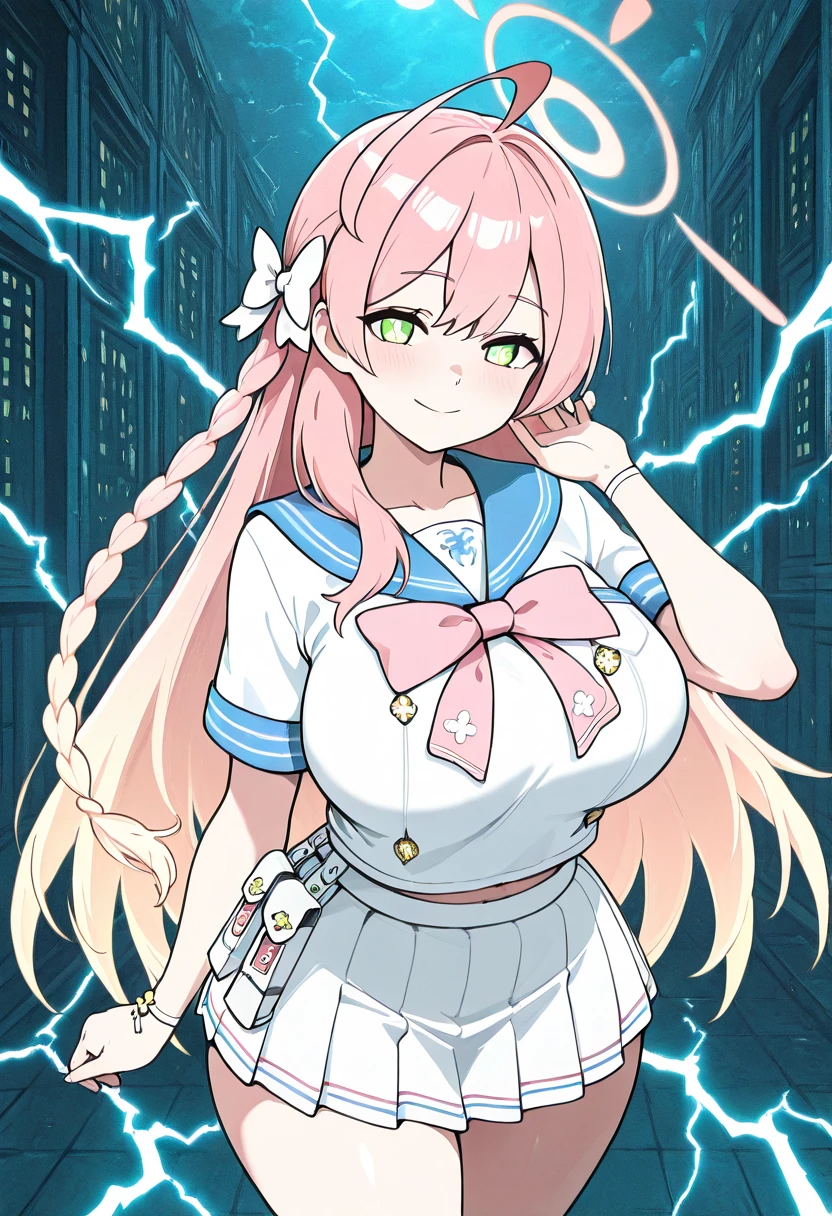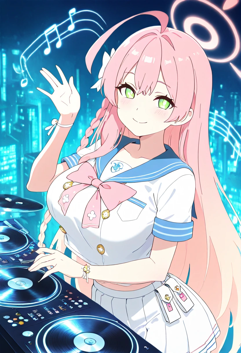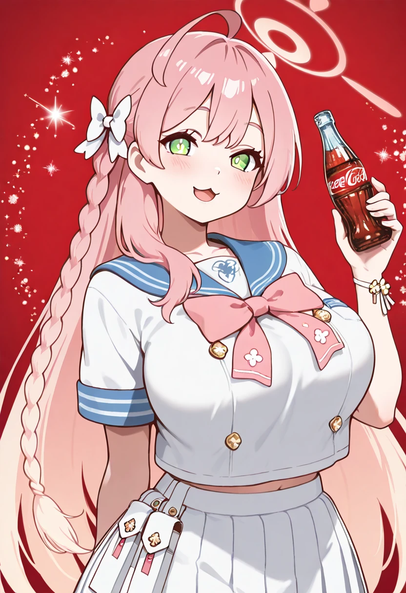 zzHanako, green eyes, pink hair, long hair, ahoge, single braid, hair bow, large breasts, school uniform, blue sailor collar, pink bowtie, sailor shirt, white shirt, short sleeves, wristband, pleated skirt, white skirt,