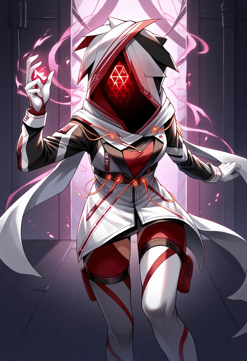 altKasane, hood up, covered face, mask, white jacket, white cape, red shirt, long sleeves, white gloves, cables, red leggings, thigh cutout, boots