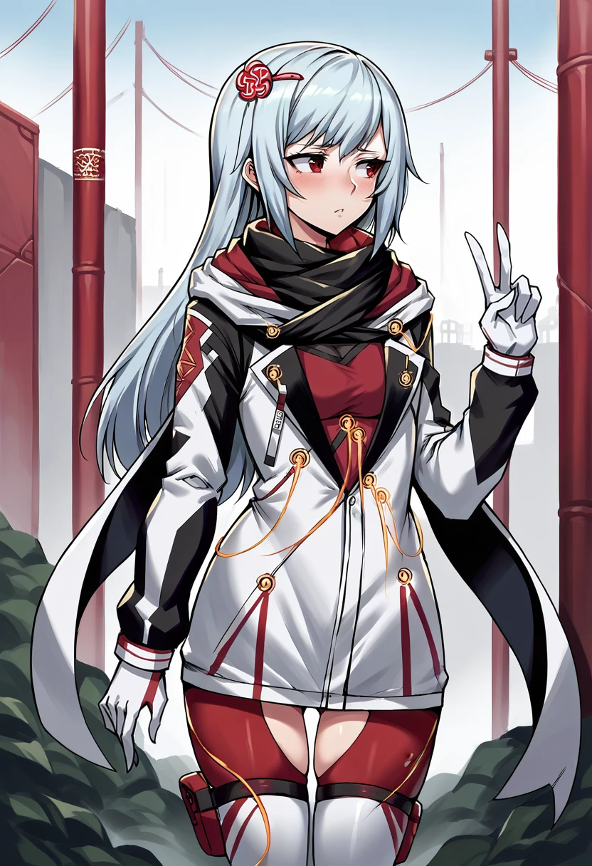 altKasane, long hair, hair ornament, white jacket, black scarf, white cape, red shirt, long sleeves, white gloves, cables, red leggings, thigh cutout, boots